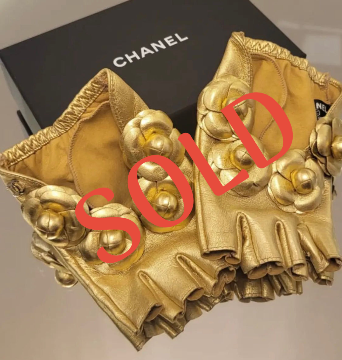 Chanel 2020 Gold Camellia Appliqué Fingerless Gloves, new in box. Size 8
