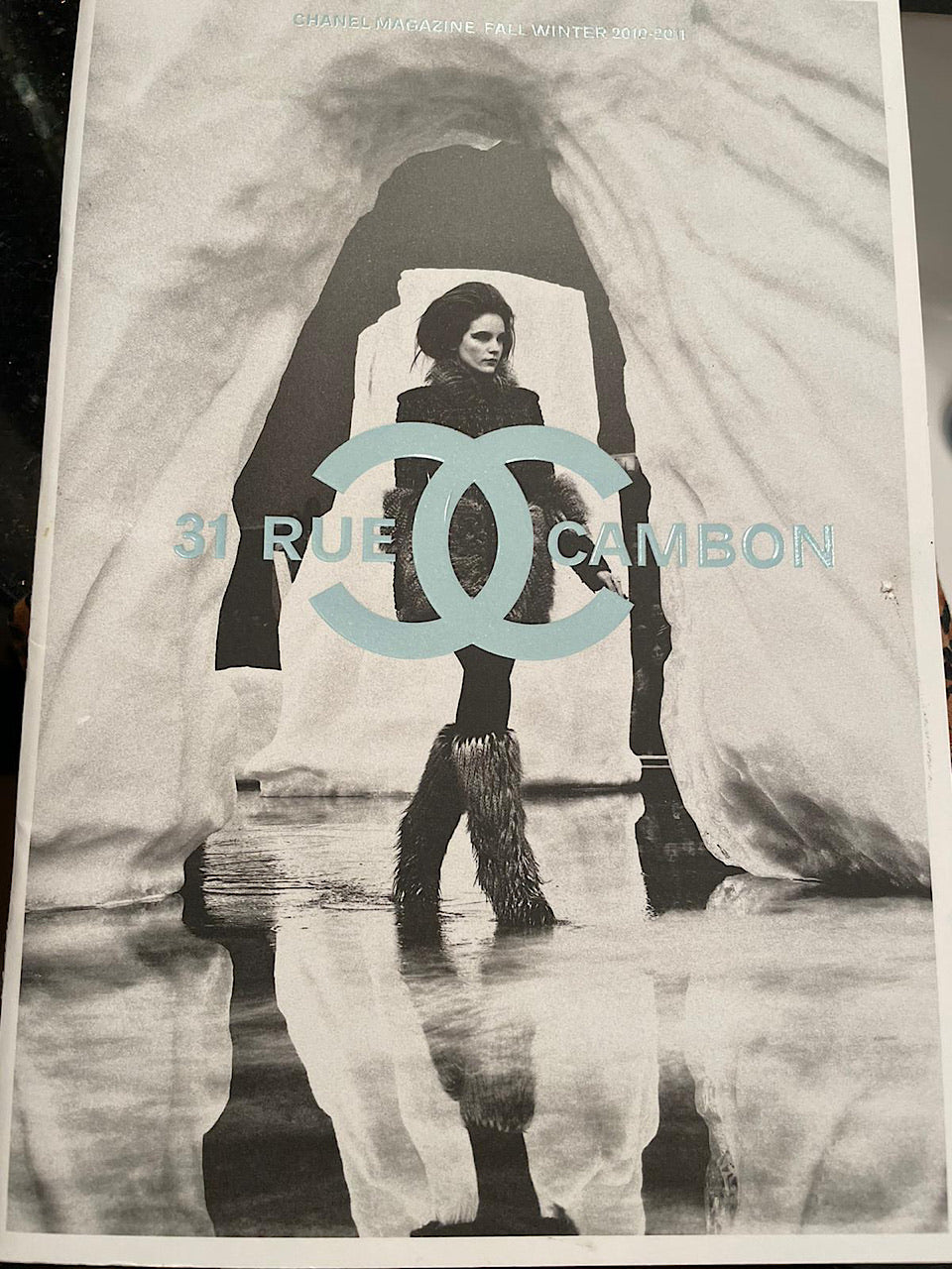 Chanel 3 Rue Cambon 2010-2011 Fall Winter chanel Magazine/catalogue. 8x11 1/2" heavy paper cover with a mirror like finish, 46 pages if glossy photographs of Chanel fashions, from both the US Runways and the Paris-Shanghai collections- pages of watches, jewelry, and fashions. In addition, there is an article, "All About Coco" another on "Couture Chanel "- The indide is perfect/the outside is Almost Perfect! It has a 1/16 of an inch tear on the front, and a spot on the back as well.