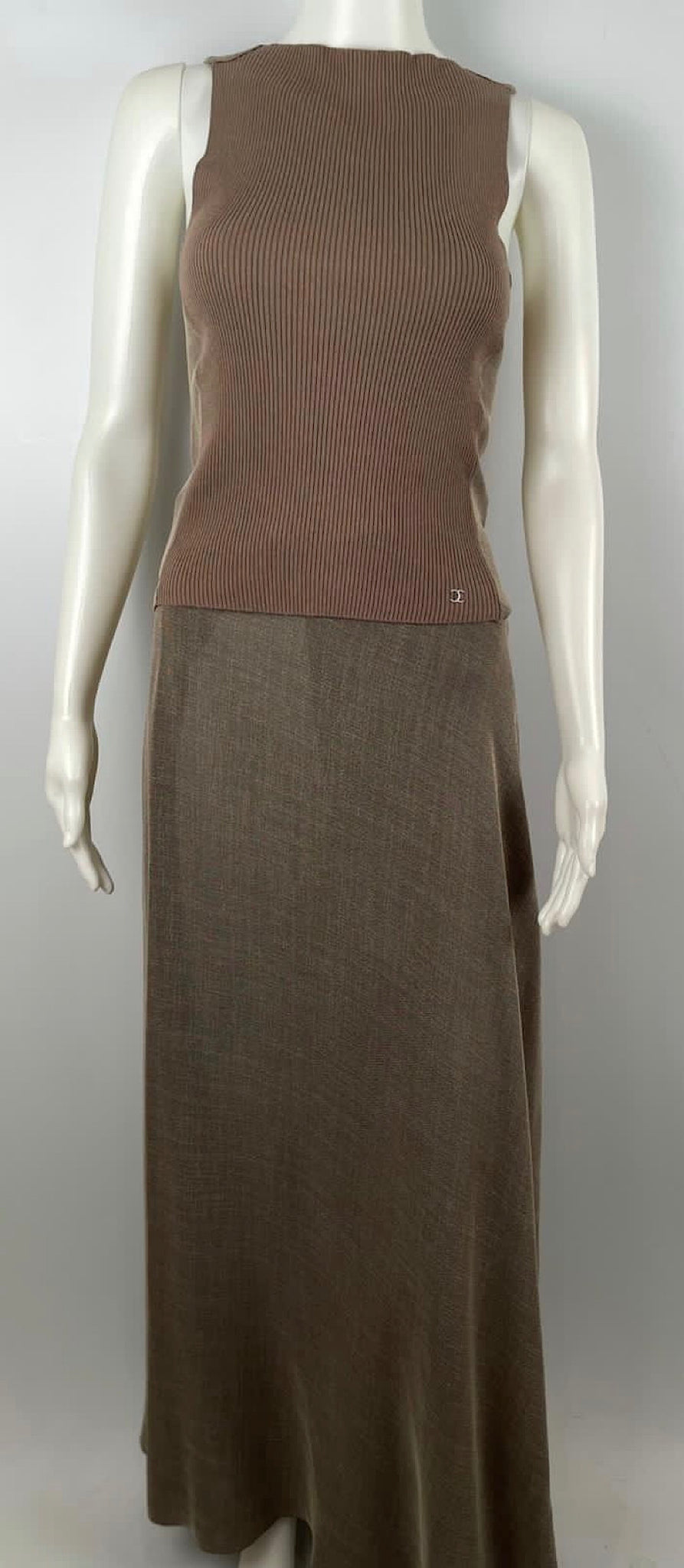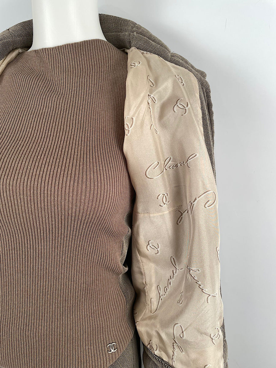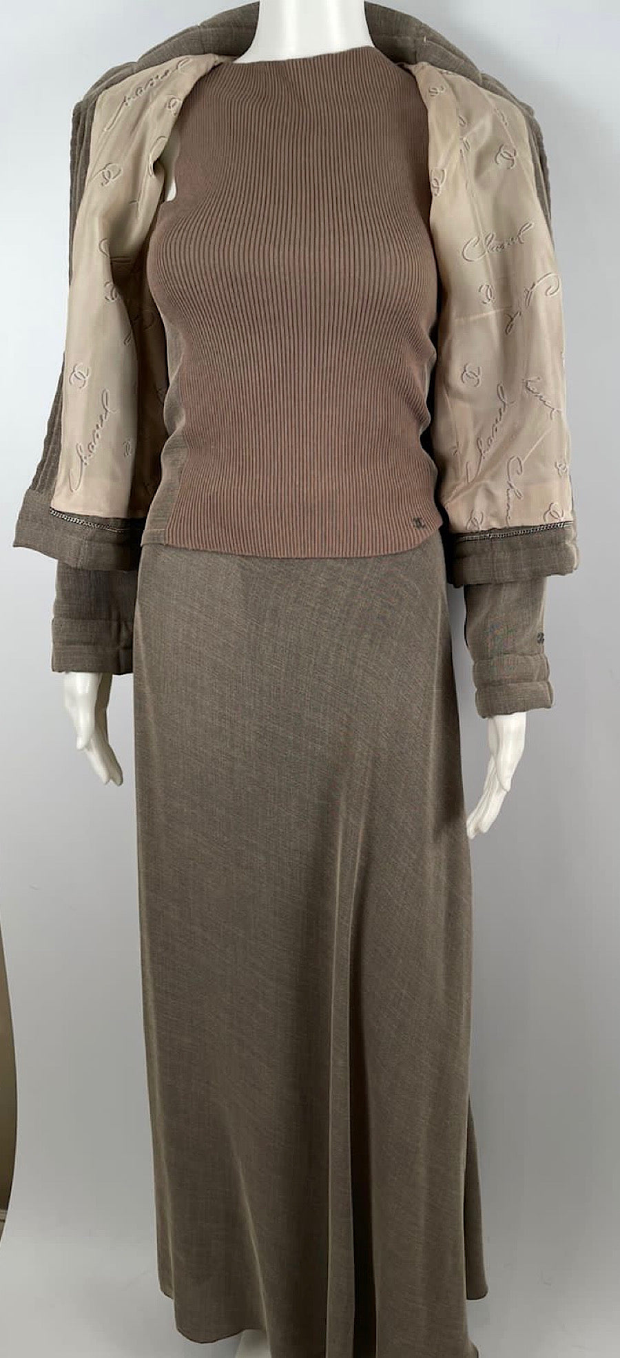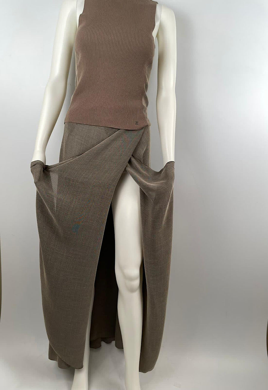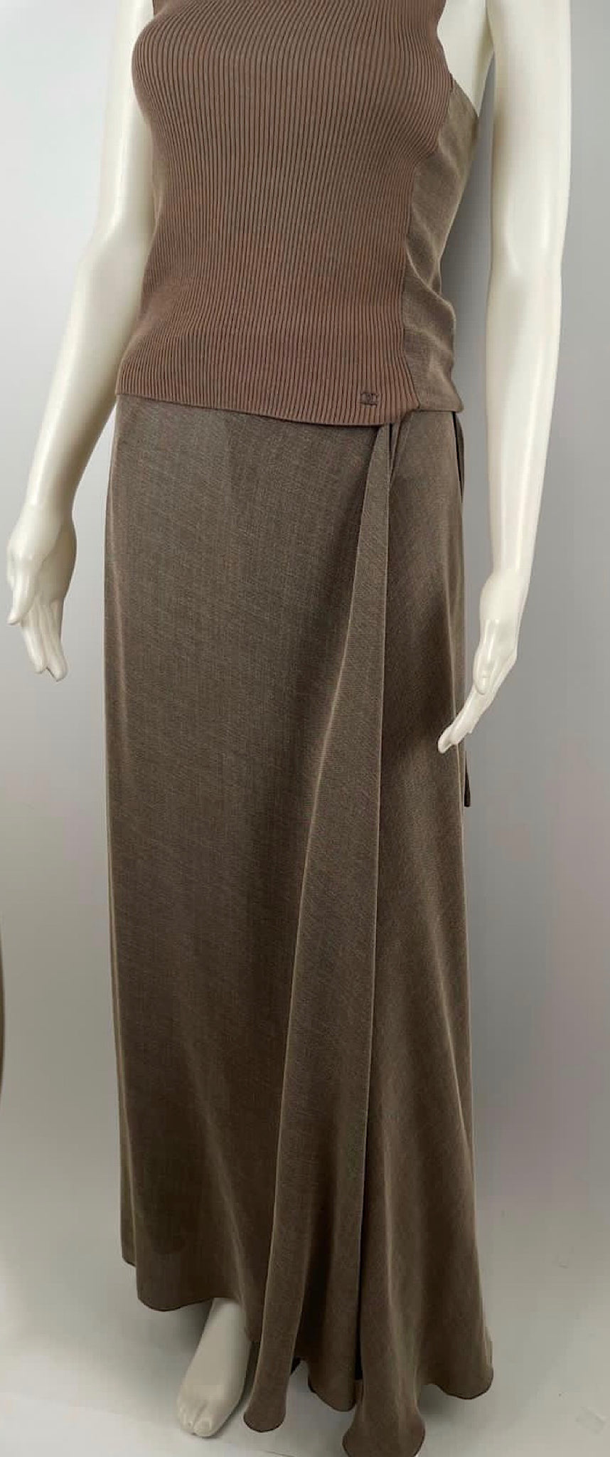 Vintage Chanel brown 4 piece dress outfit from Chanel's 99P, 1999 Spring collection. This outfit consists of a jacket, top, and 2 wrap around skirts.