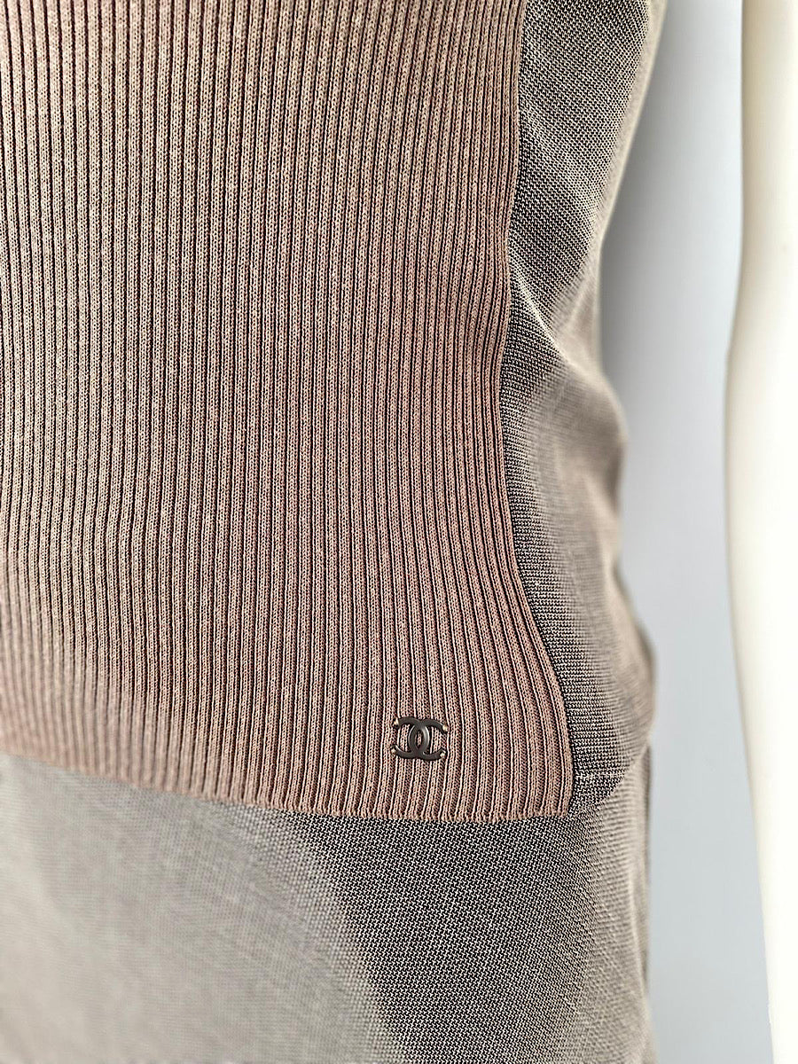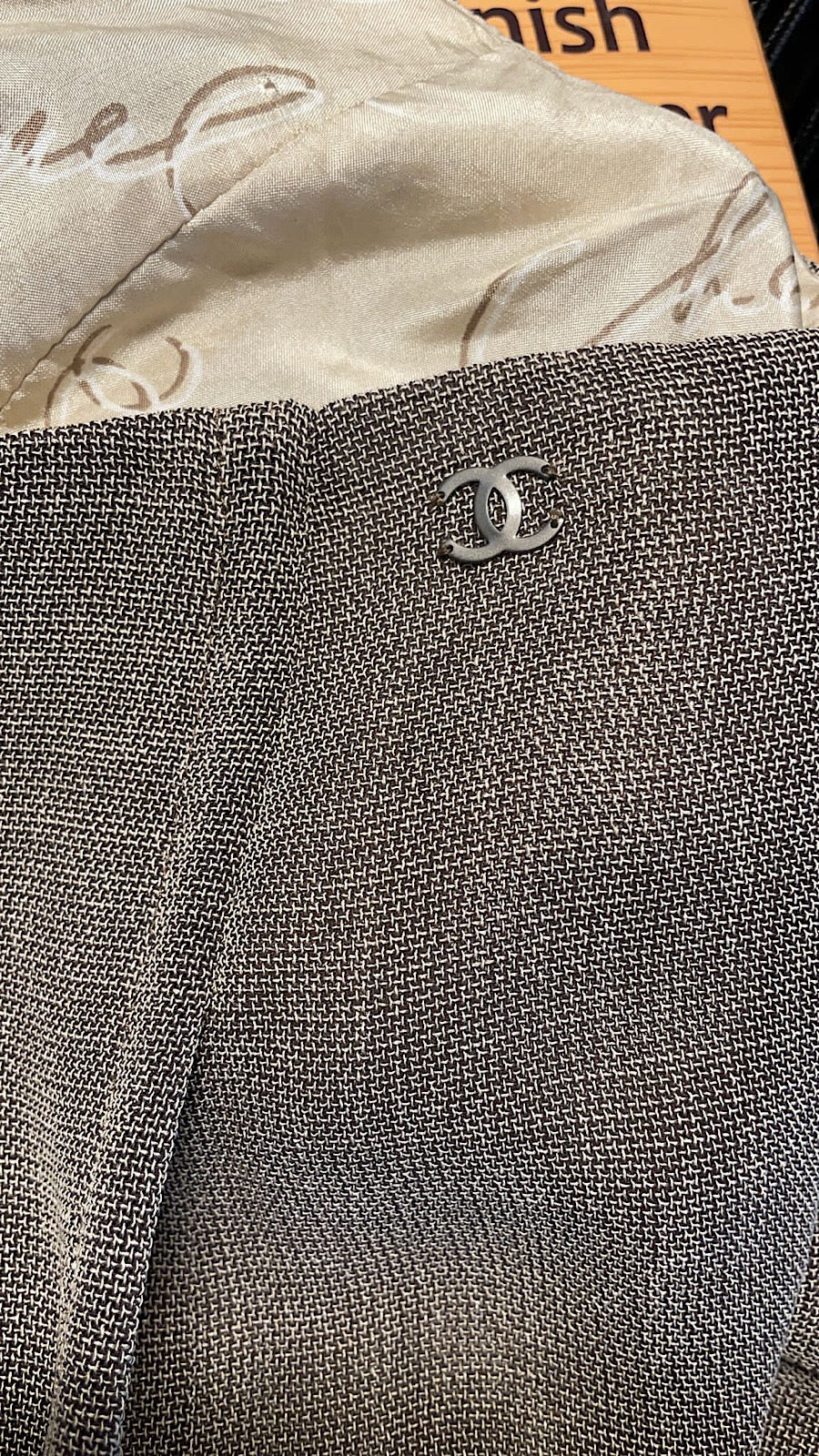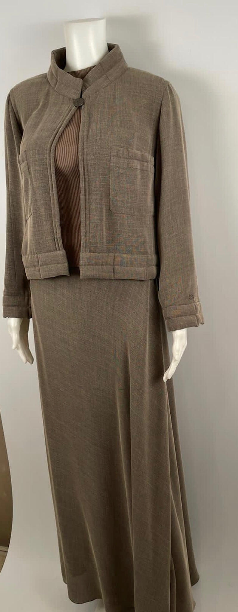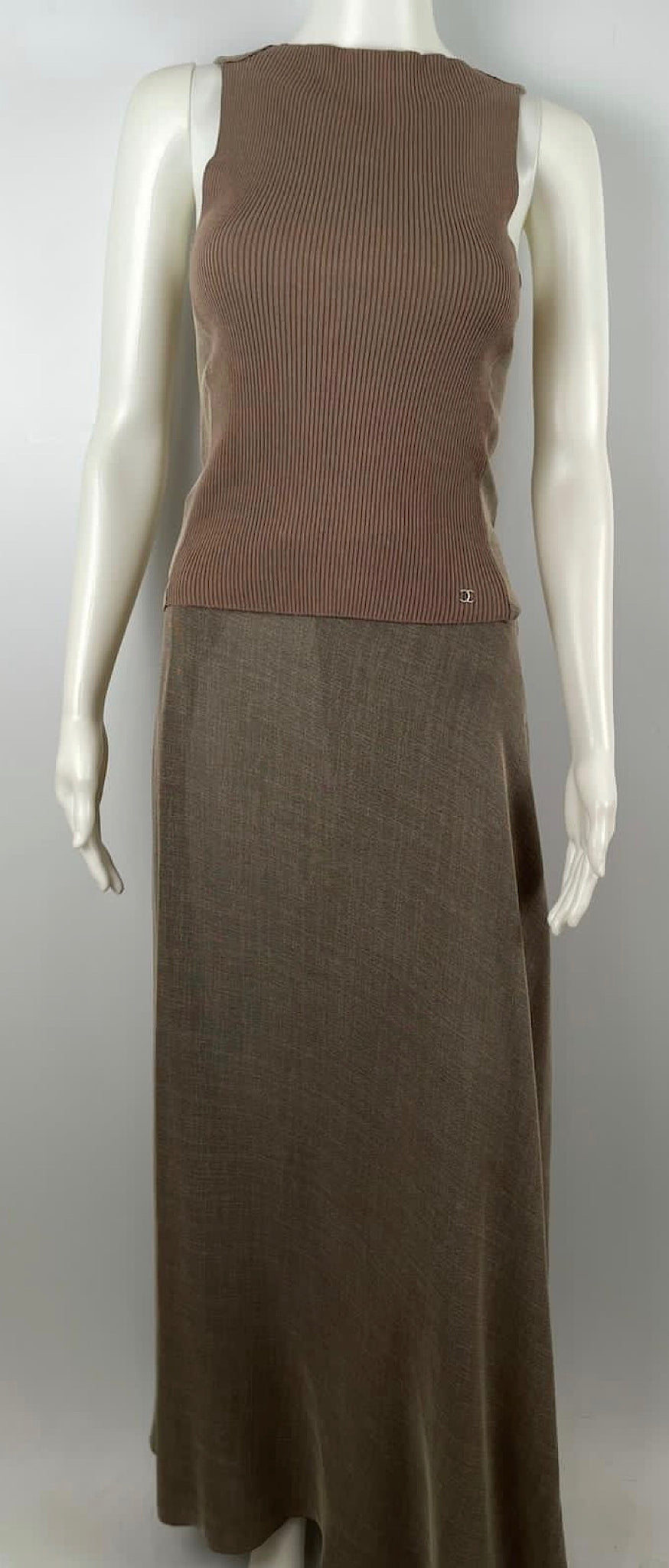 Vintage Chanel brown 4 piece dress outfit from Chanel's 99P, 1999 Spring collection. This outfit consists of a jacket, top, and 2 wrap around skirts.
