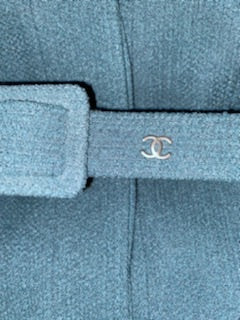 Jacket is lined, has the famous Chanel around the bottom to make sure it hangs evenly. Metal "CC" logo on the belt and has no holes, so it can be worn on any size waist up to 30". There are 5 green buttons which say "Chanel, Paris" and do not show when the jacket is closed.