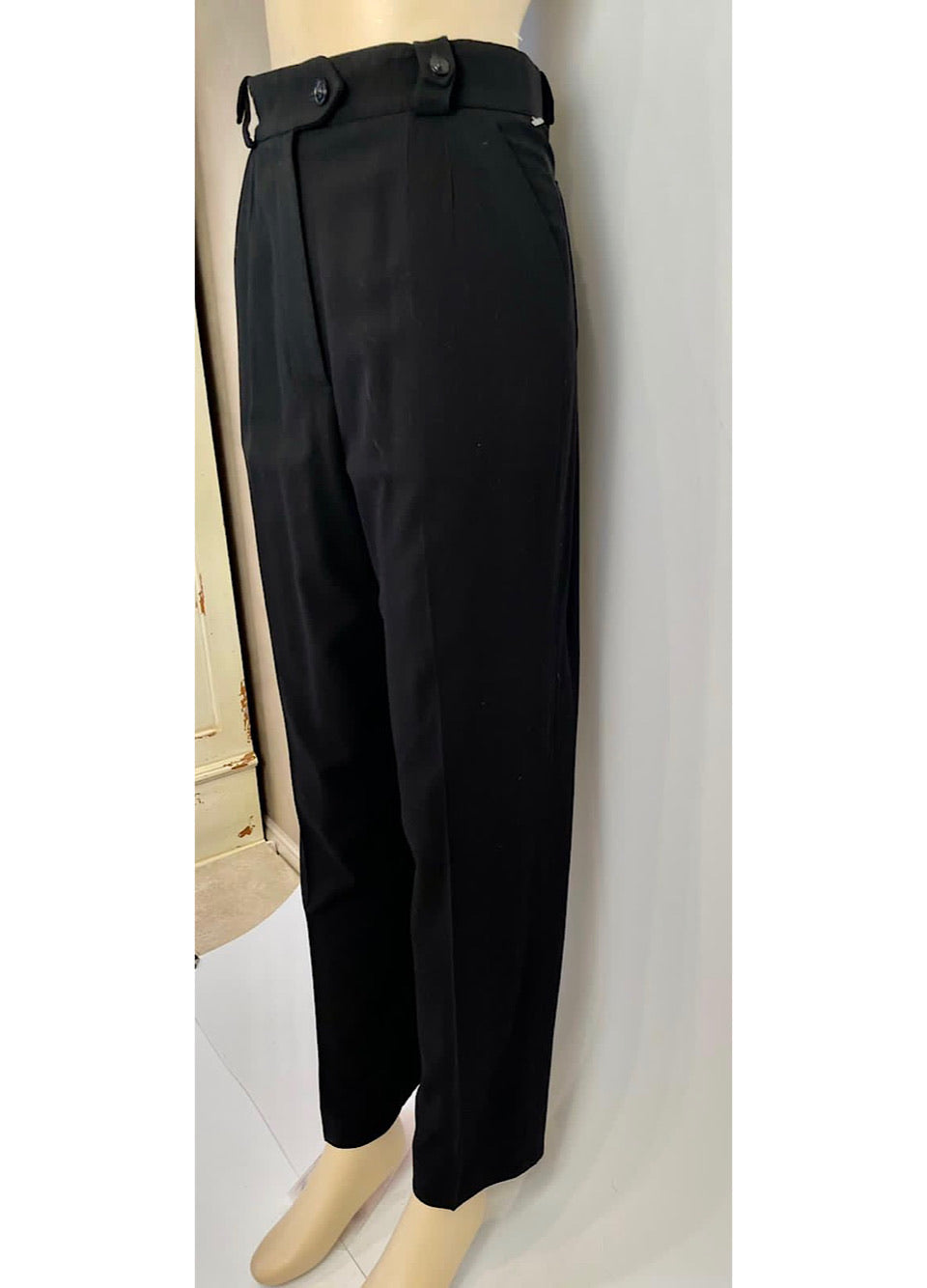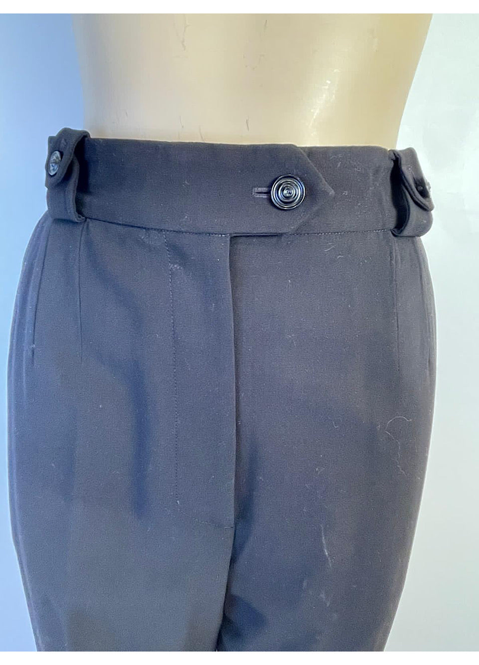 This pair of Chanel Pants are wool but look and feel and drape like a nylon blend. Fly front, 2 hidden pockets in front, 2 patch pockets in the back, 1.5" waistband has 4 belt loops that fold over your belt, and then the button closes with a black button with a small "CC" logo which matches the closure button at the waist. The legs are creased all the way down the front, starting at the waist, which gives a little extra fullness in the front.