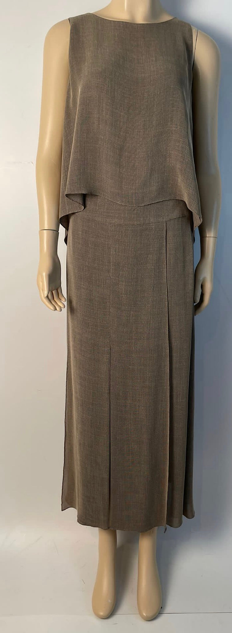 This Vintage 99P, 1999 Spring Chanel brown dress outfit with long skirt and matching top is for hot weather, unlined, and a casual fit. The sleeveless top fastens on the back with 3 Chanel gunmetal buttons, the bottom 13" hangs slightly open in the back. Rarely does it ever wrinkle.