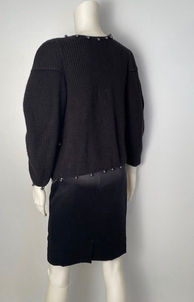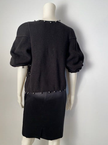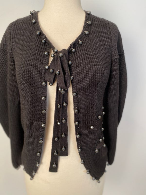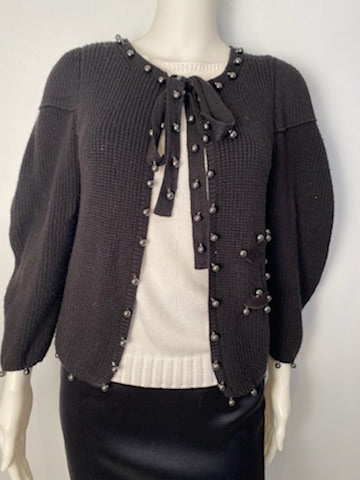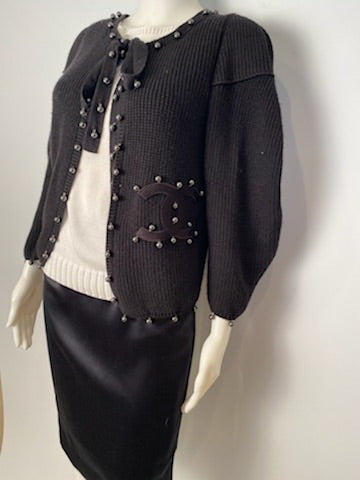 Chanel 09P, 2009 Spring very heavy woven silk yarn cardigan embellished with Dozens of shiny silver gray pearls. Features a huge 4" X 5" "CC" appliqué logo. There are 2 soft fabric ties at the neck which are 25" long and embellished with a dozen pearls each, to create several different looks. The sleeves are very full and can be worn several ways as well.