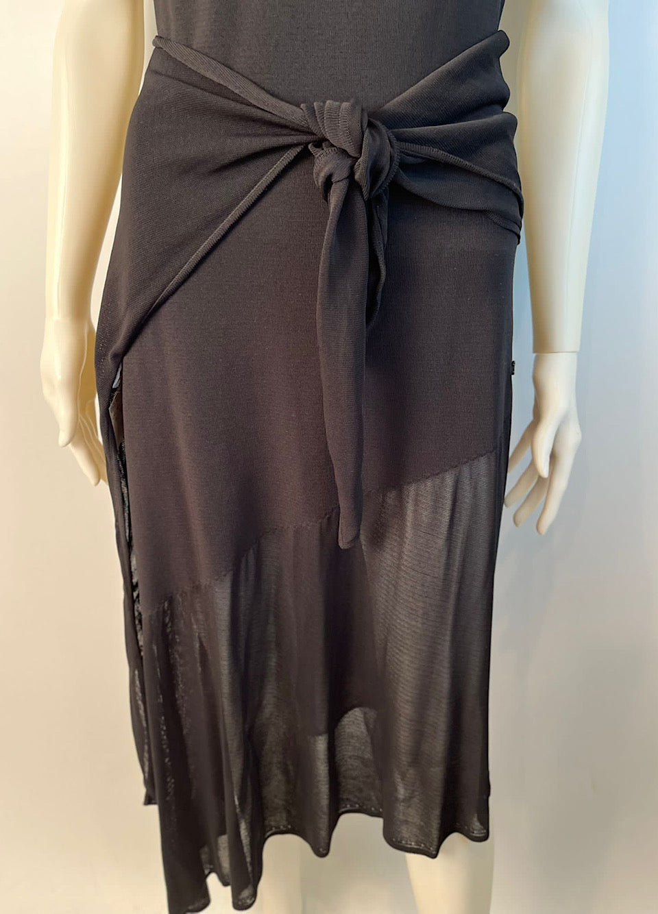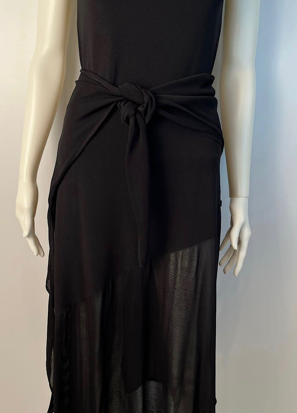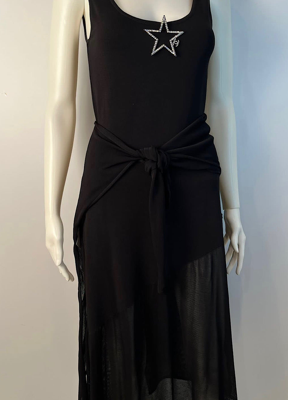 Chanel 02C 2002 Cruise Resort Collection stretchy sophisticated black dress with matching 4 pronged removable scarf with a angled hem line.