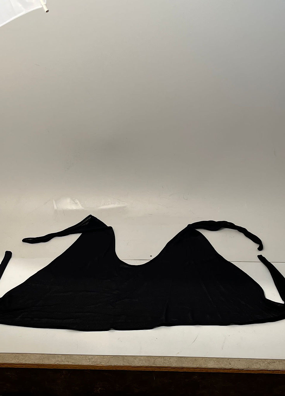 The fabric is a double thickness until it reaches from neck to below the hips. From there it is half the thickness. Set on an angle, and flows to the angled bottom . There is a "CC" logo encrusted with black crystals on the hip.