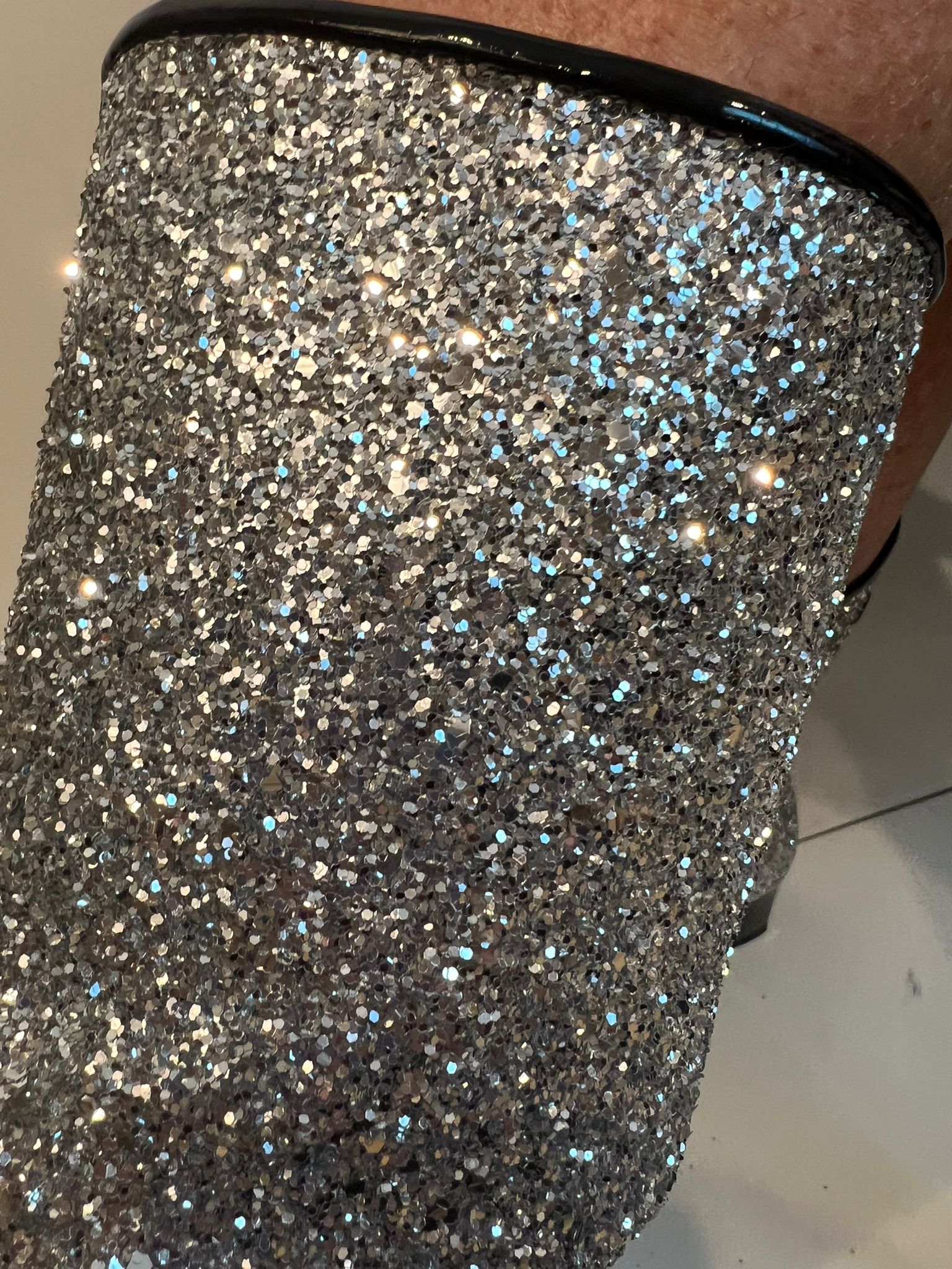 Mid calf height, block heel, square toe, trim around the top in black patent leather. Each boot has a black "CC" logo near the top. These boots are barely worn-patent leather with no scratches, body of the boot-no missing sequins or glitter, each boot has slight wrinkle but overall they are fun and flashy!