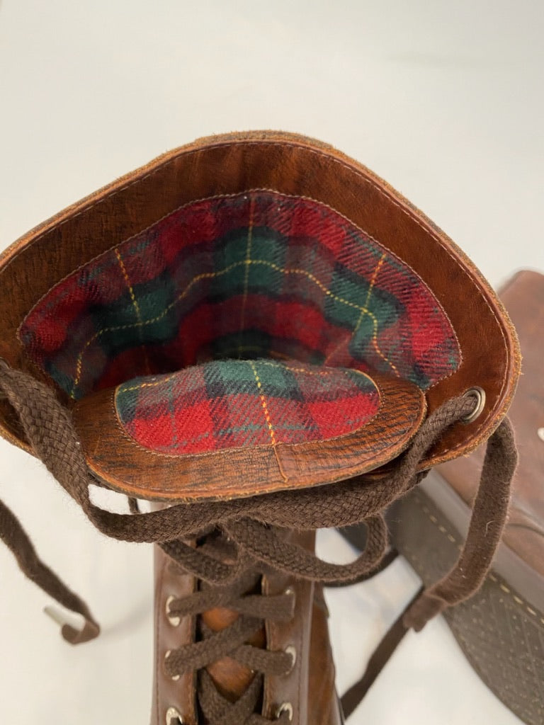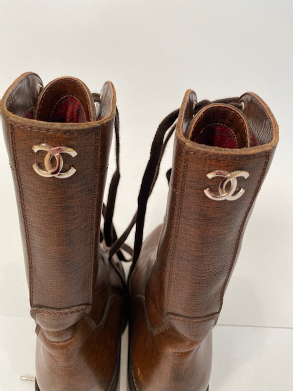 Chanel 13A, 2013 Fall Paris Edinburgh brown leather lace up engineer boots. Lined with plaid flannel fabric. These lace up through 11 sets of silver grommets. The color is a mix of brown and some subtle black. Metal "CC" logo on the back of each boot. Heavy soles with rubber logo on the bottom and on the heel reinforcements.