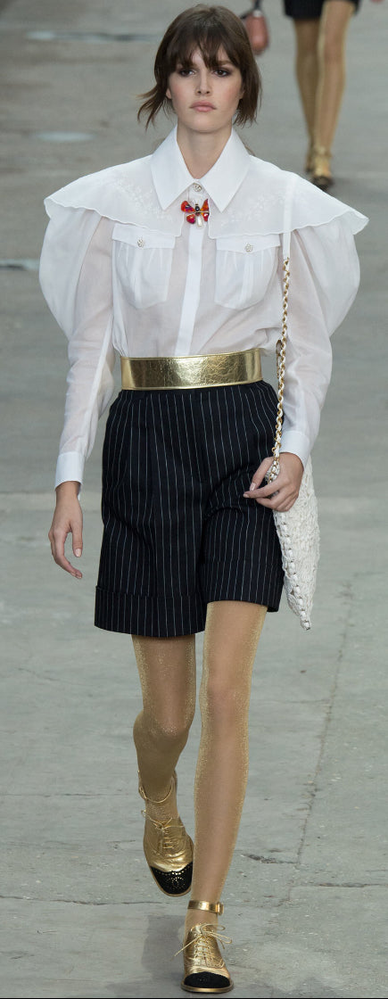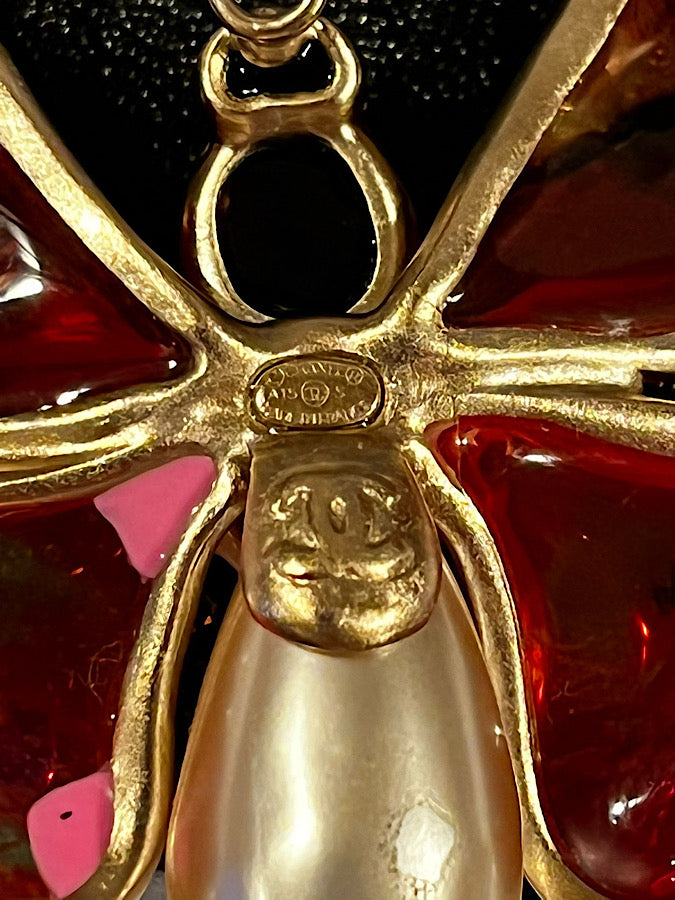 The body of the butterfly is an oblong "pearl" with a gold CC logo and Chanel’s famous poured glass. On the back is a gold disk with the CC logo, and the identification oval. This pin is in superb condition other than a tiny mark on the back of the pearl which, of course, does not show when it is being worn .