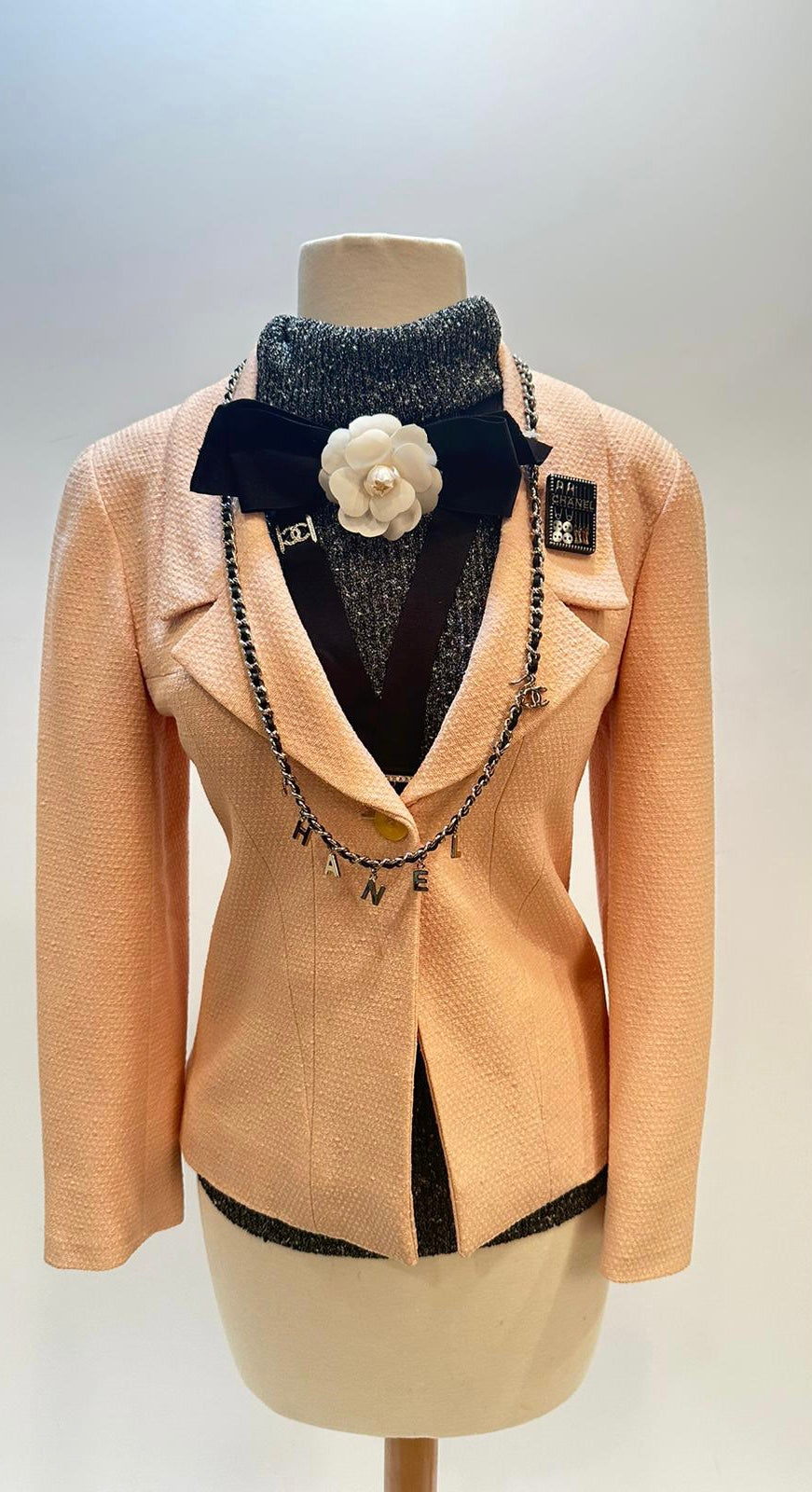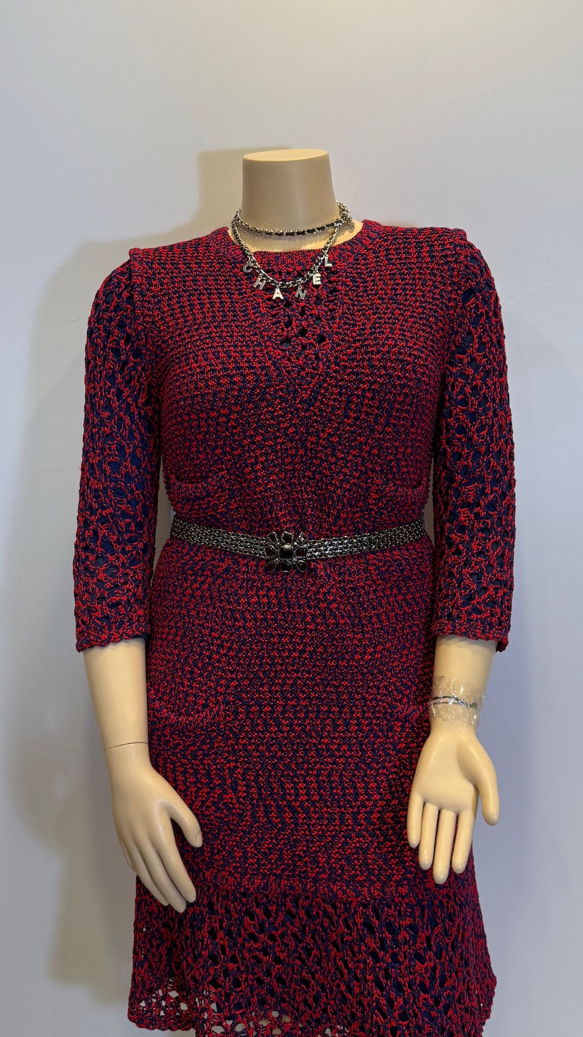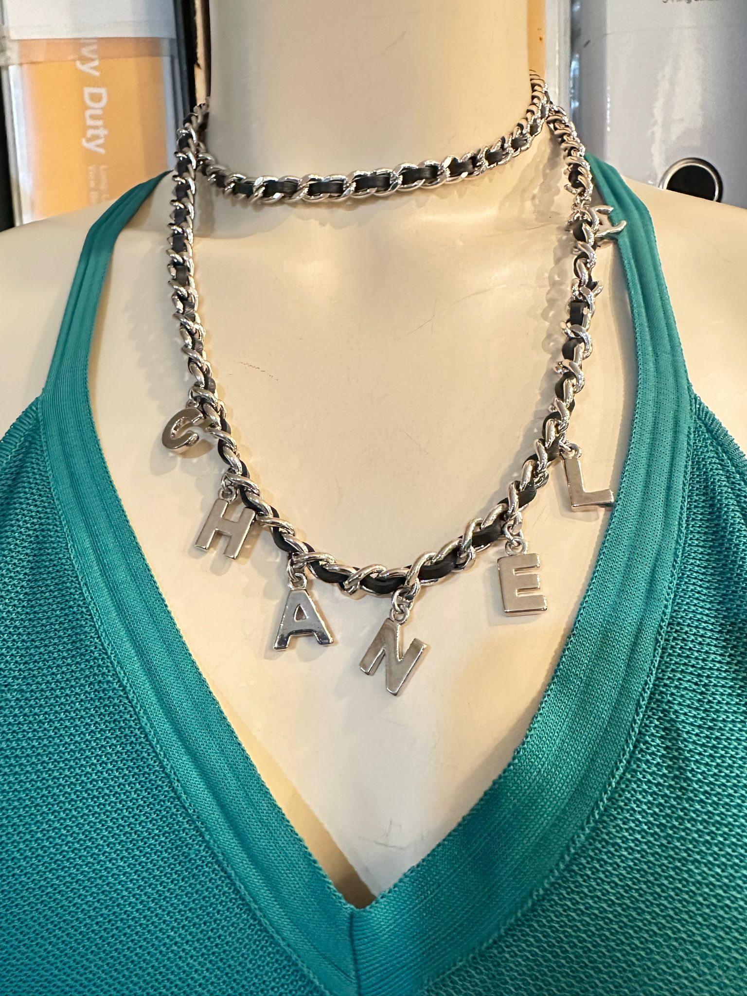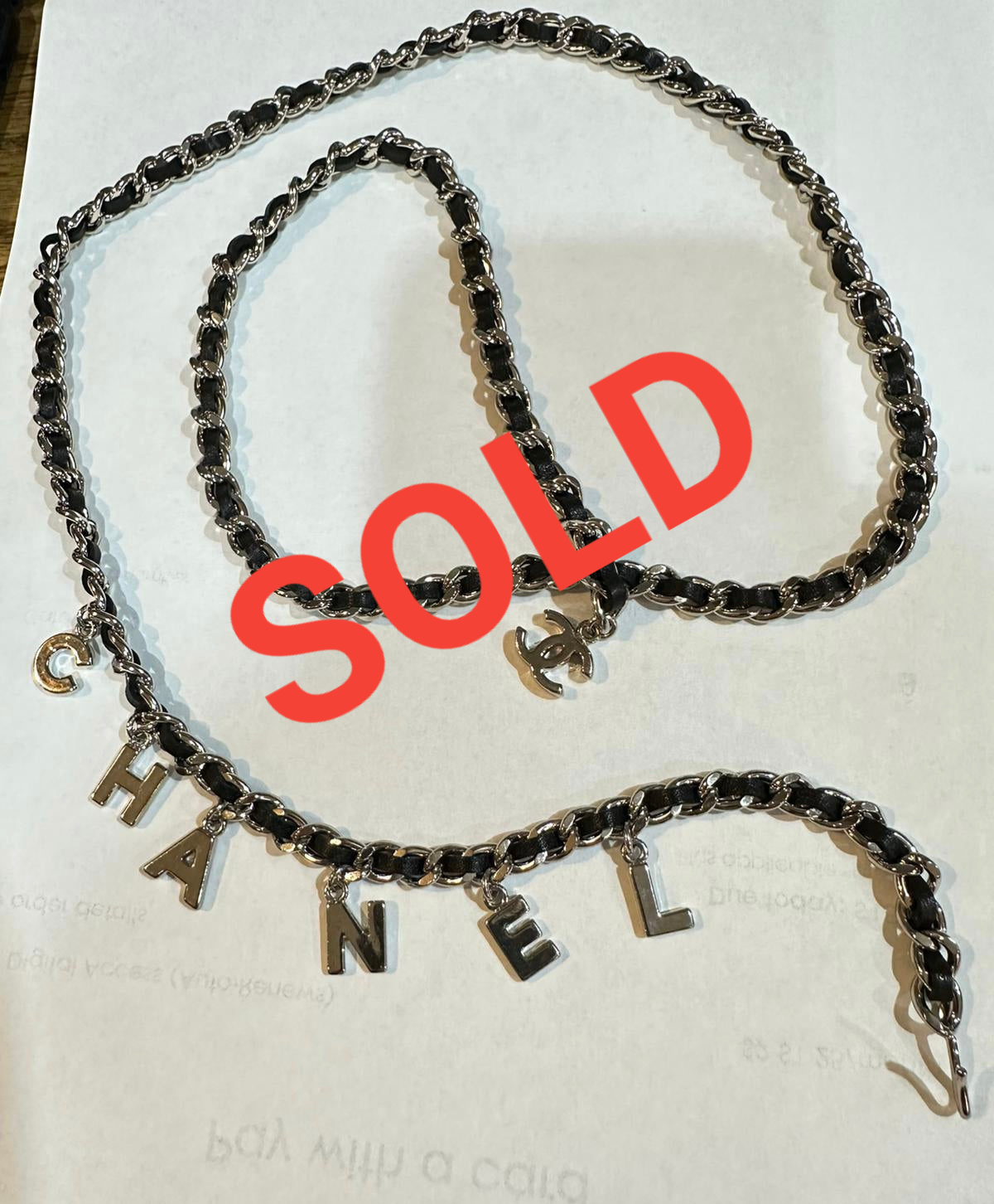 Here is fabulous Chanel silver chain belt with black leather woven throughout. The identification oval tells us that it is from the 2012 autumn collection-works perfectly as a chanel necklace or a Chanel Belt. It isn't a bulky piece and it will fit into a size 38 waist because there is a hook on one end which can fit into any link on the chain, with each letter measuring 3/4" top to bottom.