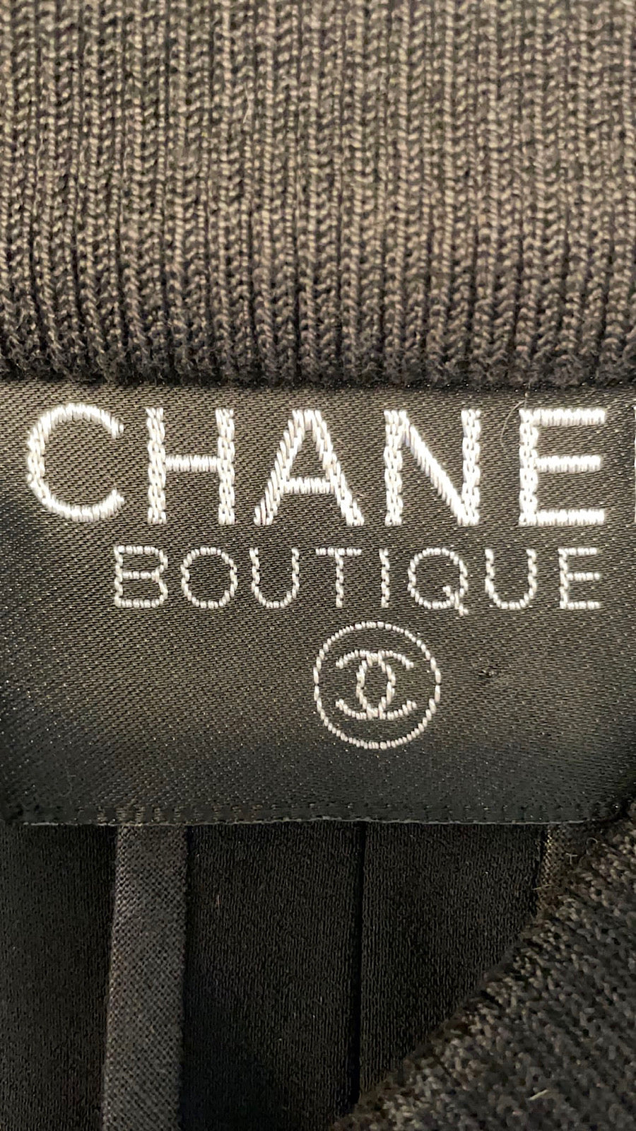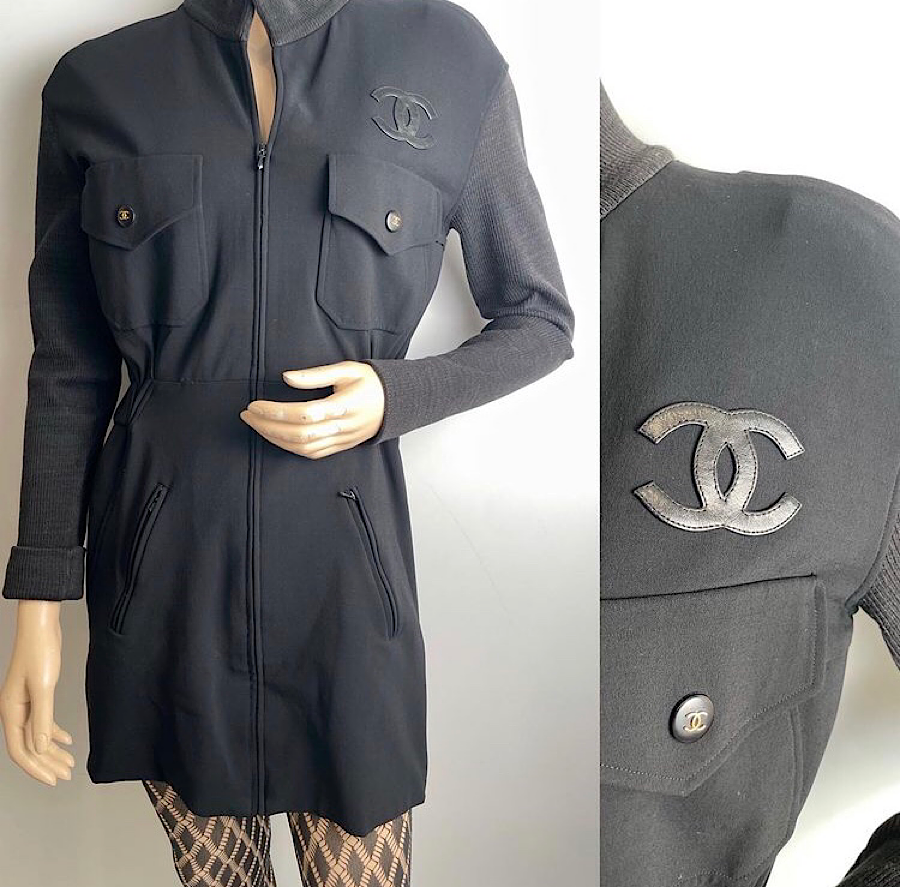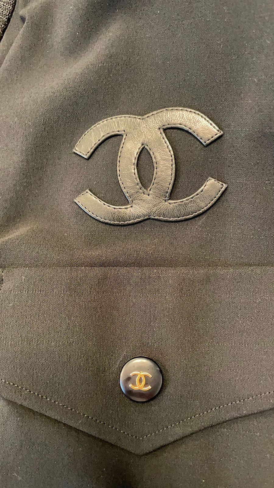 It zips up the front with an 18" zipper. There are 2 zippers on the two slash pockets on the front, there are 2 additional pockets, each with black Chanel E.Z. Snap Buttons on the chest. Each button has a raised gold CC logo. On the front chest is a leather CC logo which is 2 1/2" by 2". It is unlined to allow the stretch