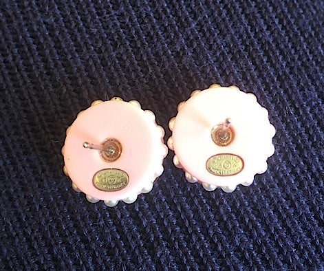 Rare Chanel 2016 Pink Resin Lucite Emoji Wink Smile. Round Stud Pierced Earrings. Pearl trim around, multicolor crystal inset, CC at each corner. In perfect condition.