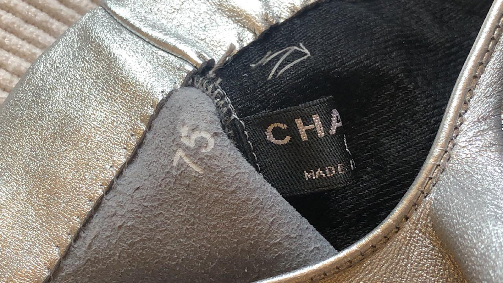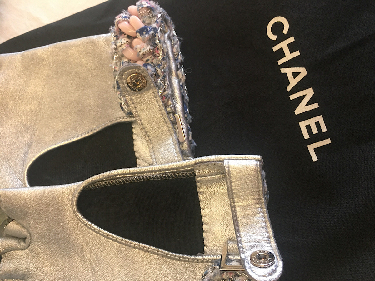 Each glove also has a silver "CC" logo. Each wrist has a strap which goes through a silver buckle and snaps with a silver snap which has a "CC" logo.