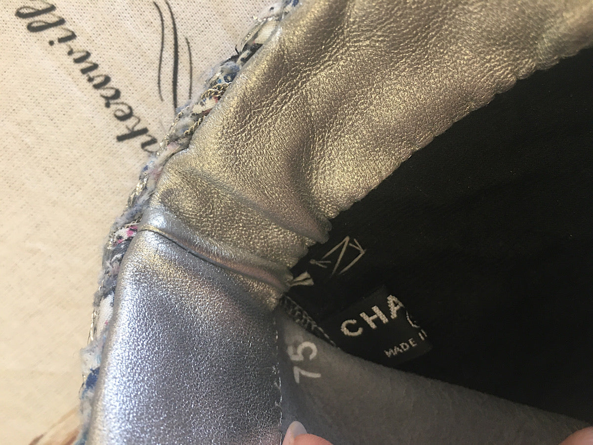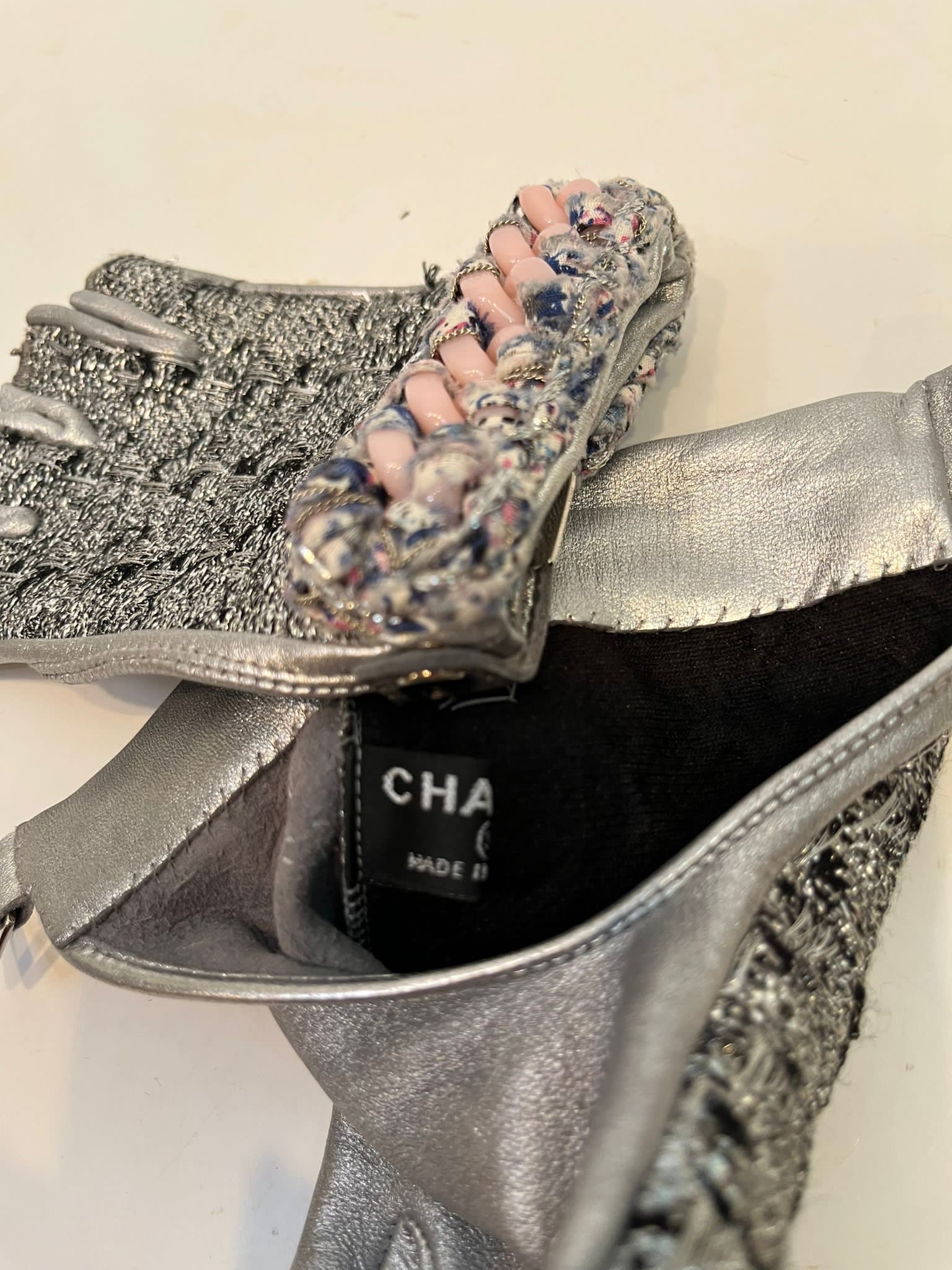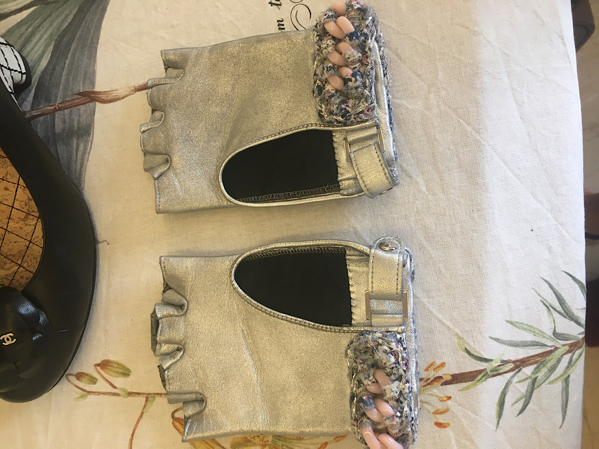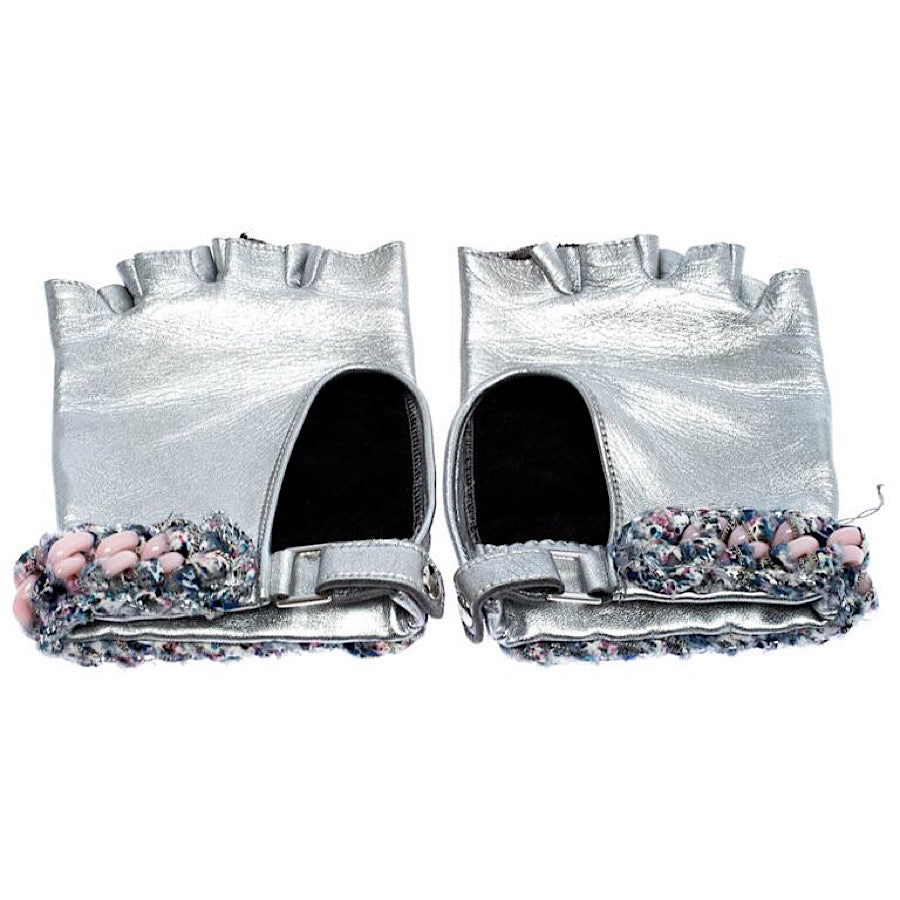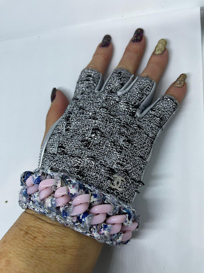 Beautiful Rare Chanel fingerless gloves Size 7.5 in Silver and pastel pink from the 2014 Spring 14P Collection.