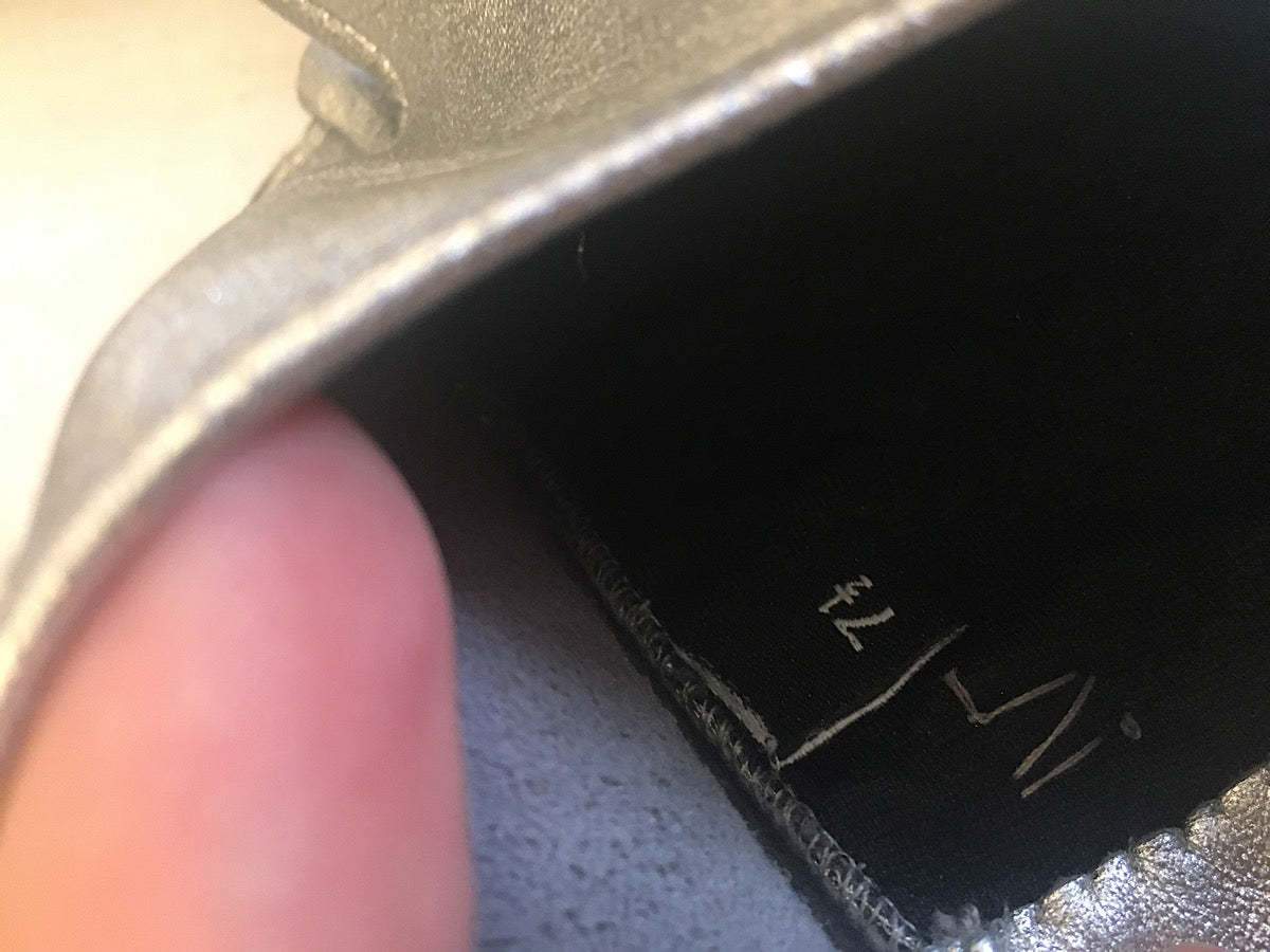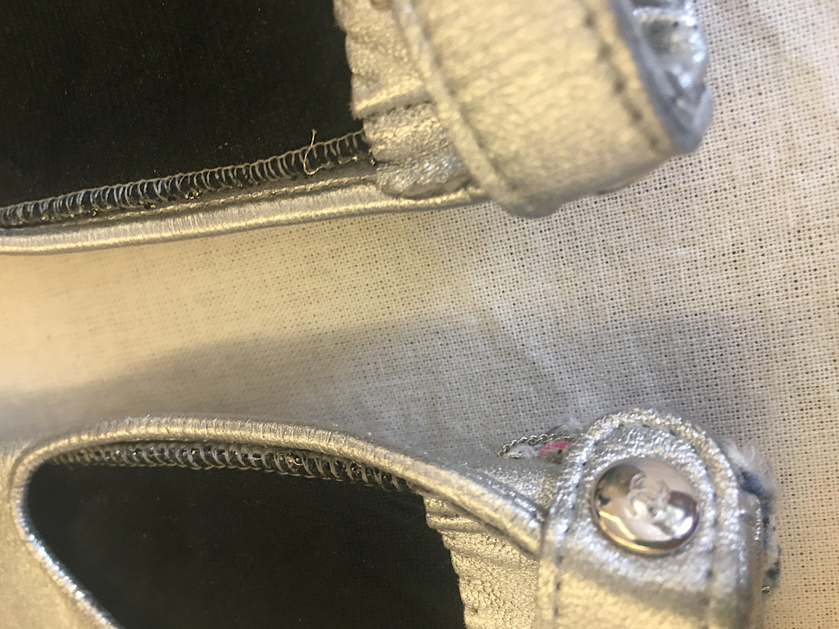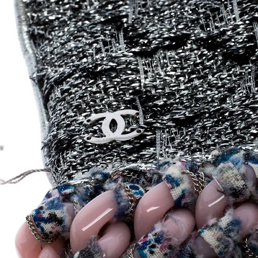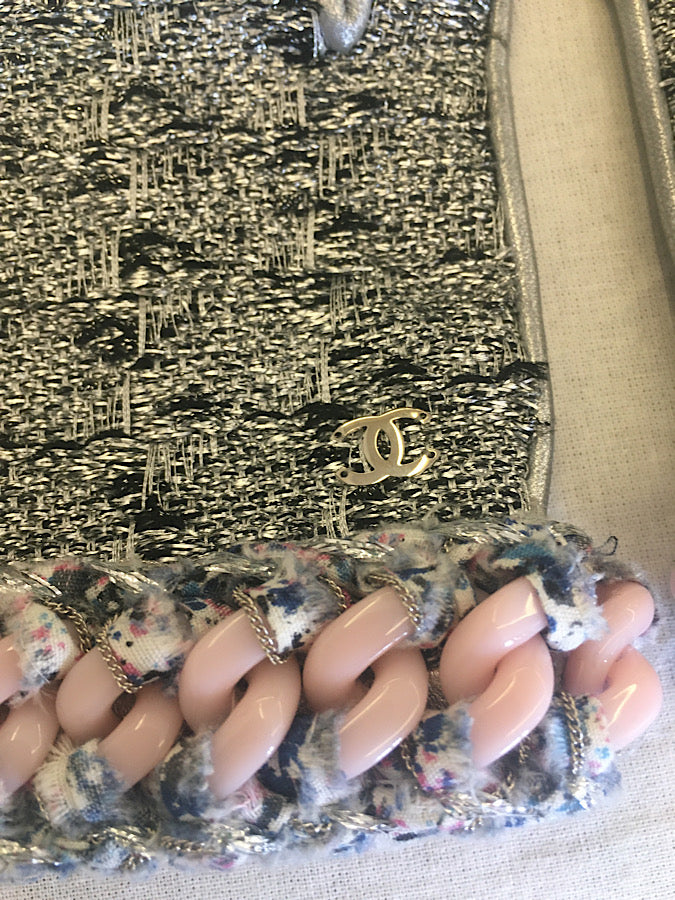 The top is a heavy fabric woven with silver and black threads. The palm is silver leather. Trim around the wrist is fabric with thin silver chain, and a chain of larger pastel pink appearing to be lucite, with a bit of fabric intertwined that has very a subtle design in white, gray, and turquoise.