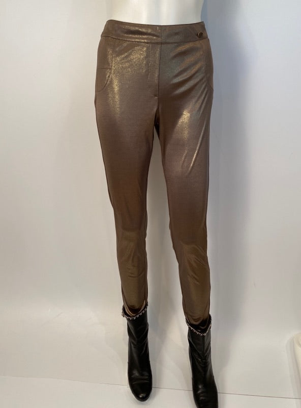 Chanel 12A, 2012 Pre-Fall Paris Bombay Runway stretchy muted gold metallic leggings. There is a metal oval with a "CC" logo at the waist. Side hidden zipper. The stitching is done in such a way to create the illusion of a fly front with hip pockets. Yoke back, and back pockets, all illusions created  by stitching. These pull on like tights, very flattering and versatile.