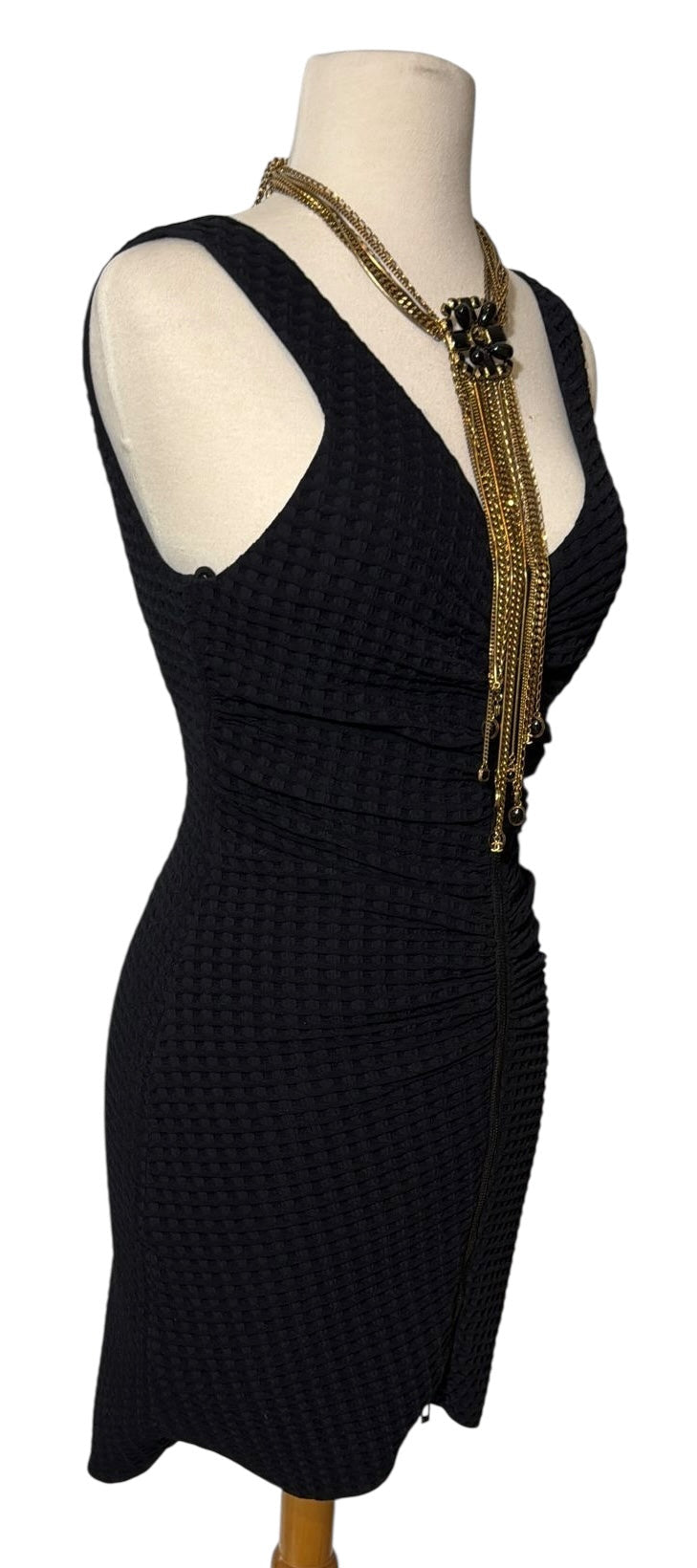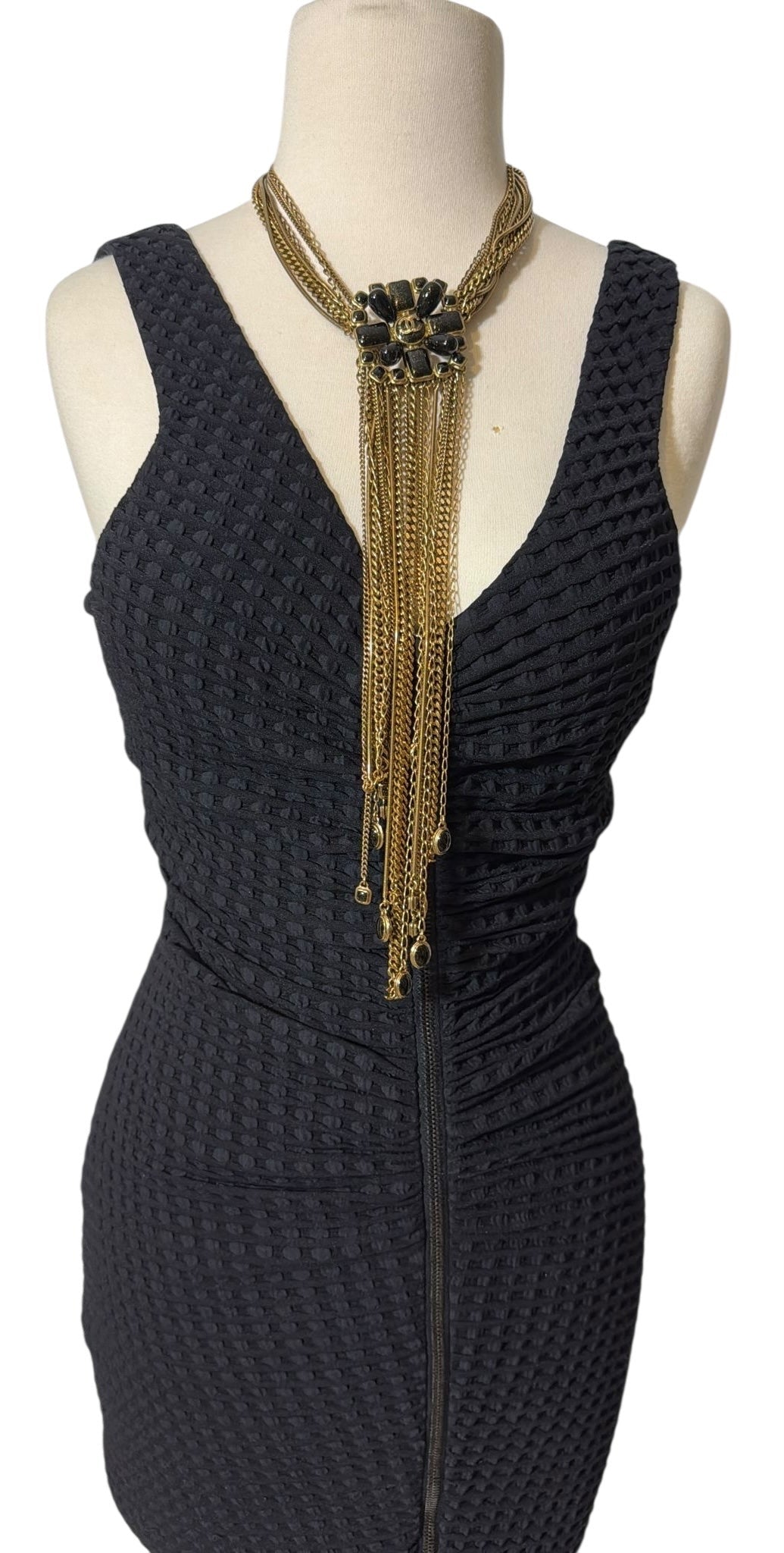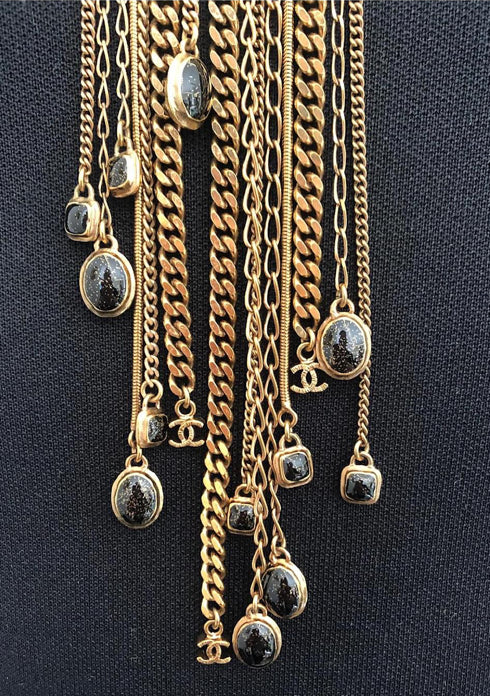 15 gold chains hang down 8" in the front with 4 different chain link designs. At the end of each chain is a black cabachon stone-a gold CC logo replaces one of the csbachon stones. There is a series of chains forming the neckline-you can set it at any length from 17 1/2" to 18 3/4" depending on where you hook the lobster claw clasp.