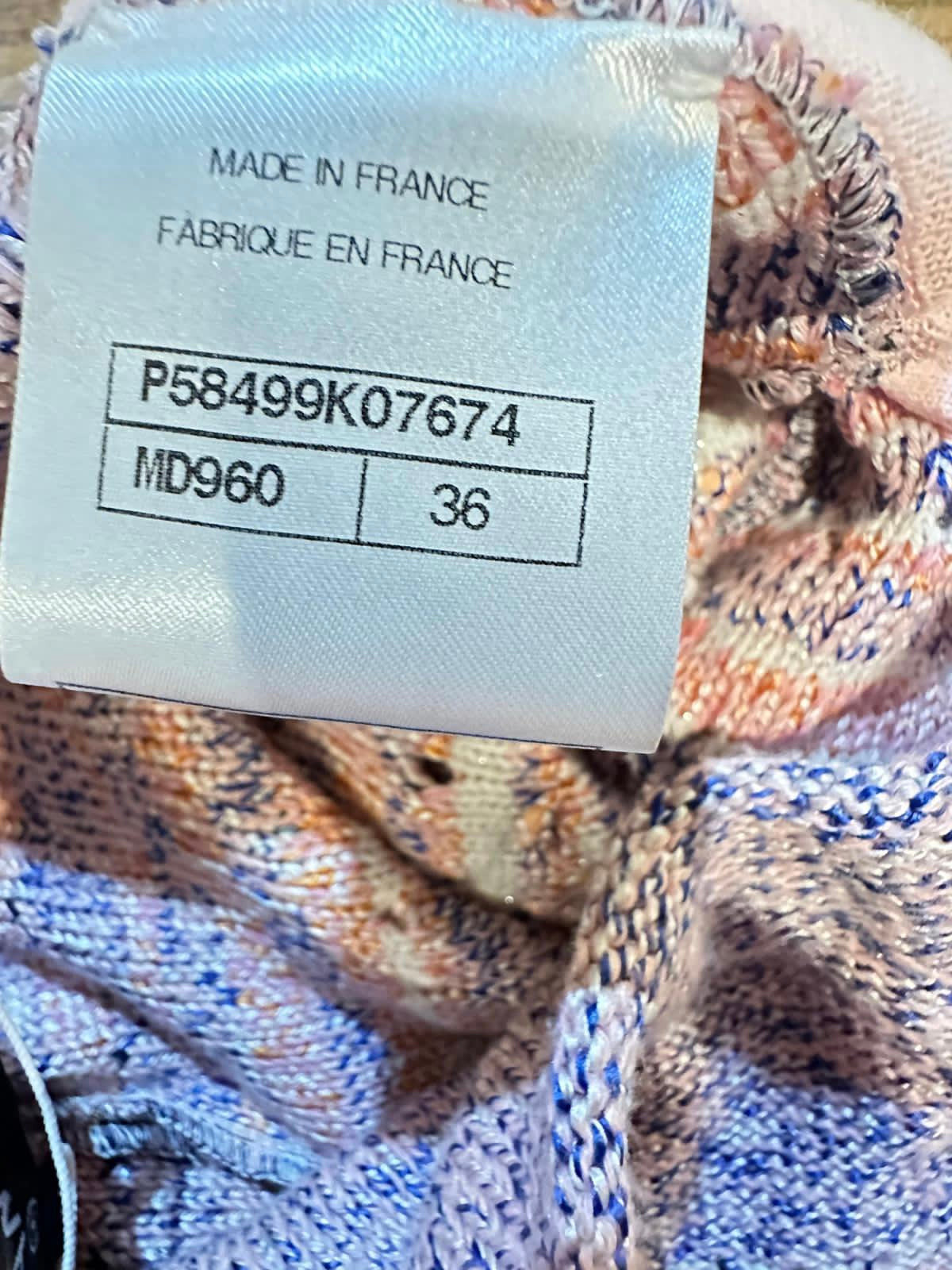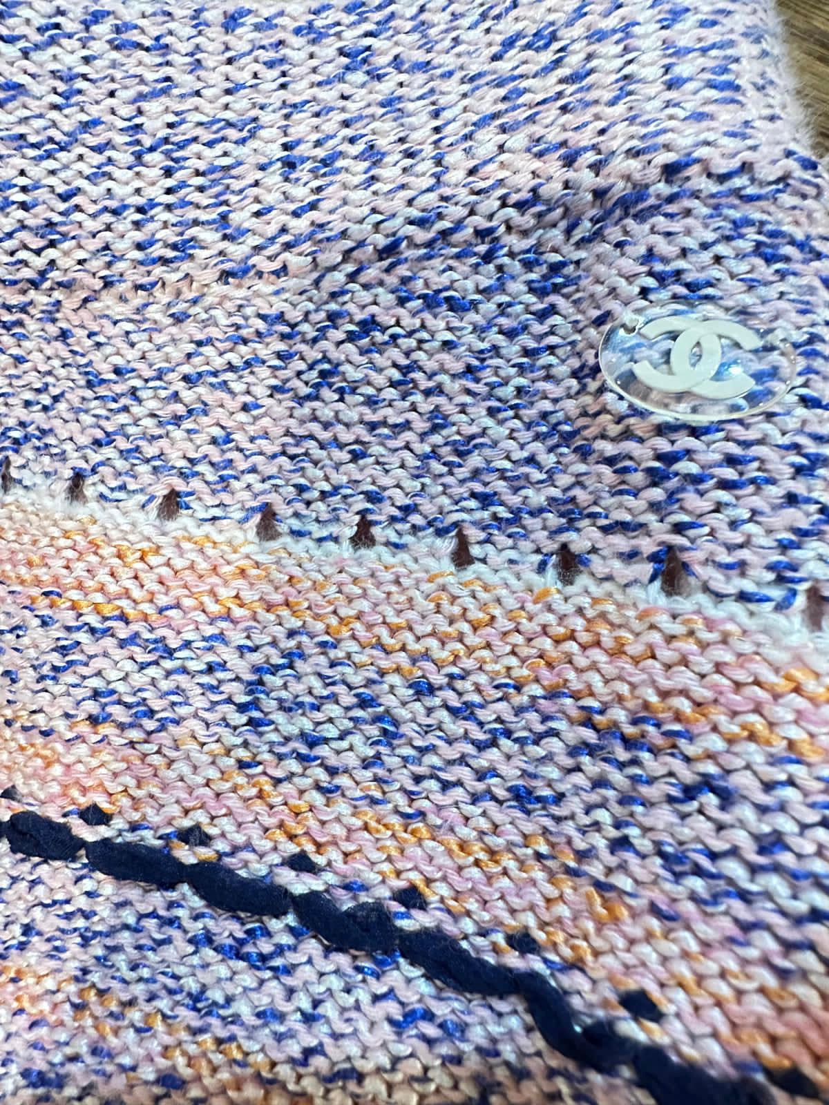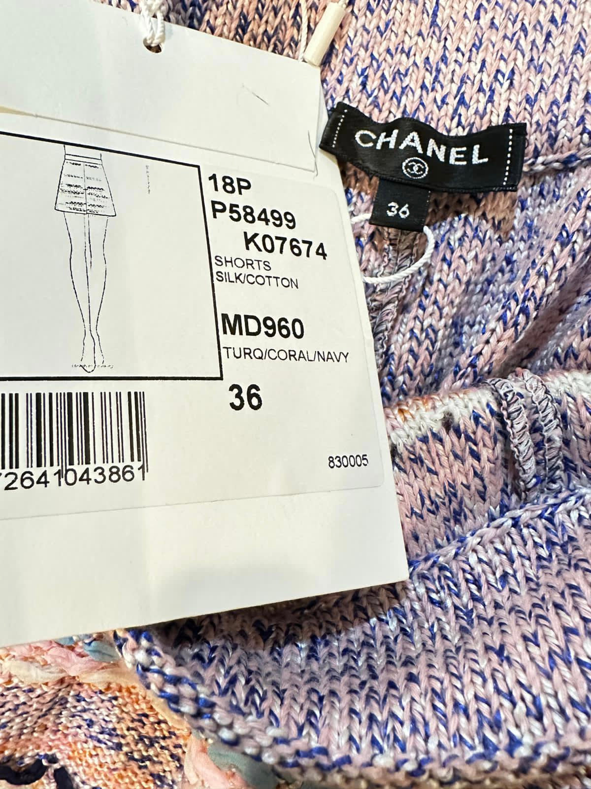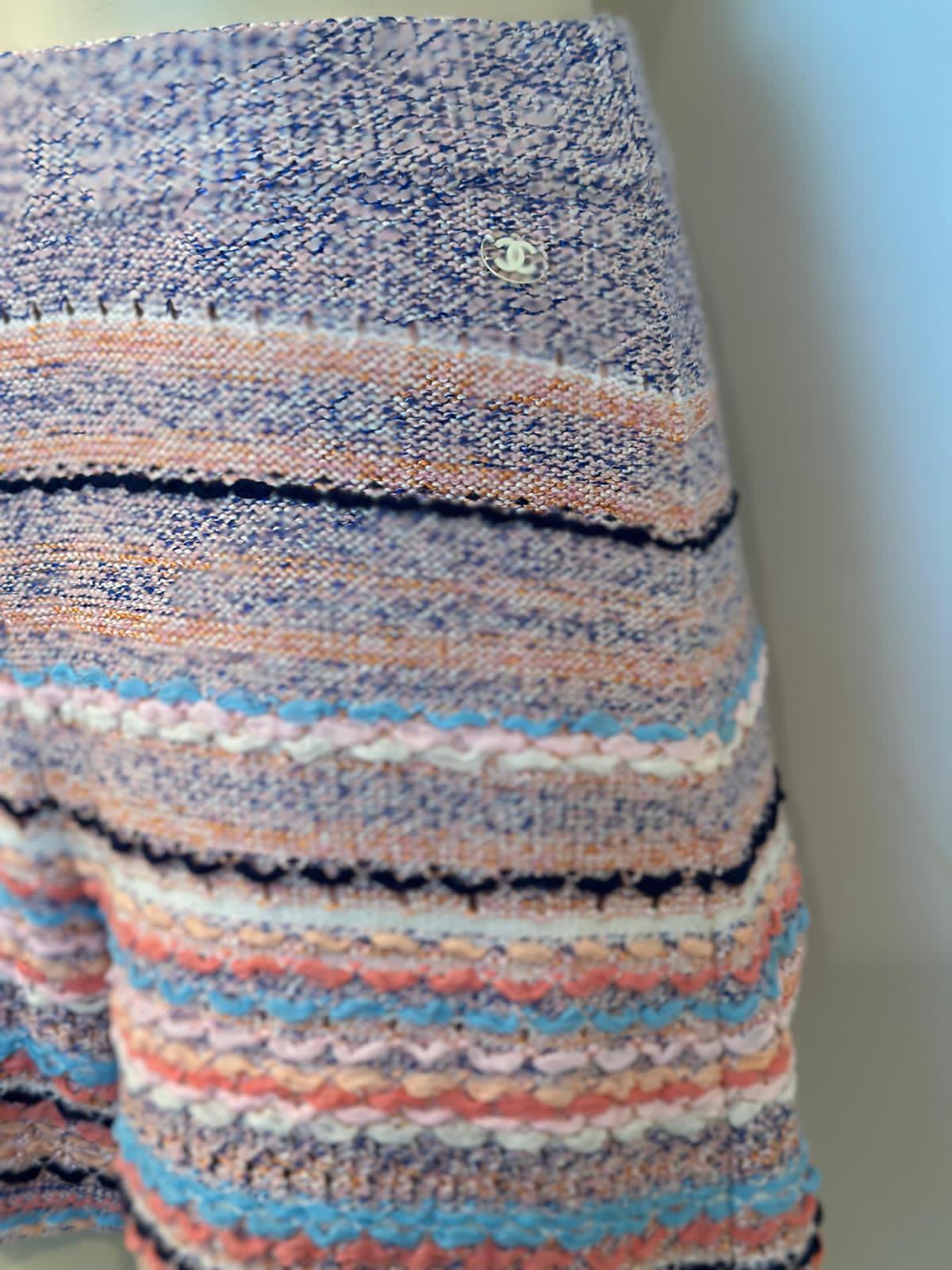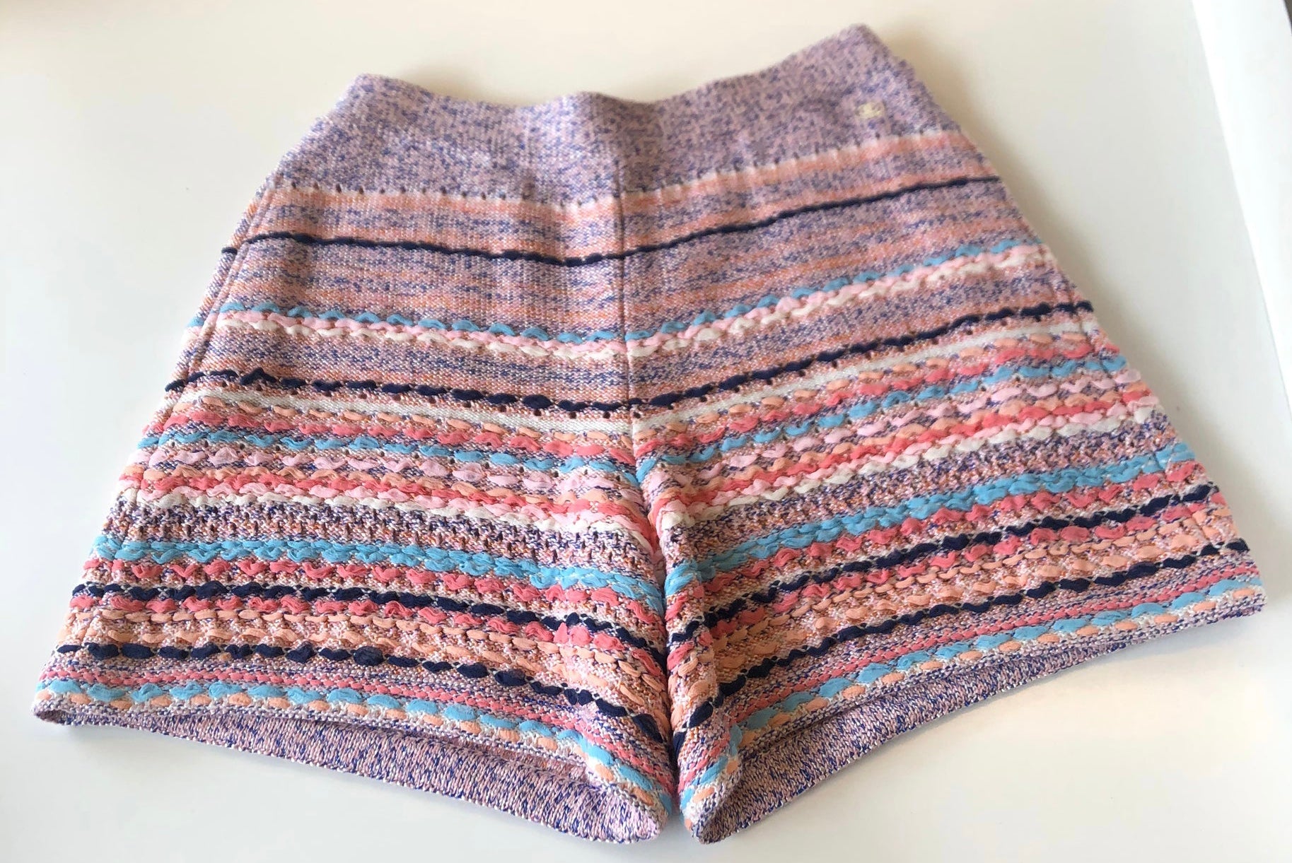 This pair of Chanel shorts are a woven fabric in turquoise, coral, navy, and light pink. They are a weave of silk, cotton, and a bit of cashmere in different shades of colors and differing thicknesses of yarn. Stylish comfortable, new with tags, packet with yarn samples included. Roomy, but fit very well without looking baggy. This is a beautiful pair of shorts, which change moods depending upon what you pair them with. At the waist is a 1/2" lucite square with a white CC logo.