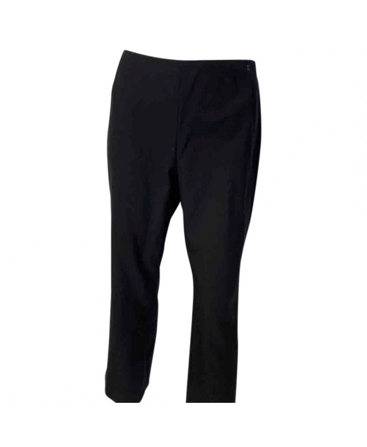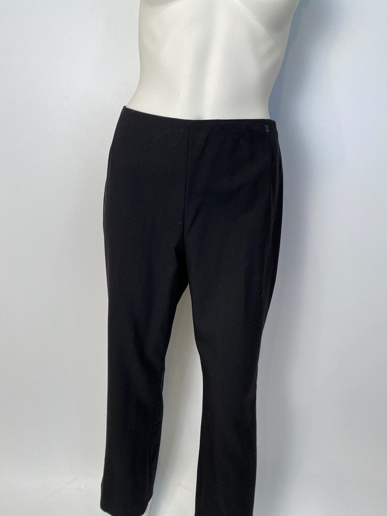 Flattering Vintage Chanel 01P lightweight pants with hidden side zipper. No waistband no gathers, no pleats, no pockets, no elastic, and no lining. Just a nice smooth fit and these go with everything. There is a metal “CC” logo at the waist
