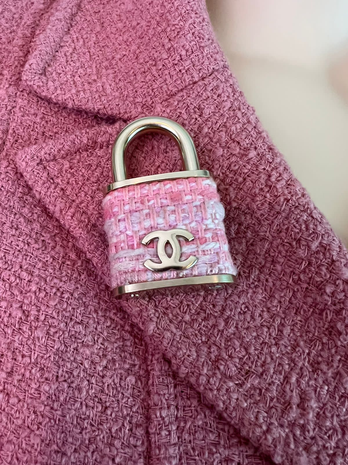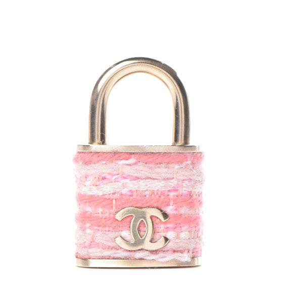 Chanel 2014 Pink Tweed Gold Padlock Brooch Pin