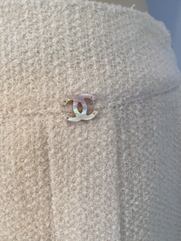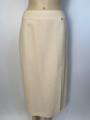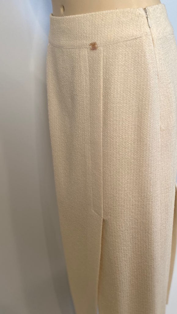 Chanel long ivory versatile skirt. Fastens with a hidden side zipper. There is a mother of pearl "CC" logo at the waist. There are offset slits 19" long, so walking is NO problem at all.