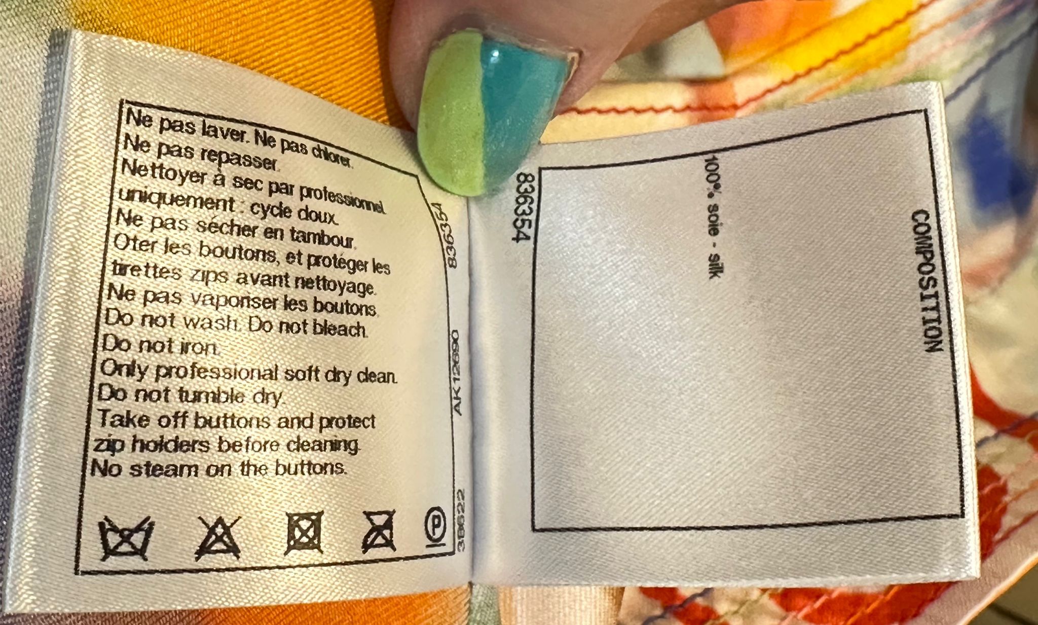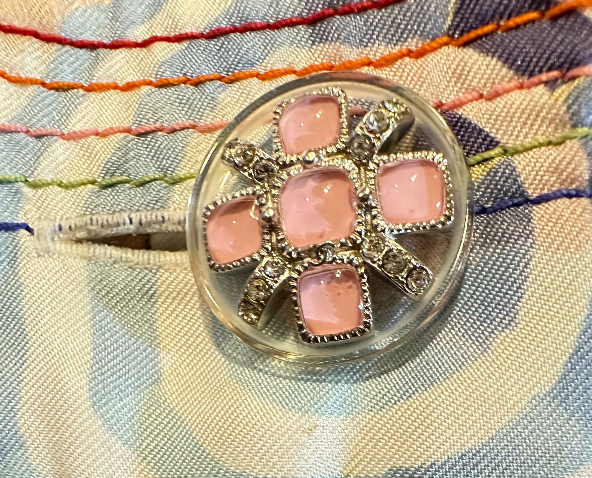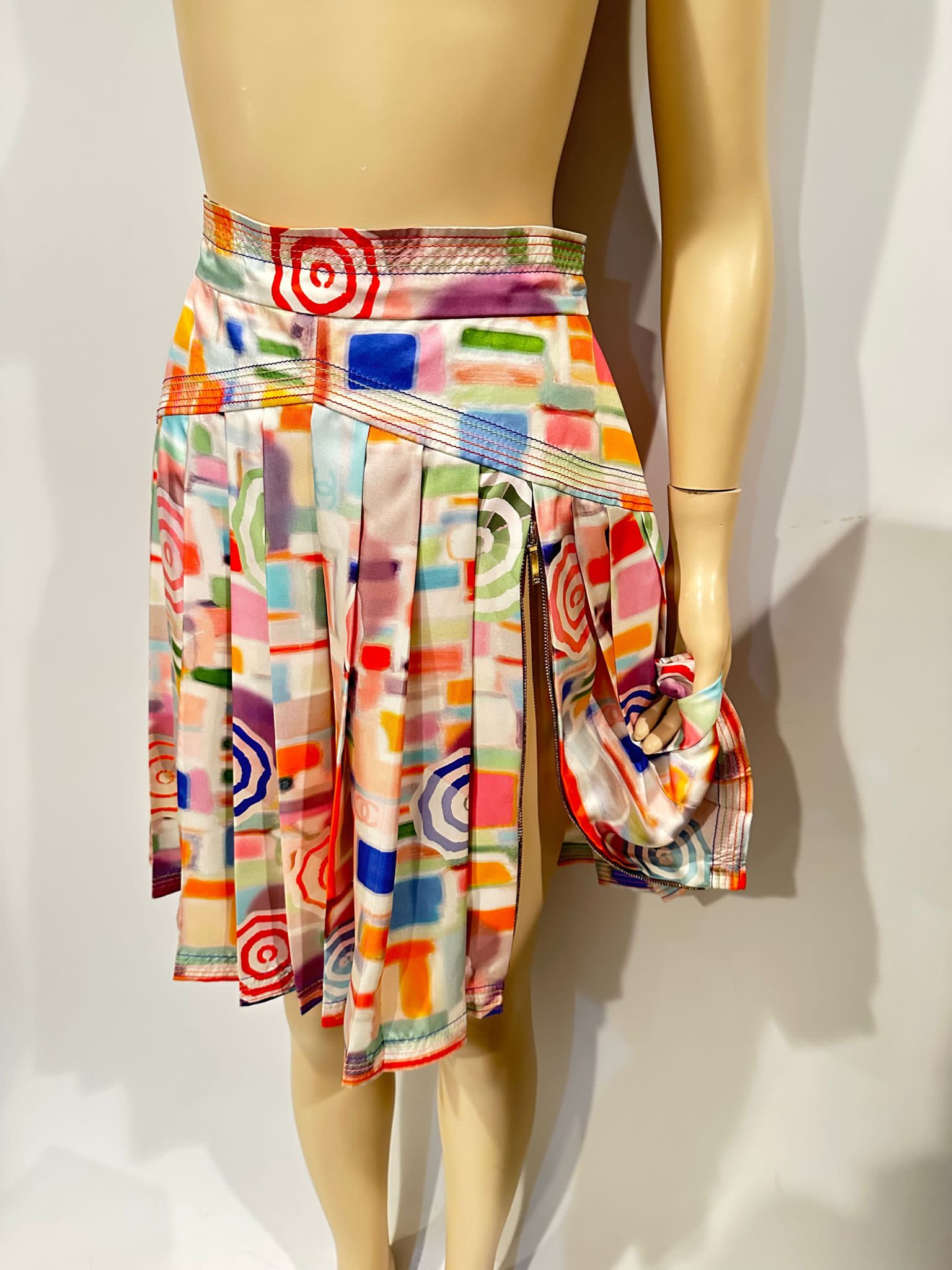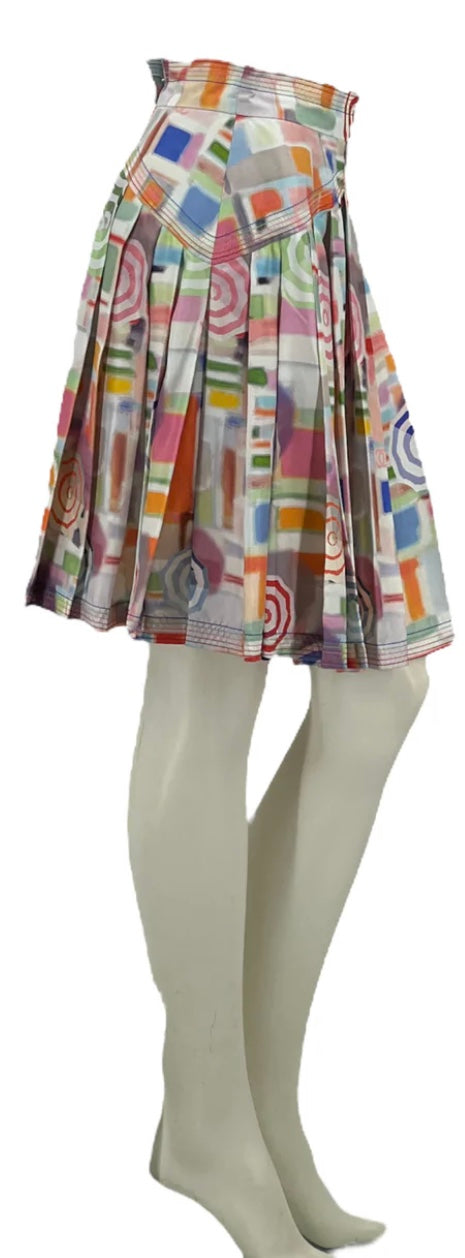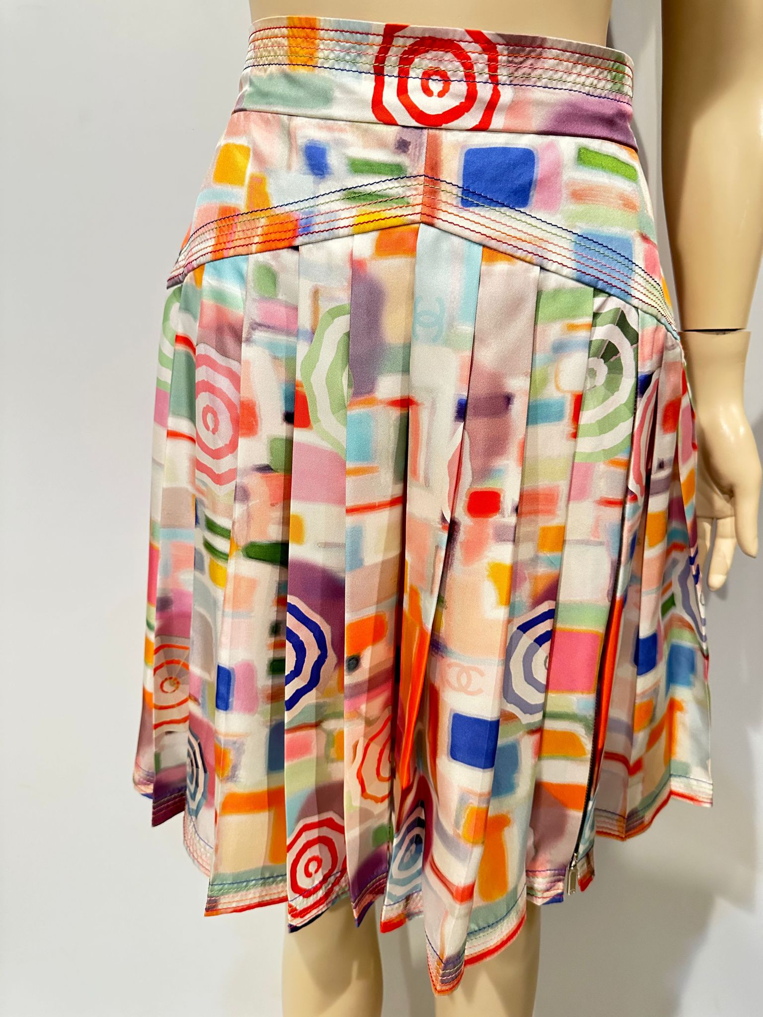 This Chanel skirt zips up the back with a hidden zipper, there is an additional zipper, 15" long on the left side, just for fun--see our pictures. The zipper pull has the "CC" logo. This colorful design has geometric shapes in bright colors, including random "CC" logos.