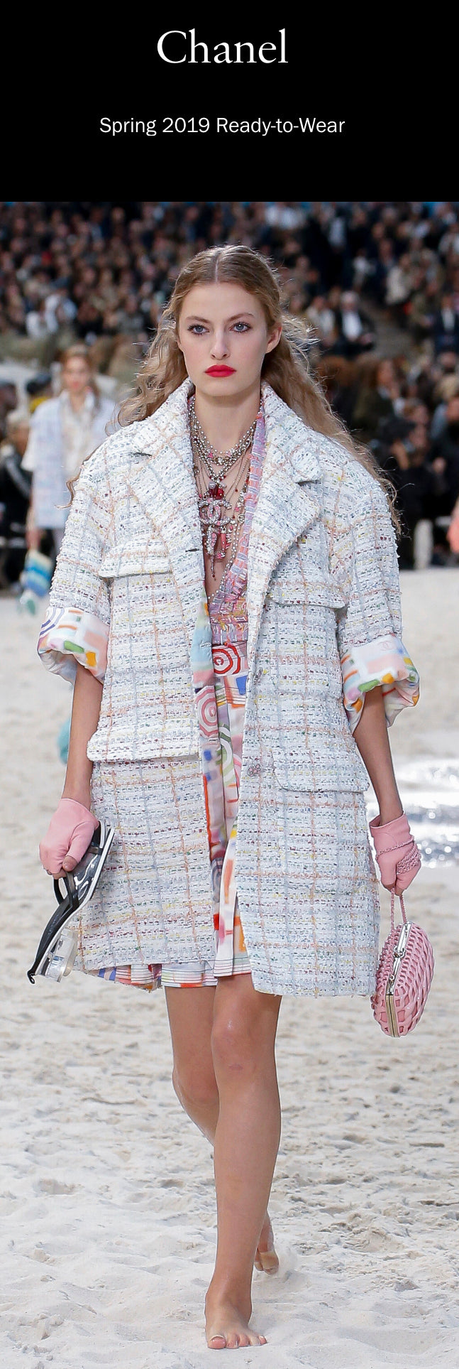 Colorful Chanel 19P, 2019 Spring Summer Ready to Wear Runway Look #8 silk pleated multicolor skirt with geometric umbrella pattern.