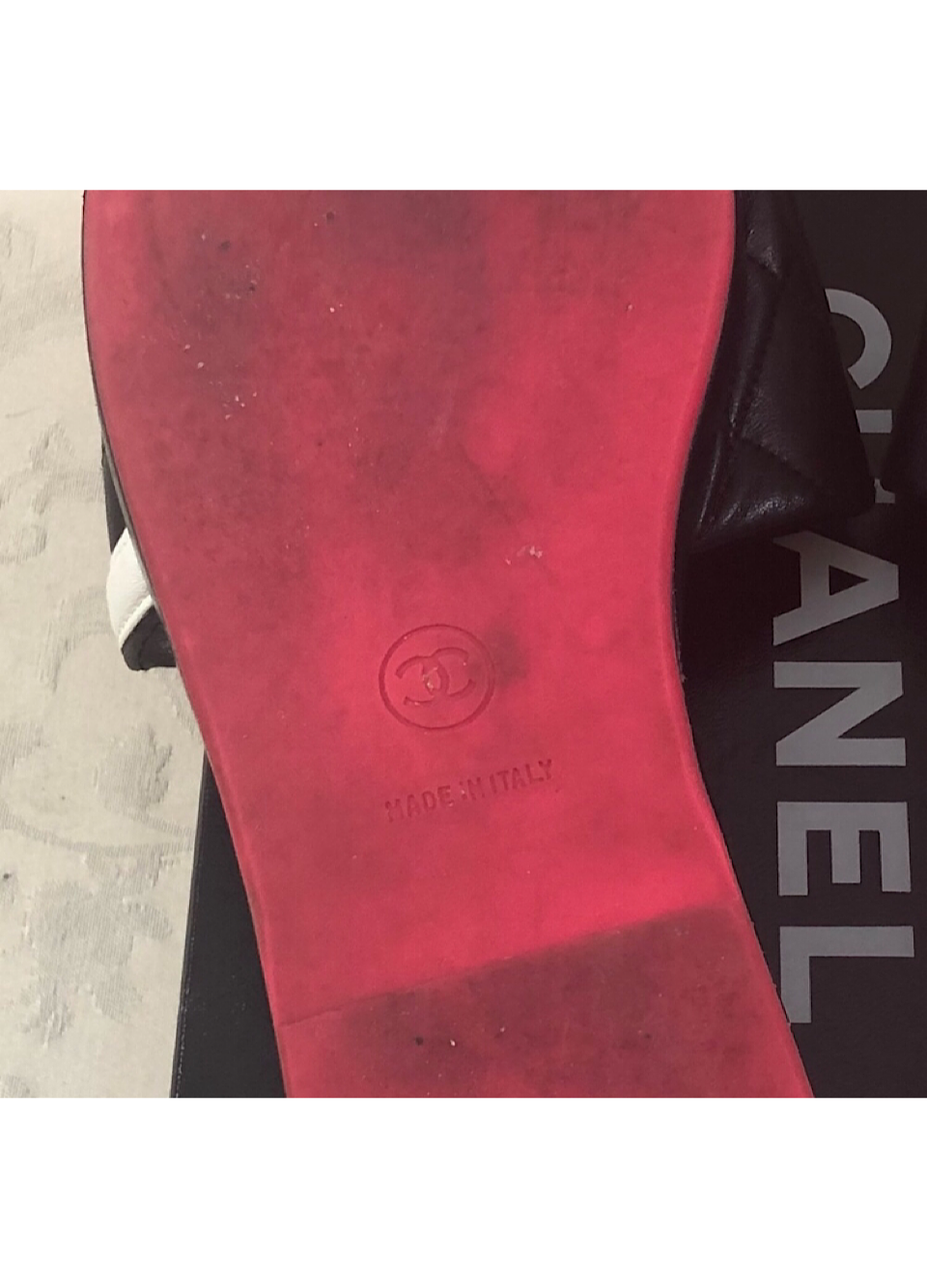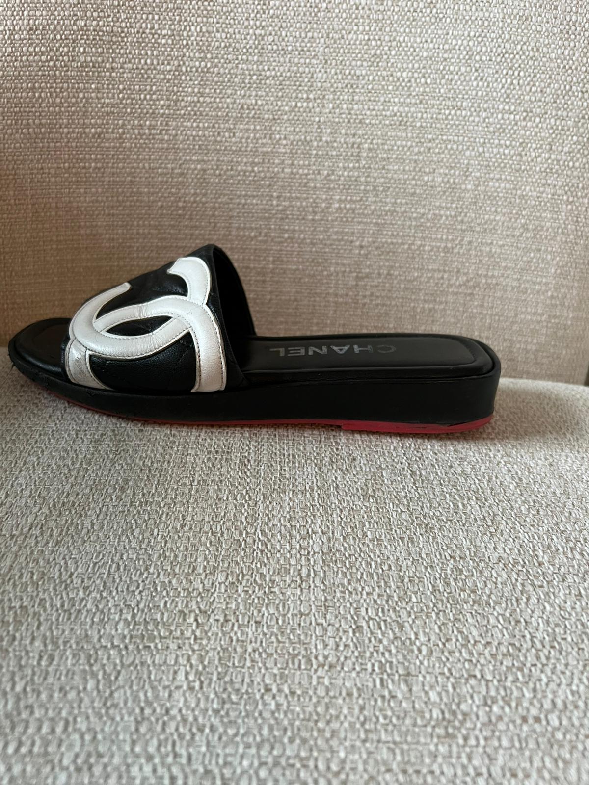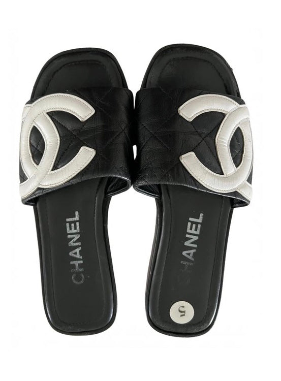 Small (U.S.size 5) Chanel quilted leather cambon shoes slides black with huge white CC logos. They are from 05C 2005 Cruise Resort Collection.