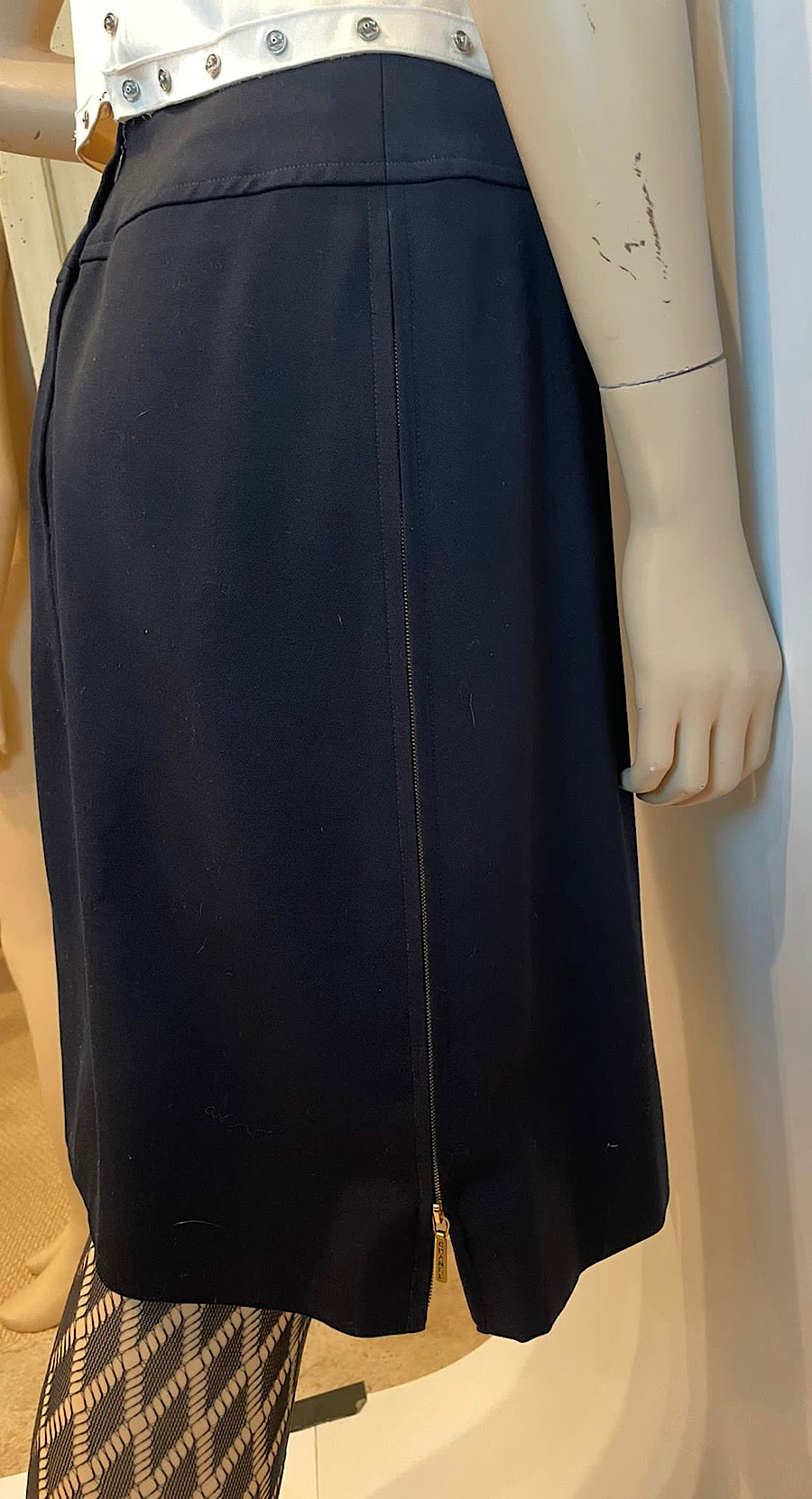 This dark navy Skirt has 3 zippers, 1 hidden on the back for closure, and a 12" long zipper on each side, each with a Zipper pull that says "Chanel" in black. You can wear it zipped, unzipped, however the mood strikes you. Flattering style with no waistband, no gathers, no pockets , no pleats, a nice smooth fit. It sits below the waist.