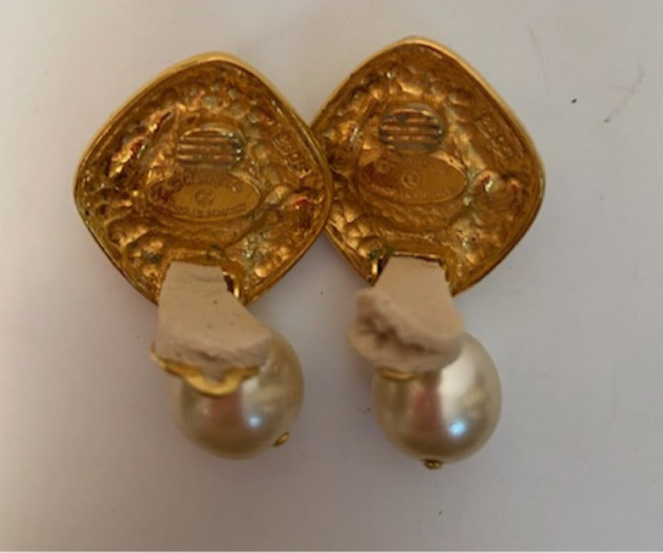 These gold earrings have an elaborate design. They have the Chanel identification oval on the back, and a large beautiful pearl hanging at the bottom.