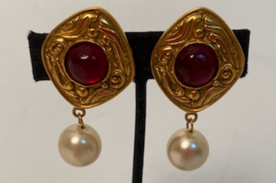 Vintage Chanel clip on earrings with red poured glass Gripoix stones with hanging drop pearl.