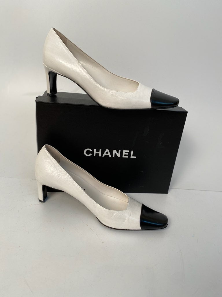 Black and white chanel leather bicolor heel pumps with Chanel shoebox.
