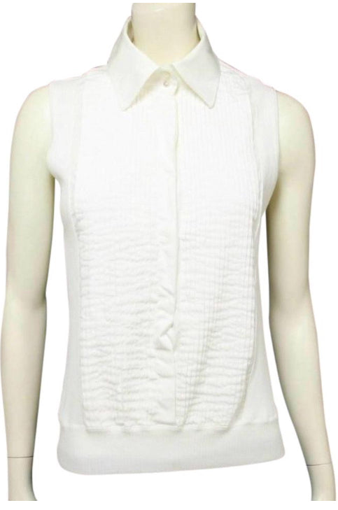Chanel 05P, 2005 Spring Collection sleeveless white blouse ribbed around the bottom, sides and in the back. There are tiny pleats across the front. Because the bottom is ribbed, it can be worn pulled down the hips, or up at the waist to create more of a blouson effect. The collar is very crisp. The ribbed back is stretchy. Engraved mother of Pearl buttons that say “Chanel Paris”.