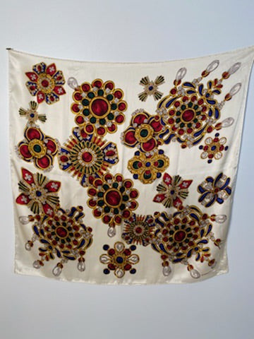 Large vintage Chanel silk multicolor scarf with Jewelry print throughout.