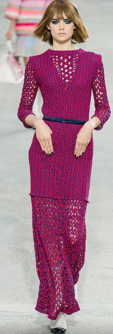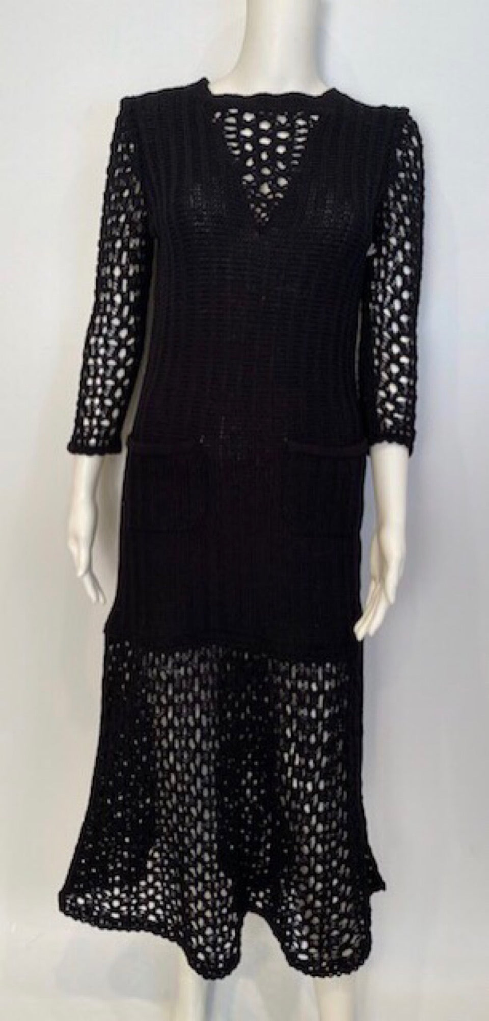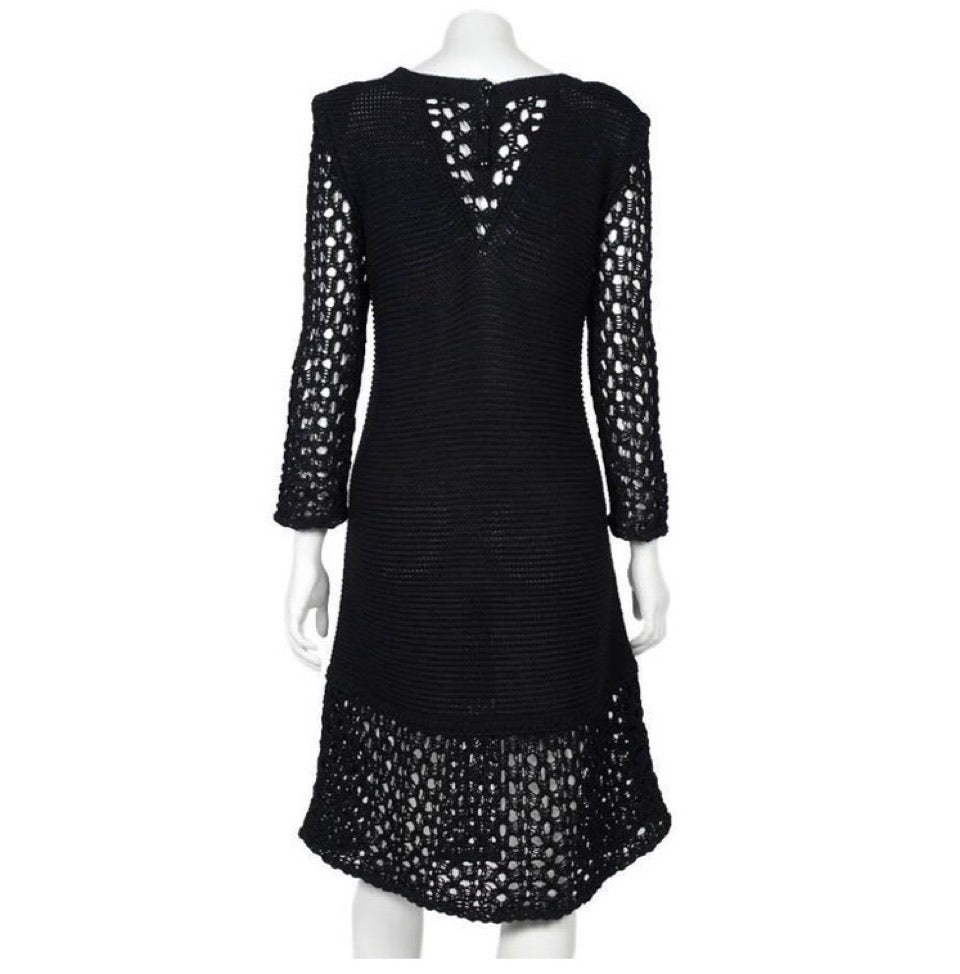 of the neck with small white "CC" logo. The body of the dress is ribbed. The arms, necklines, and bottom 23" of the skirt are all created with heavy cotton crochet. Designed to be worn without a belt, but looks great with a belt as well.