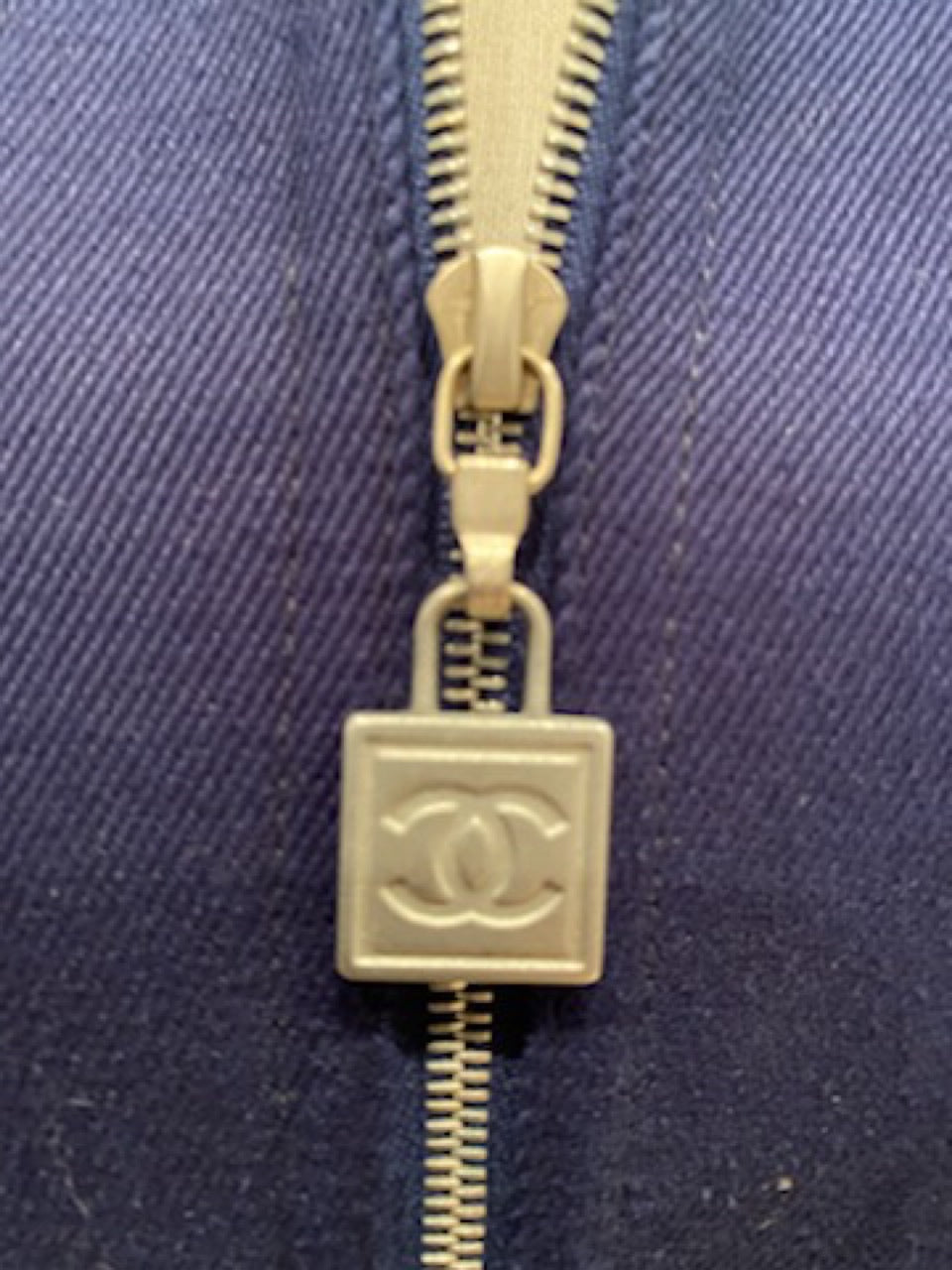 NWT New with Tag, never worn Chanel sporty tapered jacket from the 05P, 2005 Spring collection. This jacket features many zippers with CC logos. One for closure on the front and 1 one on each wrist. There are 6 Pockets, three up each side of the front with CC logos, 12. There is one on each of the 1" square E-Z Snap buttons on the pockets (each 1" square), 2 on the front zipper, 1 on each sleeve zipper pull which is shaped like a tiny lock.