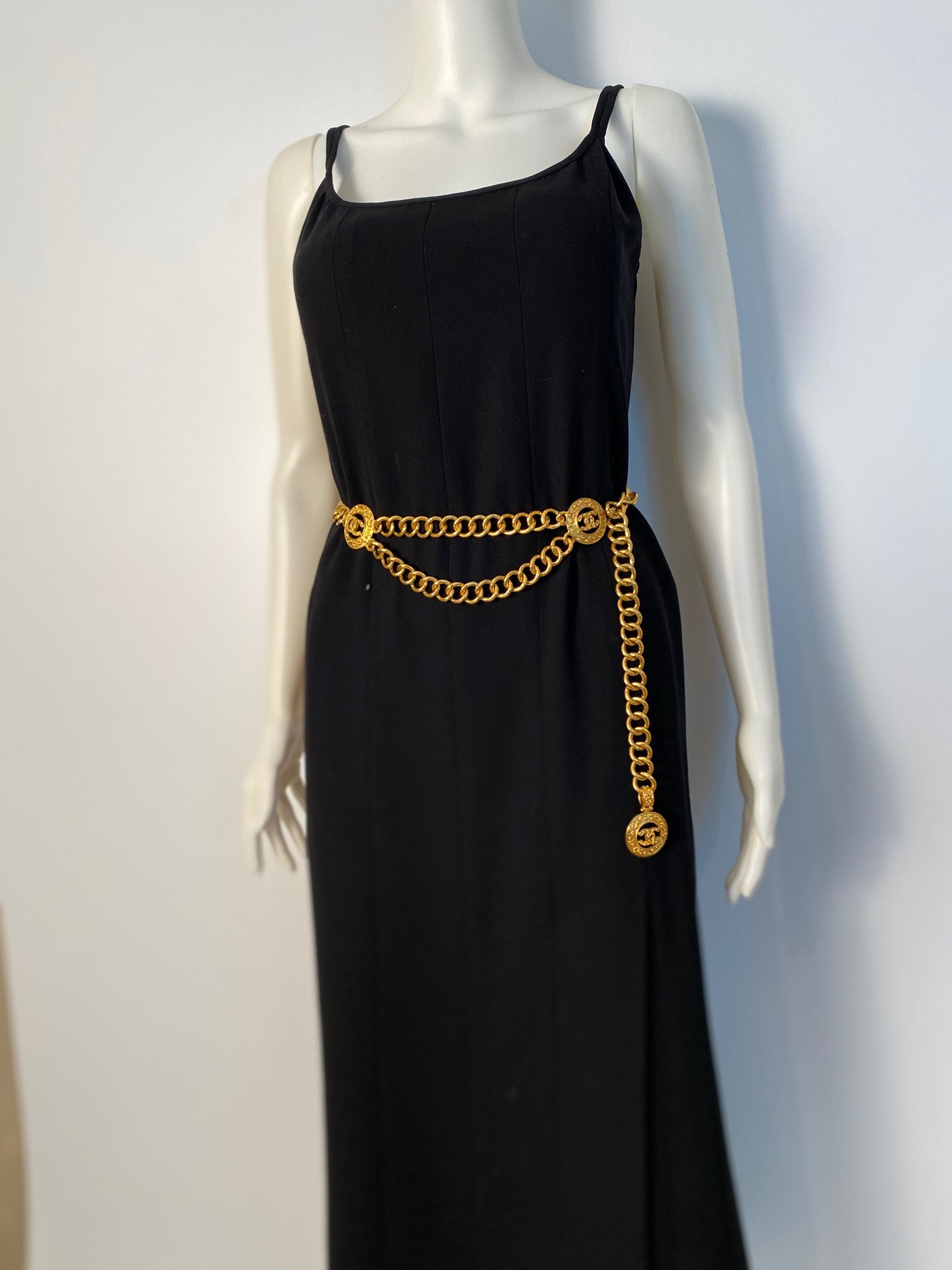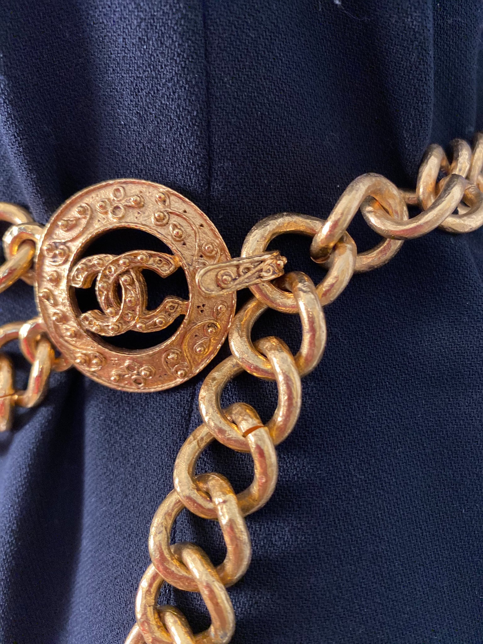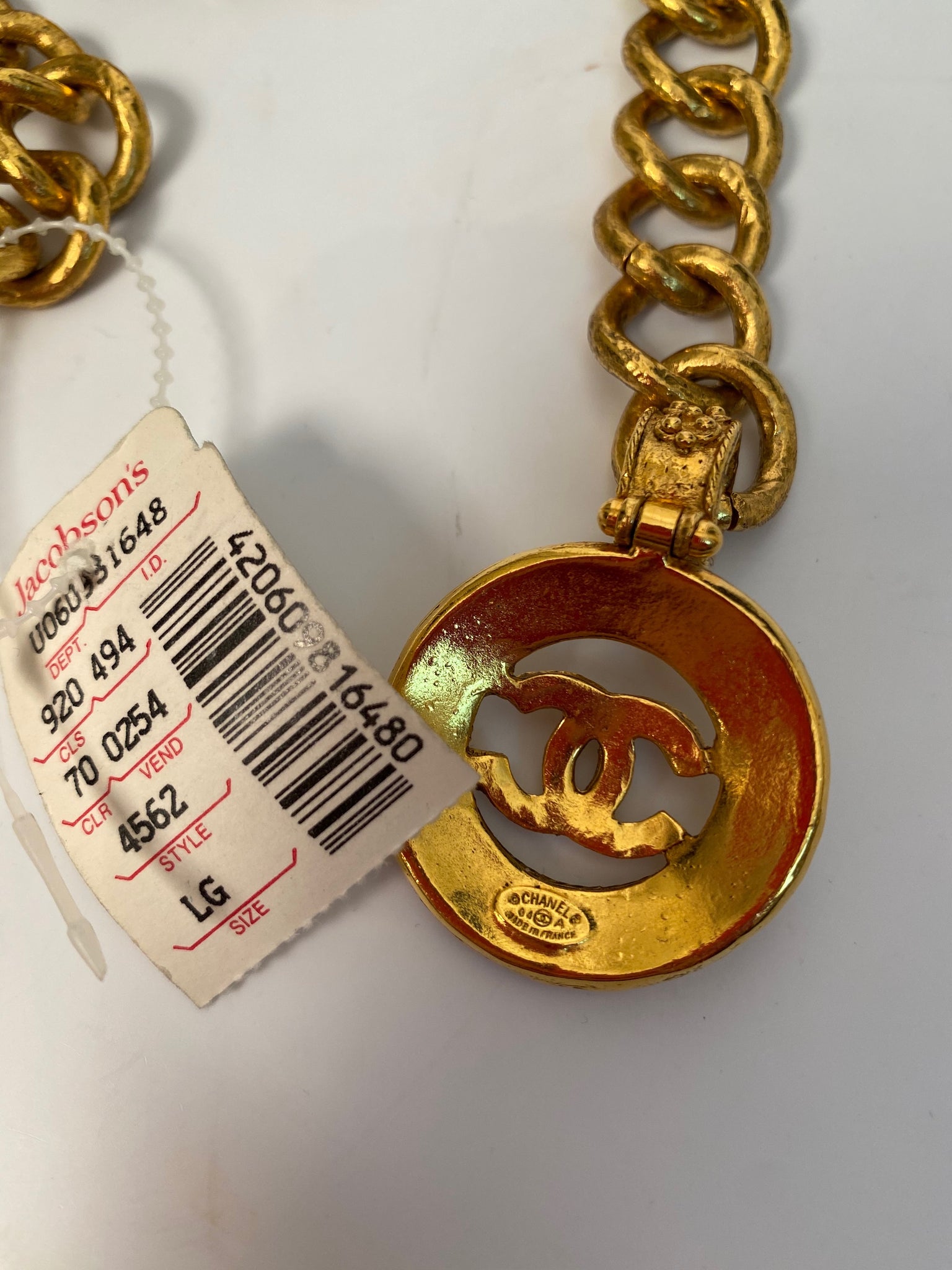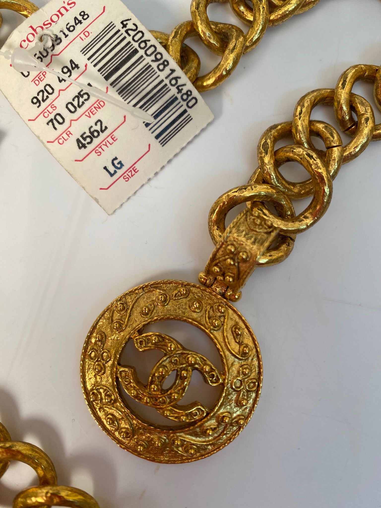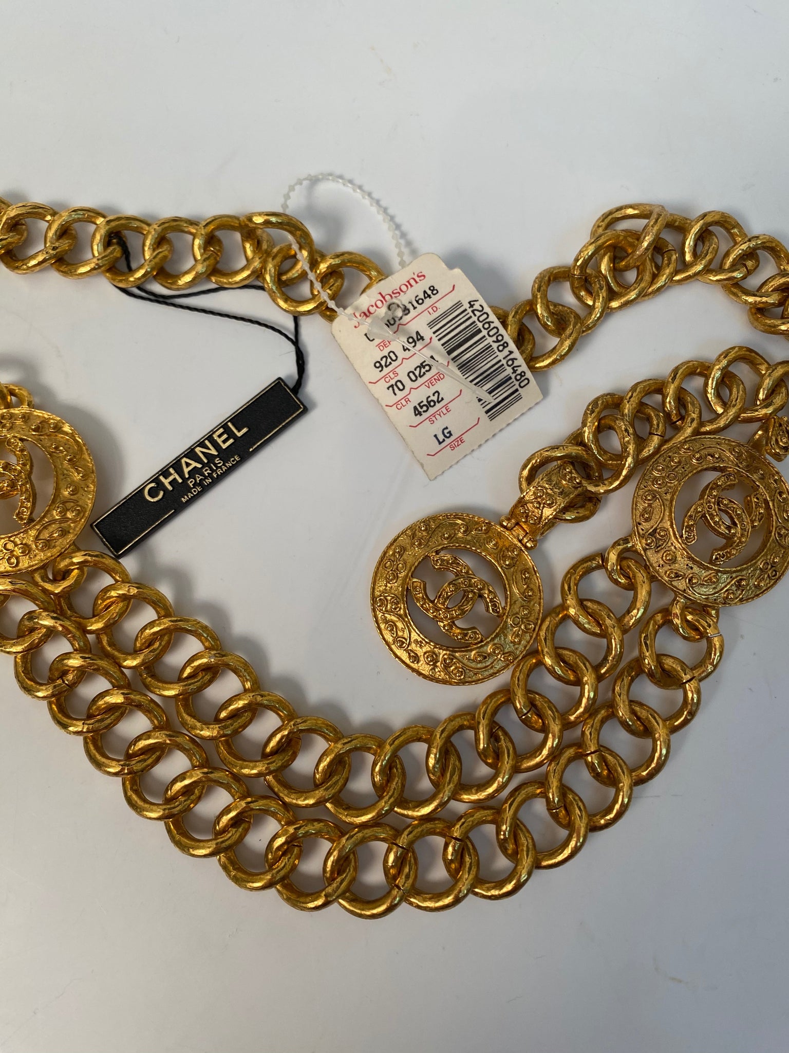 Chanel gold metal chain belt New with tags from 94A, 1994 Fall! This can be worn as a belt or necklace. The 3 medallions are very elaborate. It fastens by a hook on the end going through any of the links in the chain so it can be any length up to 34”. Nice if you like to wear your belts low on the hips sometimes.