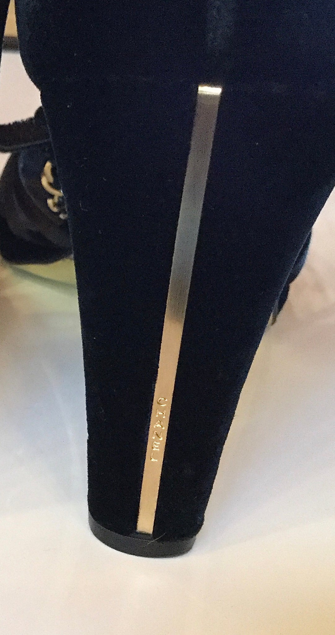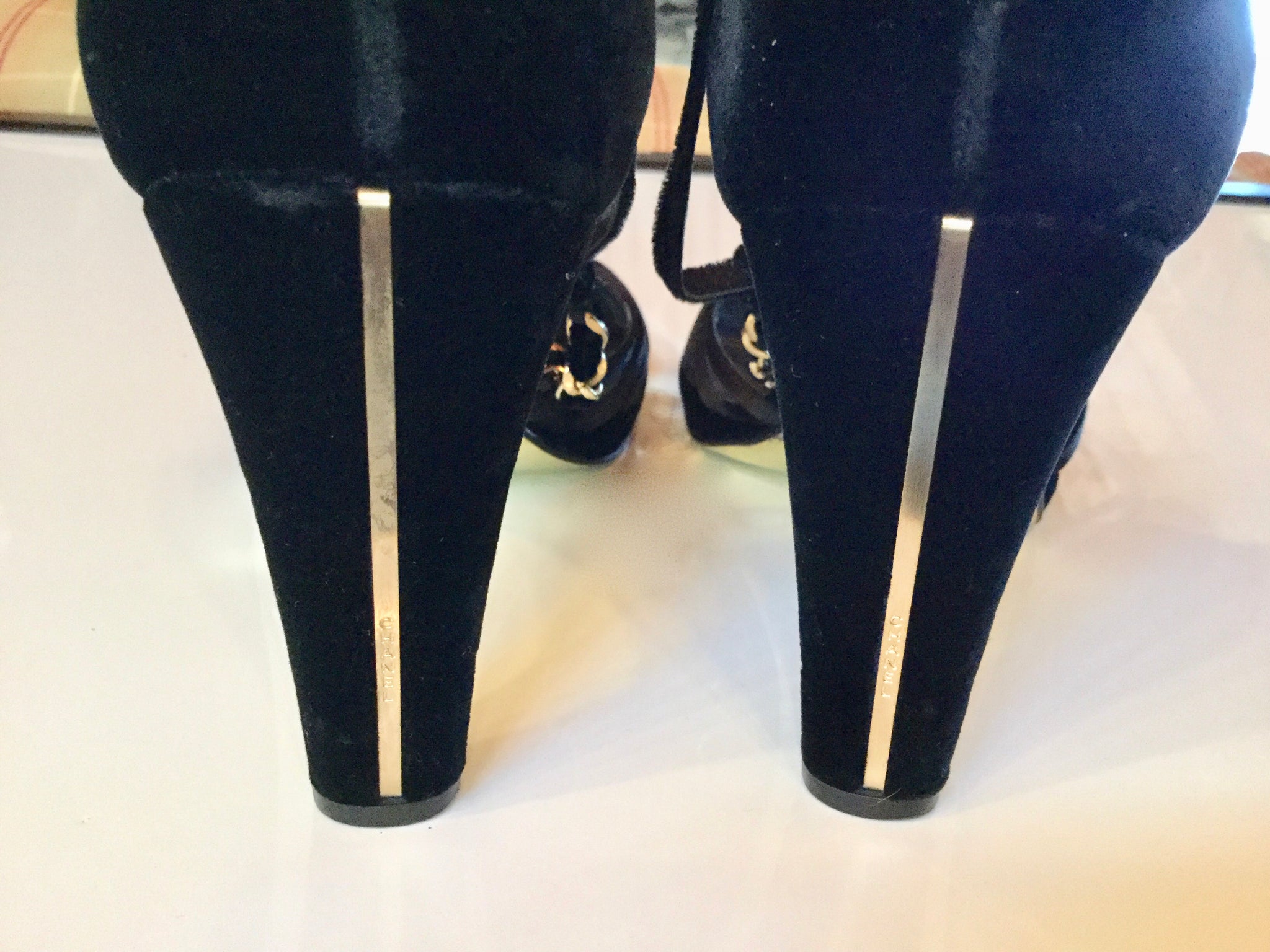 Chanel ankle strap heels in black velvet with Camellia Flower. Gold “CC” on one petal of the camellia flower on each shoe. The heel is also velvet with a gold metal strip with “Chanel” engraved down the middle. A gold chain woven with black velvet, attaches the flower to the ankle strap.