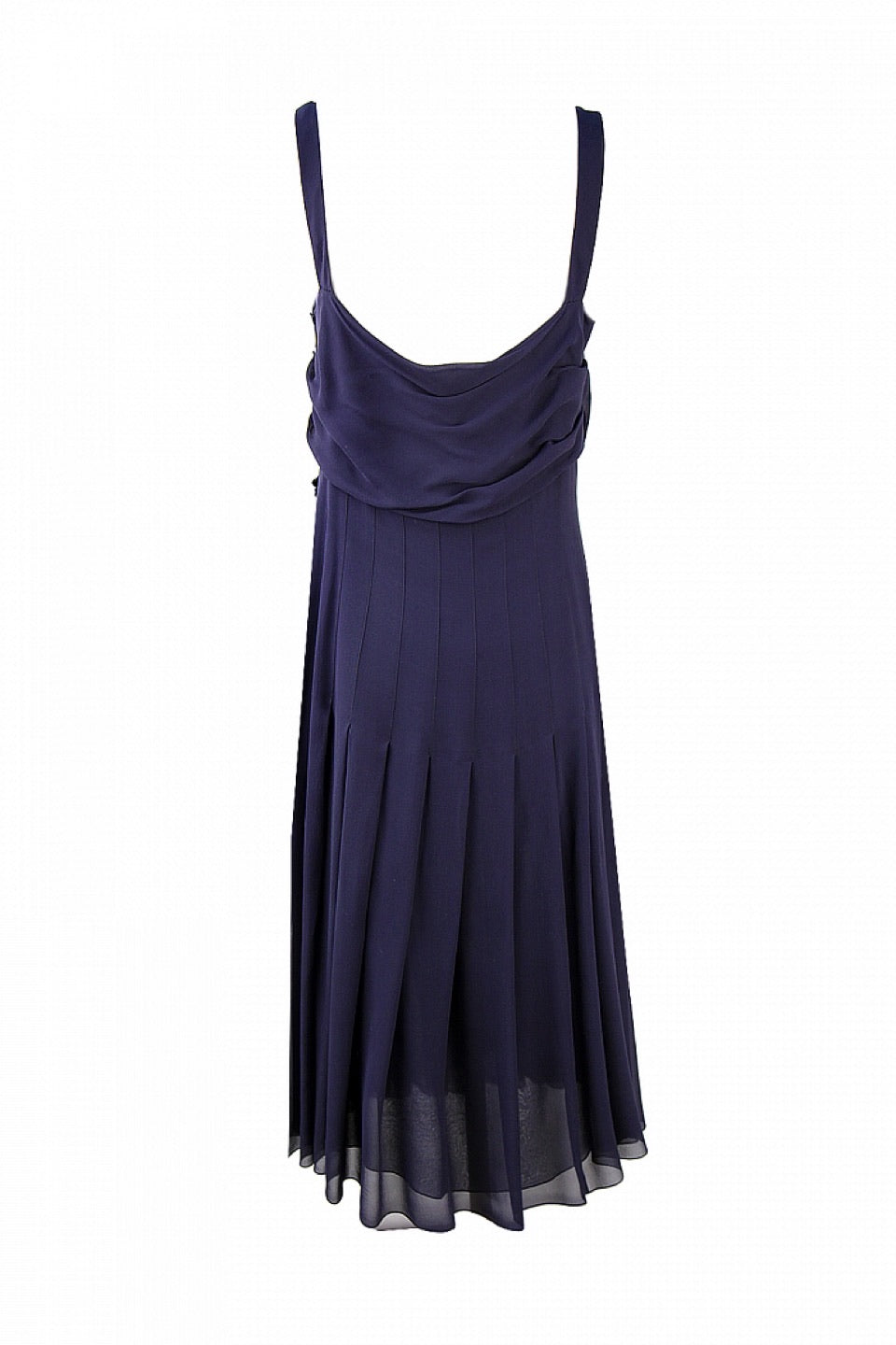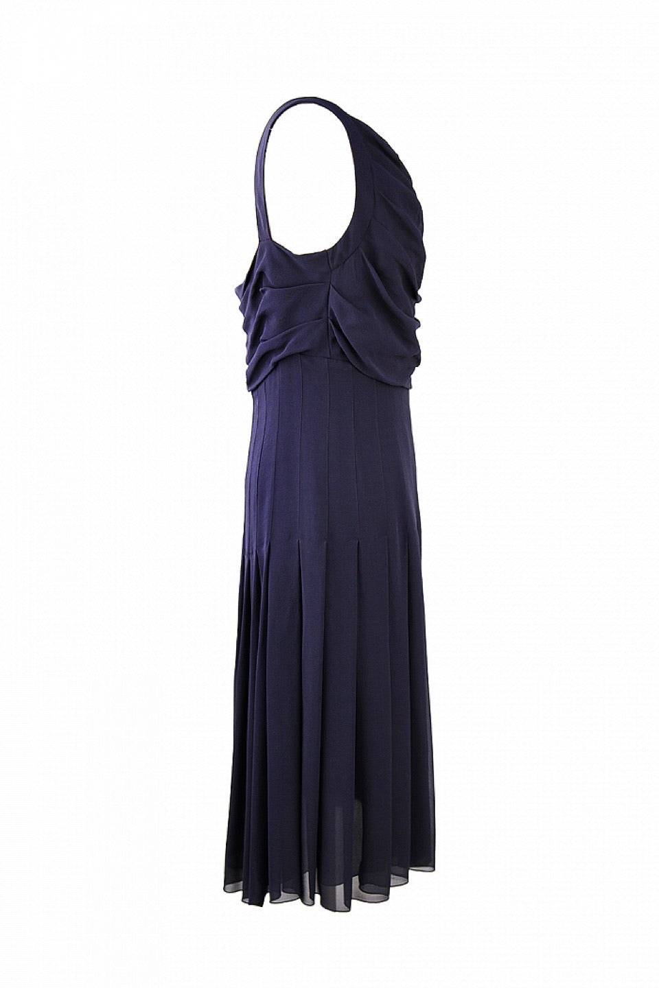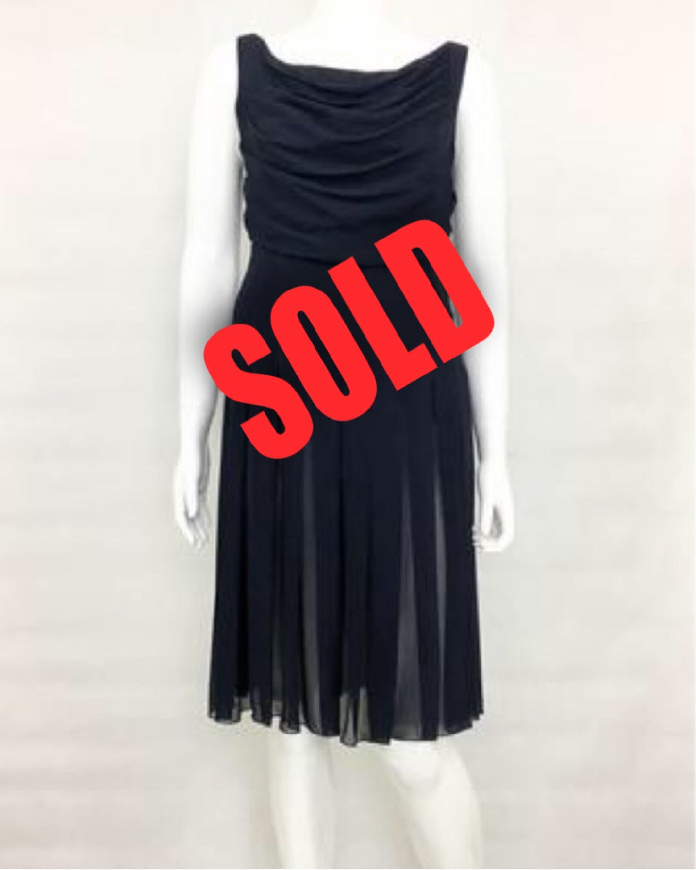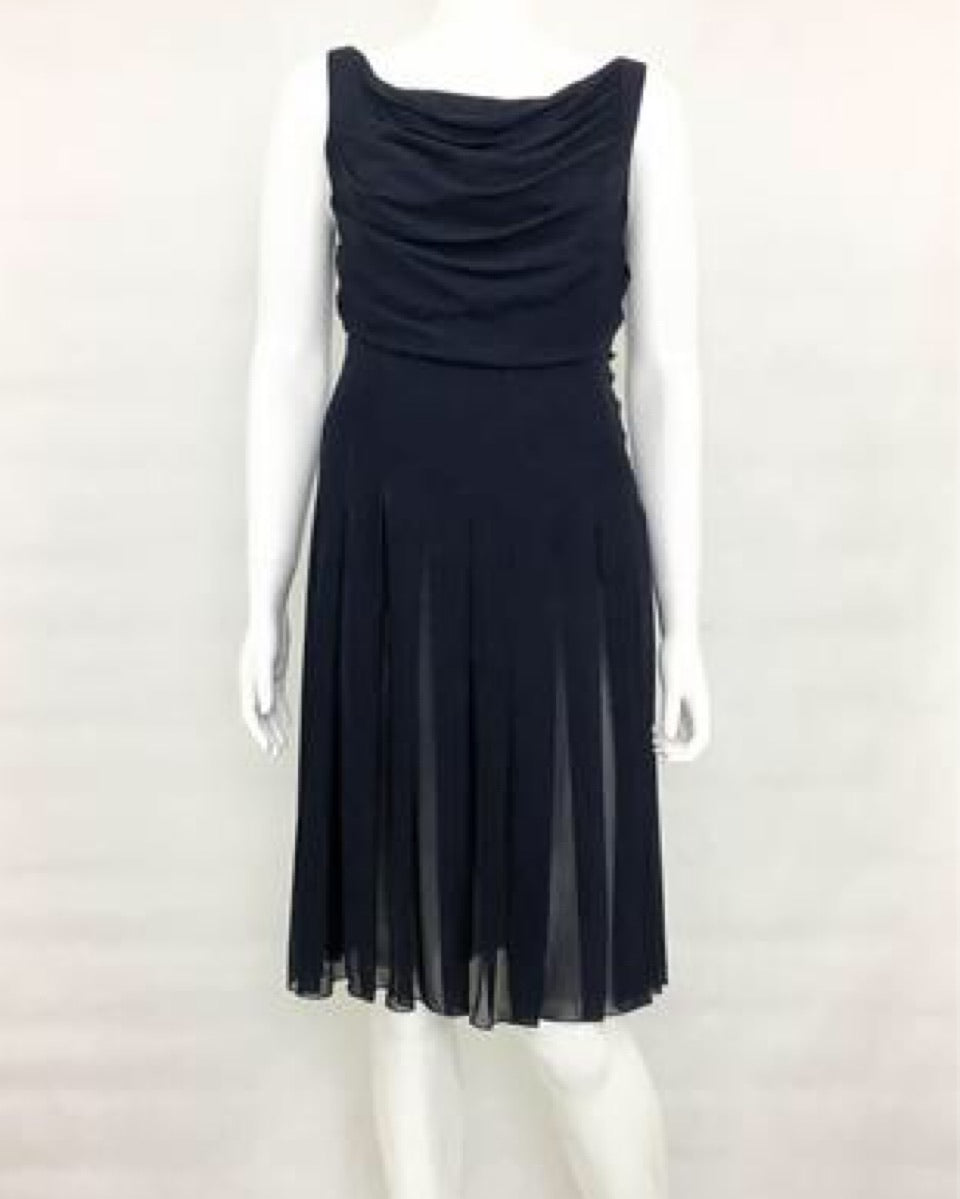 This Black vintage classic and timeless dress is from Chanel 00S Collection. It has a draped neckline and a film pleated skirt. The First 9" of the pleats are sewn down for a perfect fit. Fully lined with black chiffon. There are 12 Chanel buttons up the left side for closure. Each button has a "CC" in the center. Shown with a Chanel necklace/belt, sold separately.