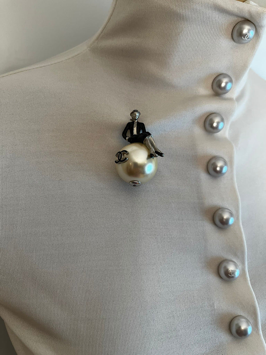 From the 04P, 2004 Spring Chanel collection. This previously owned Chanel pin displays a large faux pearl with a tiny Coco Chanel figurine perched on top. Pin backing.