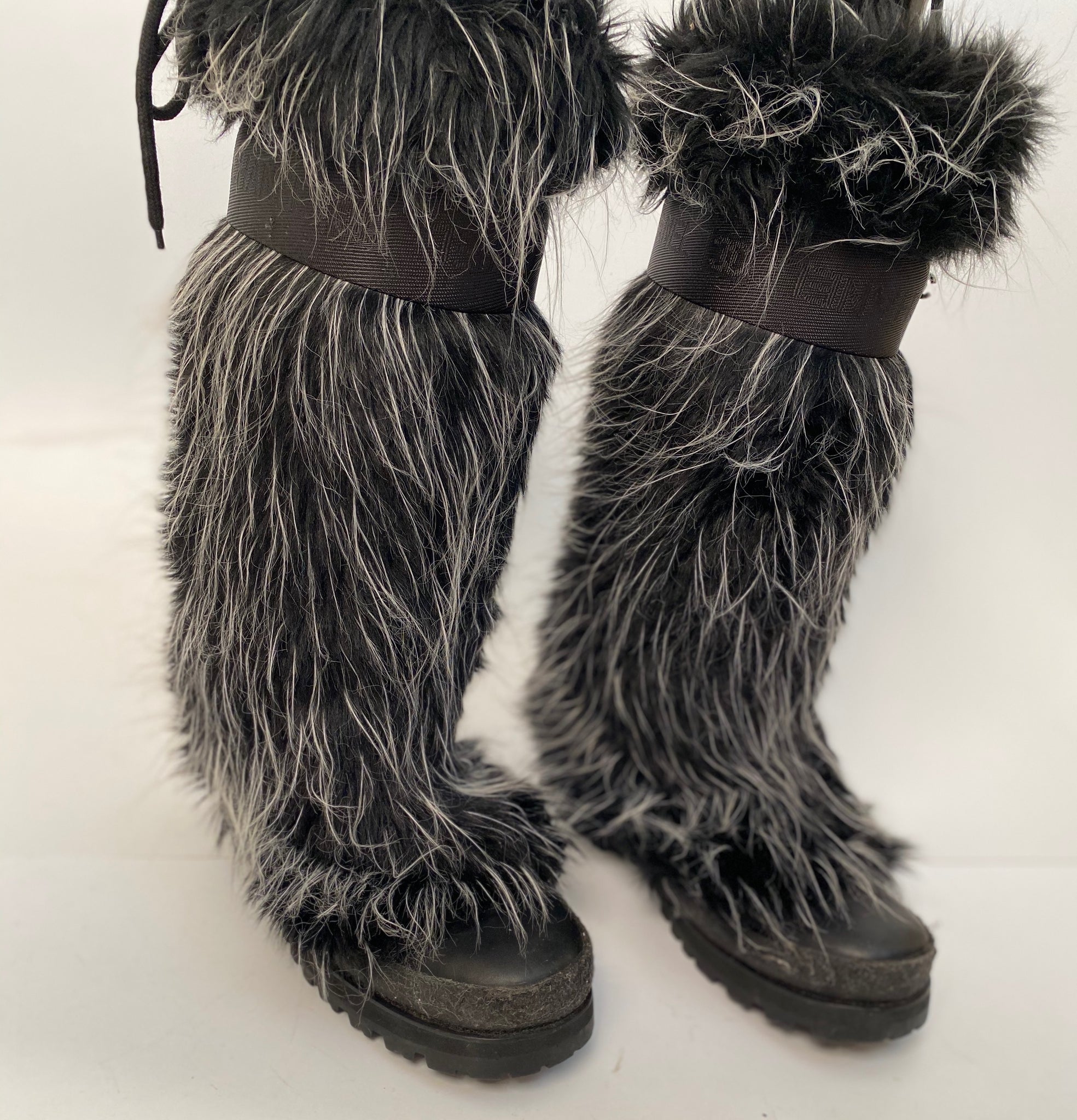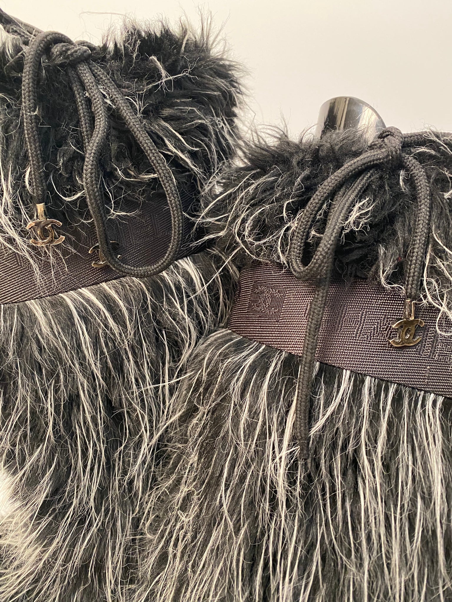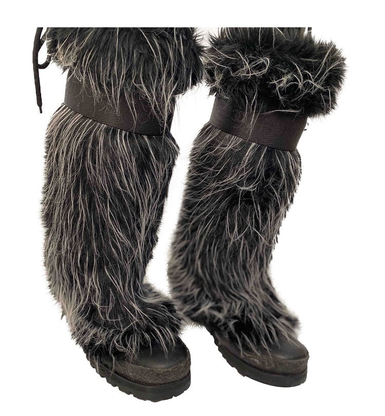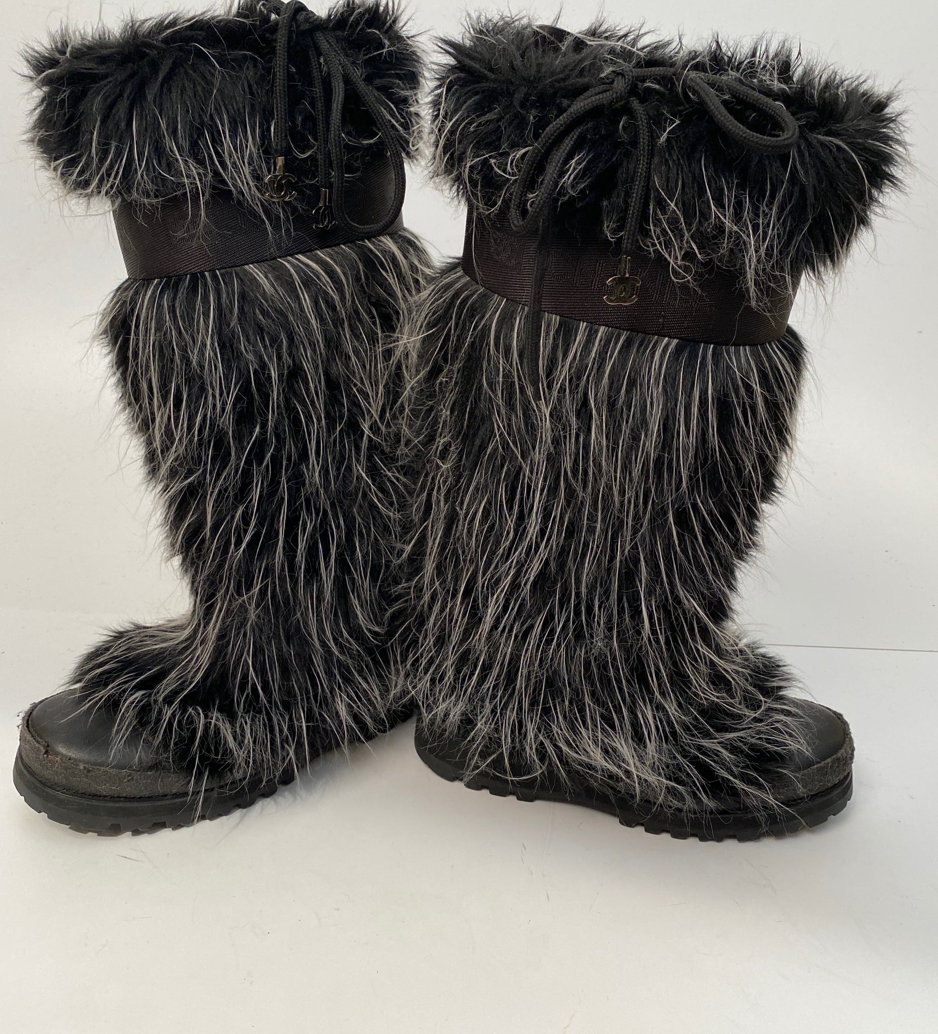 Extremely Rare! Chanel vintage 2002 Fantasy Fur Yeti gray knee high snow boots US size 7/7.5. These are super lightweight, soft wool lined with leather insoles. The bottoms are like snow boots with a “CC” on the bottom. These feature alternating “chanel” and “CC” around the band at the top which is 1 3/4” wide, there is a drawstring to tighten the top, the 3 drawstrings have a metal “CC” logo Each 5/8” across (one drawstring missing a CC).