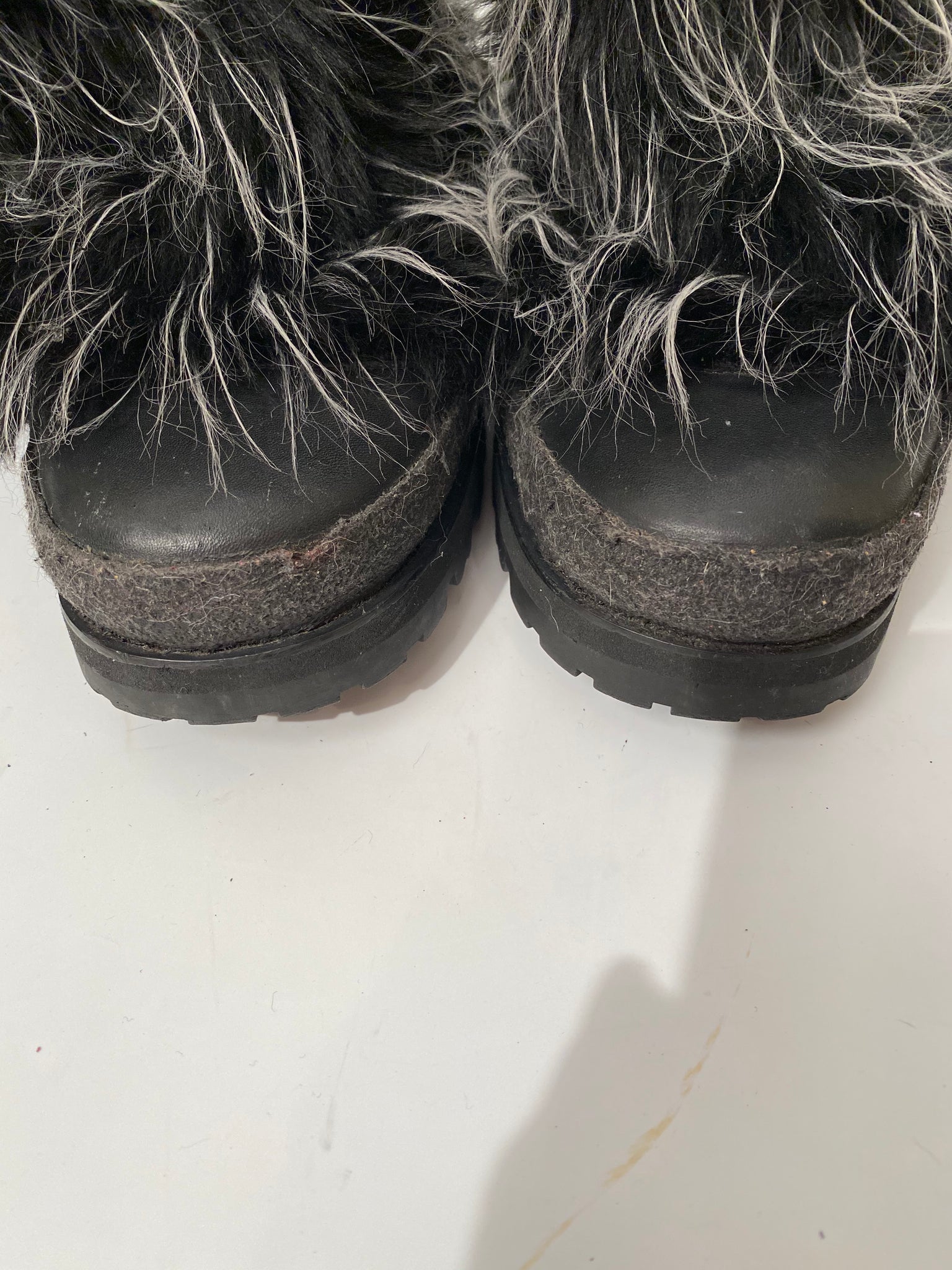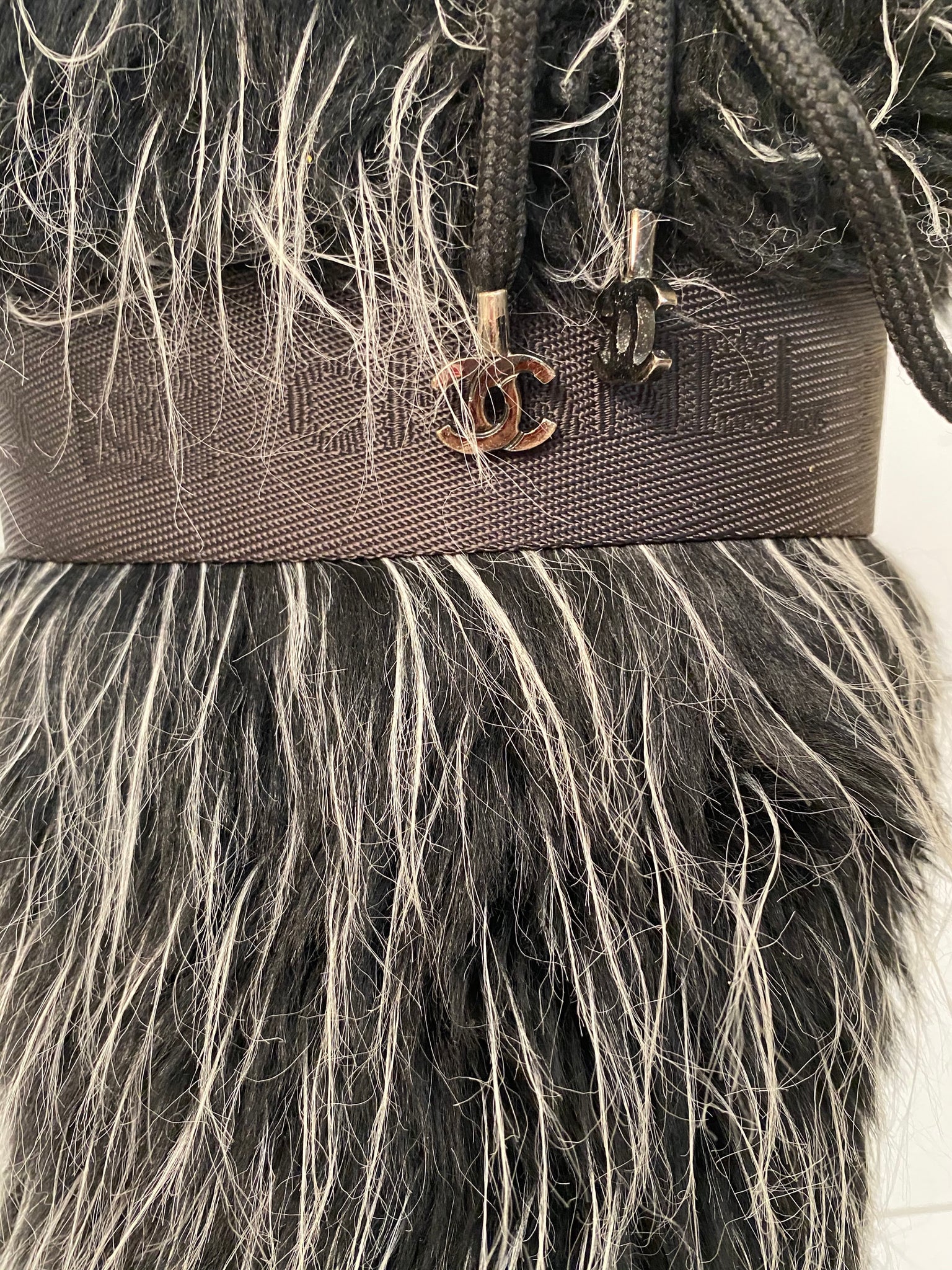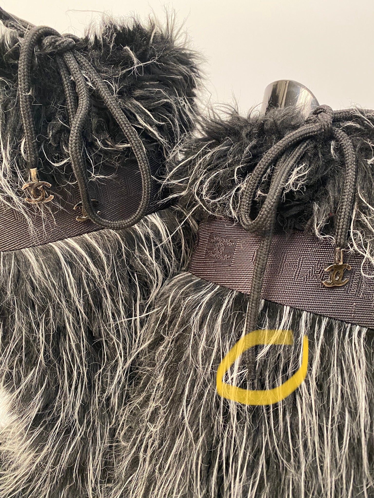 Extremely Rare! Chanel vintage 2002 Fantasy Fur Yeti gray knee high snow boots US size 7/7.5. These are super lightweight, soft wool lined with leather insoles. The bottoms are like snow boots with a “CC” on the bottom. These feature alternating “chanel” and “CC” around the band at the top which is 1 3/4” wide, there is a drawstring to tighten the top, the 3 drawstrings have a metal “CC” logo Each 5/8” across (one drawstring missing a CC).