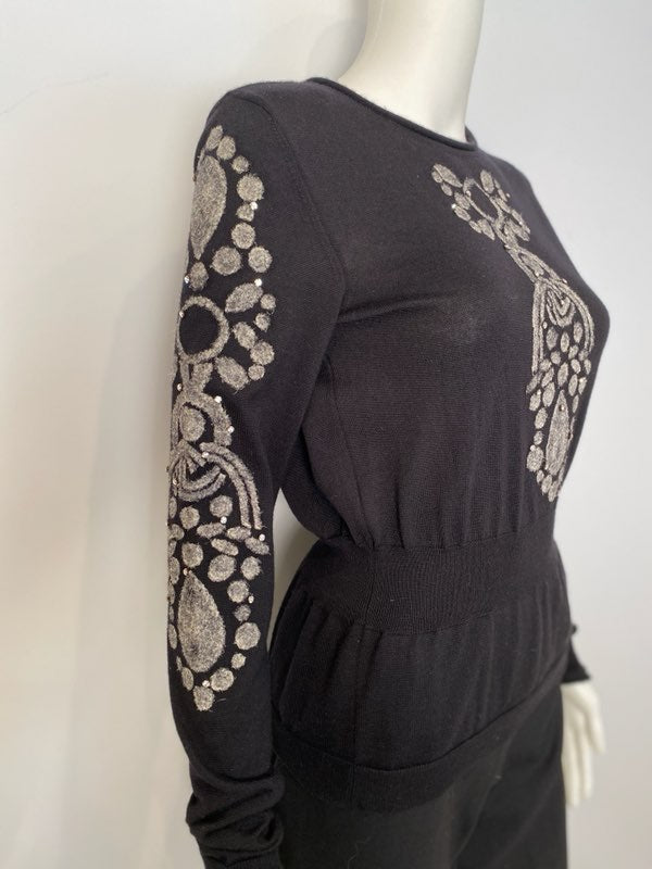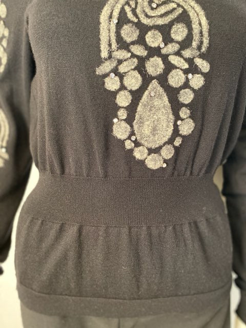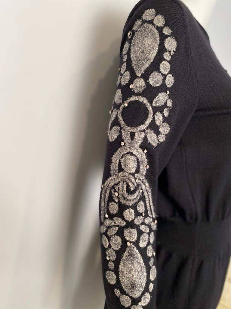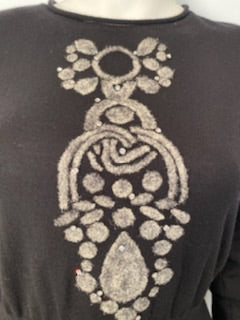 Chanel embellished gray and black cashmere tunic sweater from 07A, 2007 Fall collection. This sweater has an elasticized waist that is soft black with large elaborate geometric shorty fuzzy gray and crystal designs on the front, and up both arms. There is a black crystal Pin with a “CC” logo in the center.