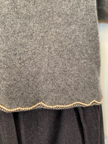 Vintage Chanel 98A, 1998 Fall Cashmere short sleeved Gray sweater with a unique pearl and chain hem.