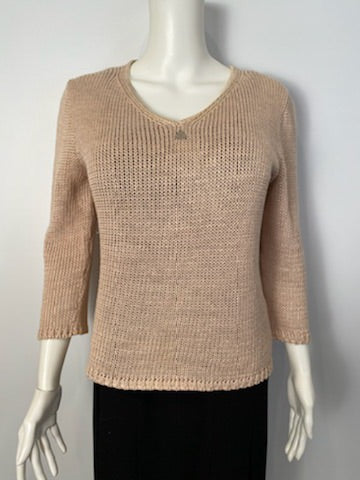 Vintage Chanel Identification 00C, 2000 Cruise Resort Summer Collection V Neck Beige Loose knit casual pullover sweater. There is a metal triangle at the bottom of the V Neck which says “Chanel Paris”.