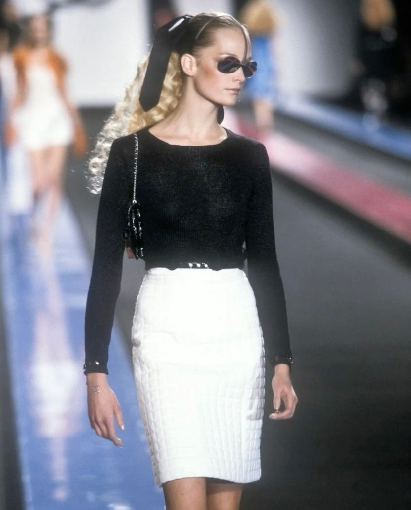 Shown with Chanel slacks/long pants, and a Chanel necklace, sold under “Shop All”.