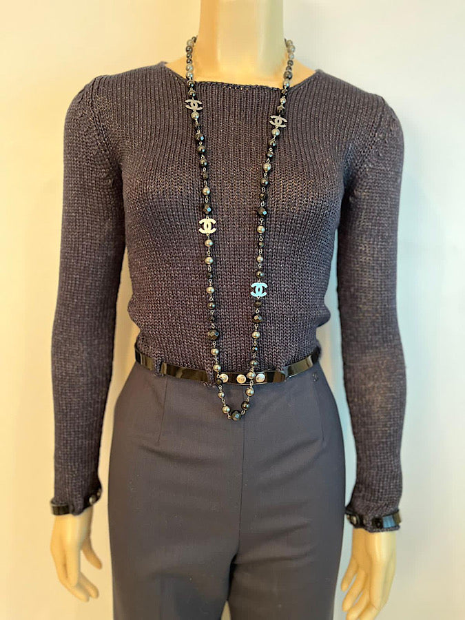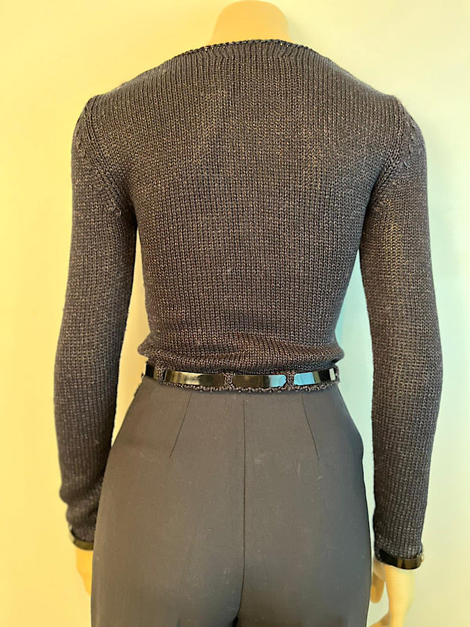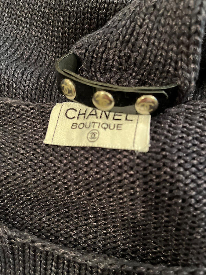 Vintage Chanel Boutique black sweater with removable patent leather belt around the bottom and wrists.