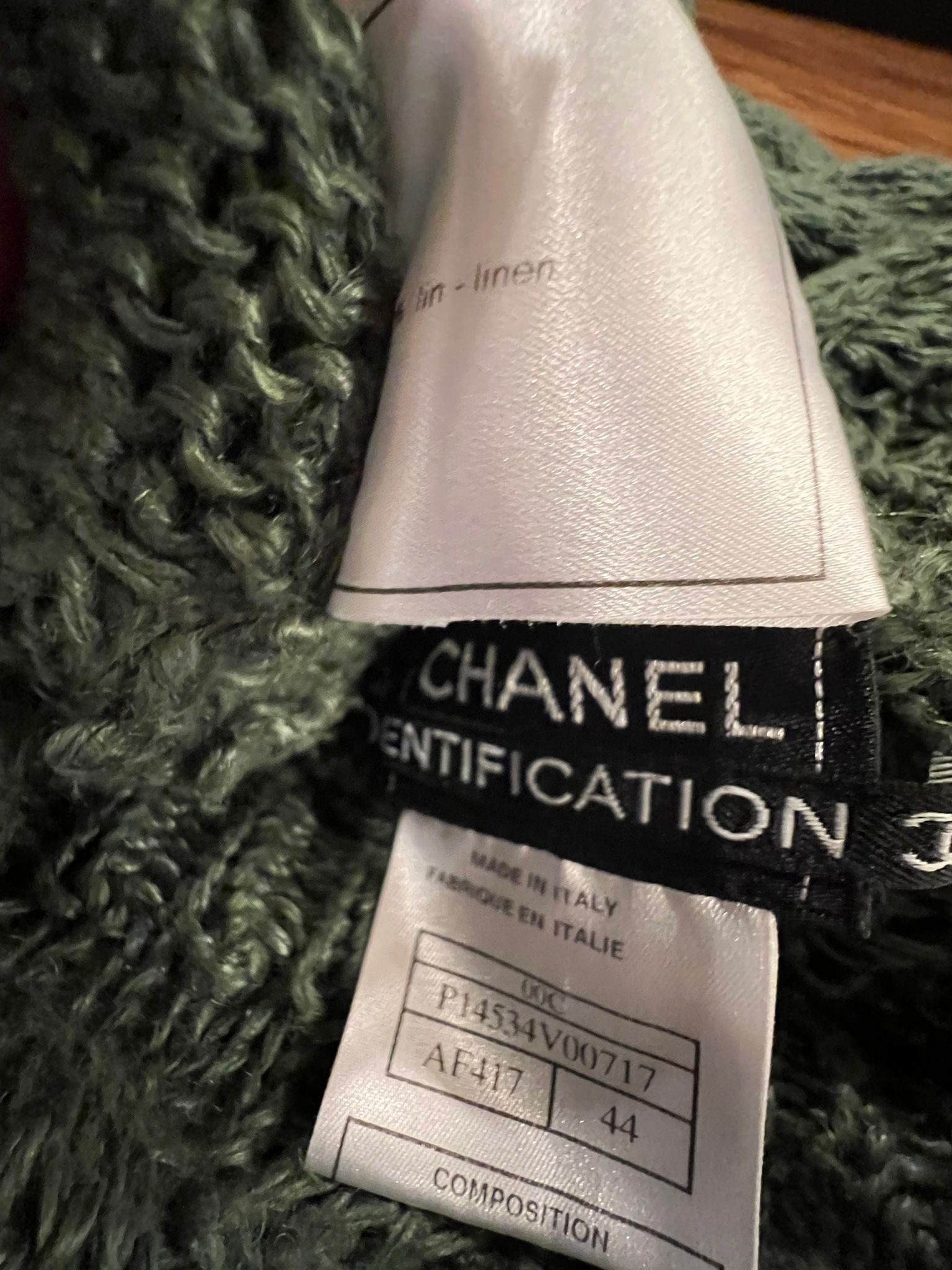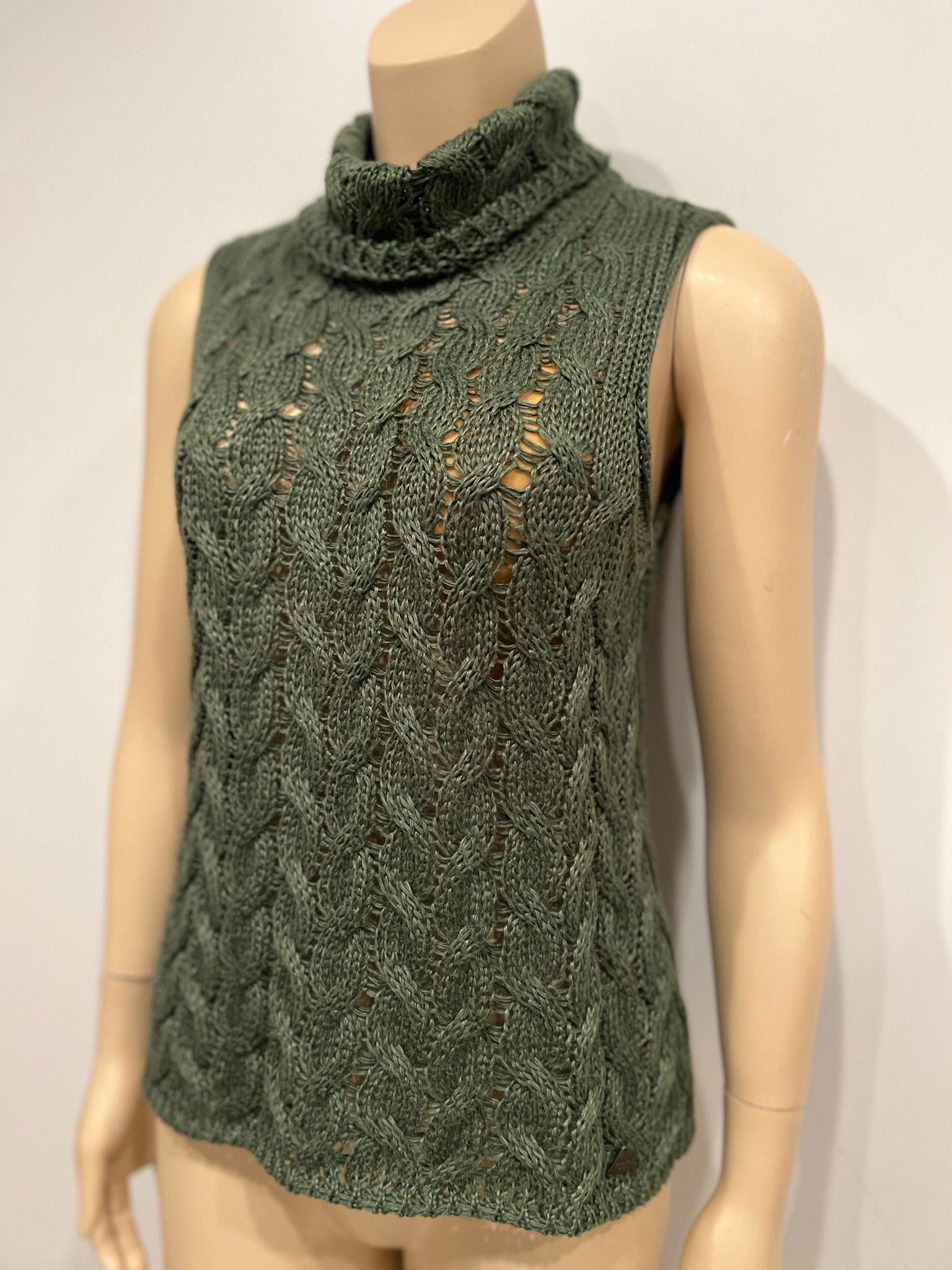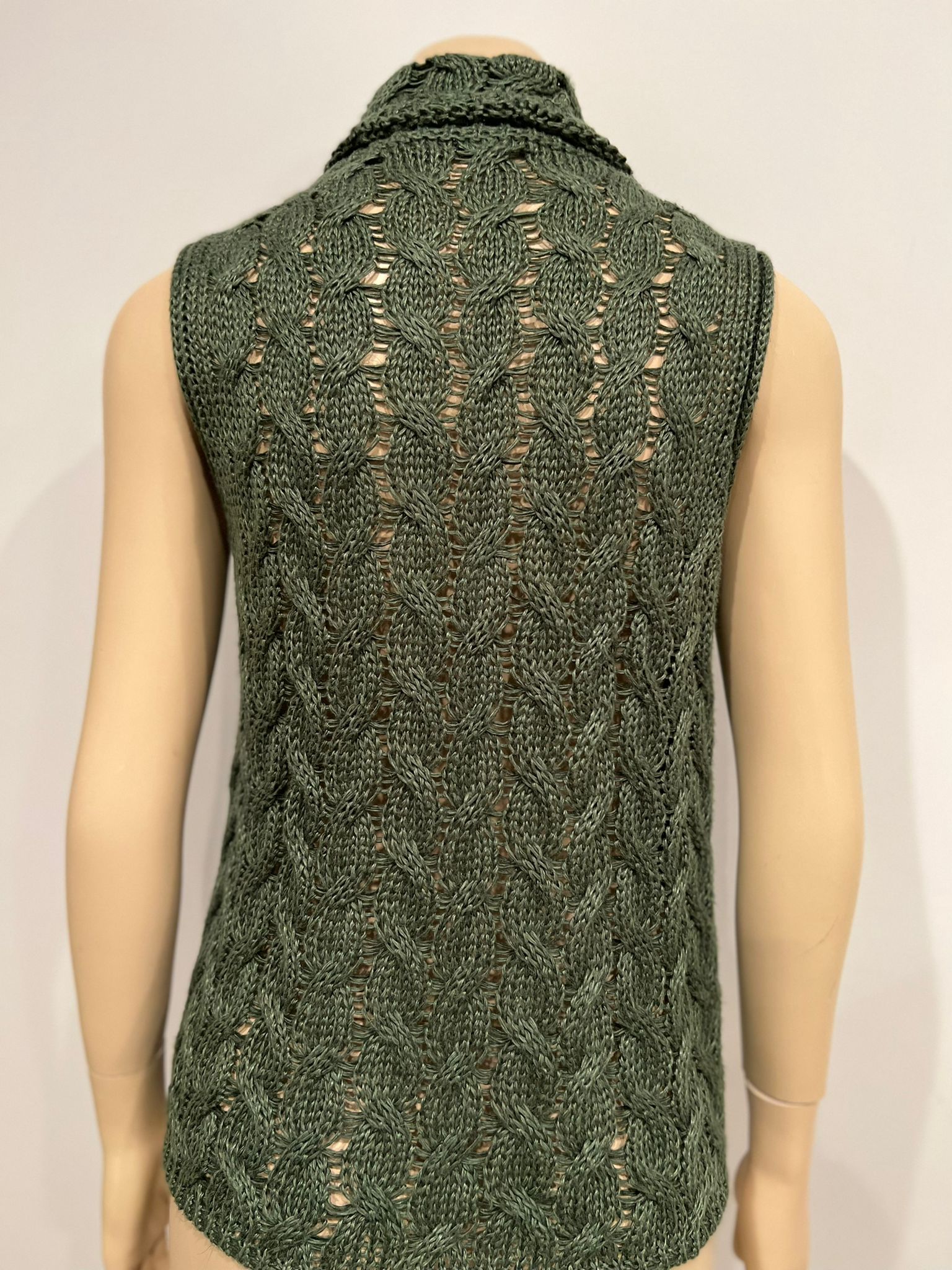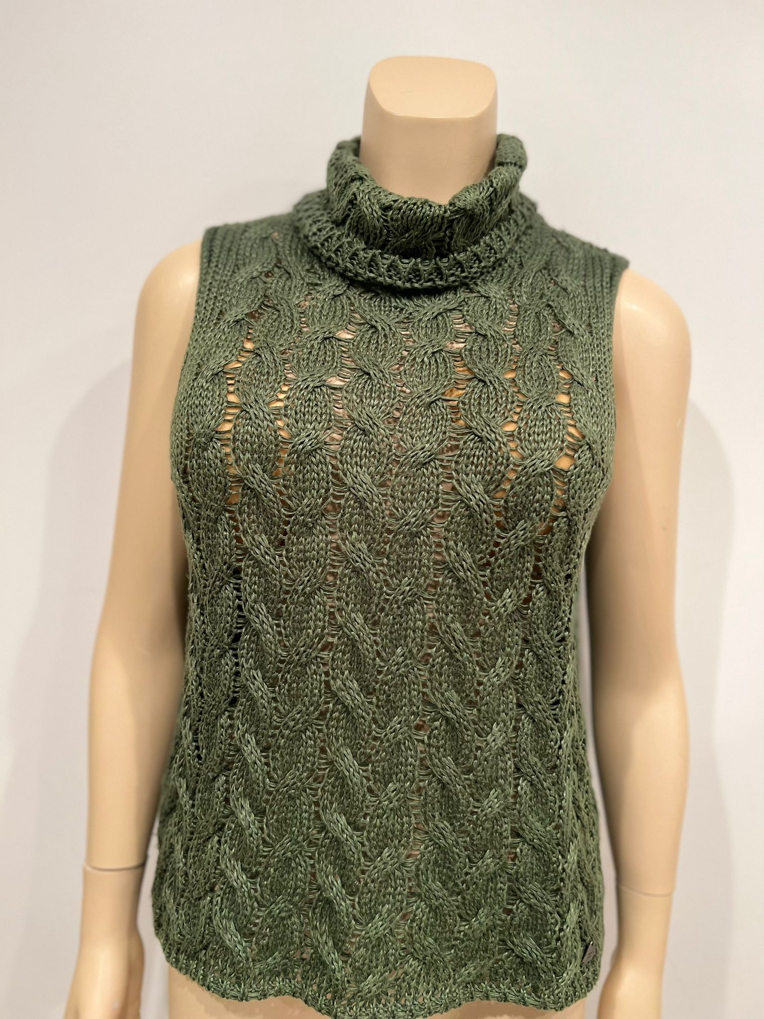 Casual Chanel olive green turtleneck, linen yarn knit sleeveless, open cable knit. Great for Fall.