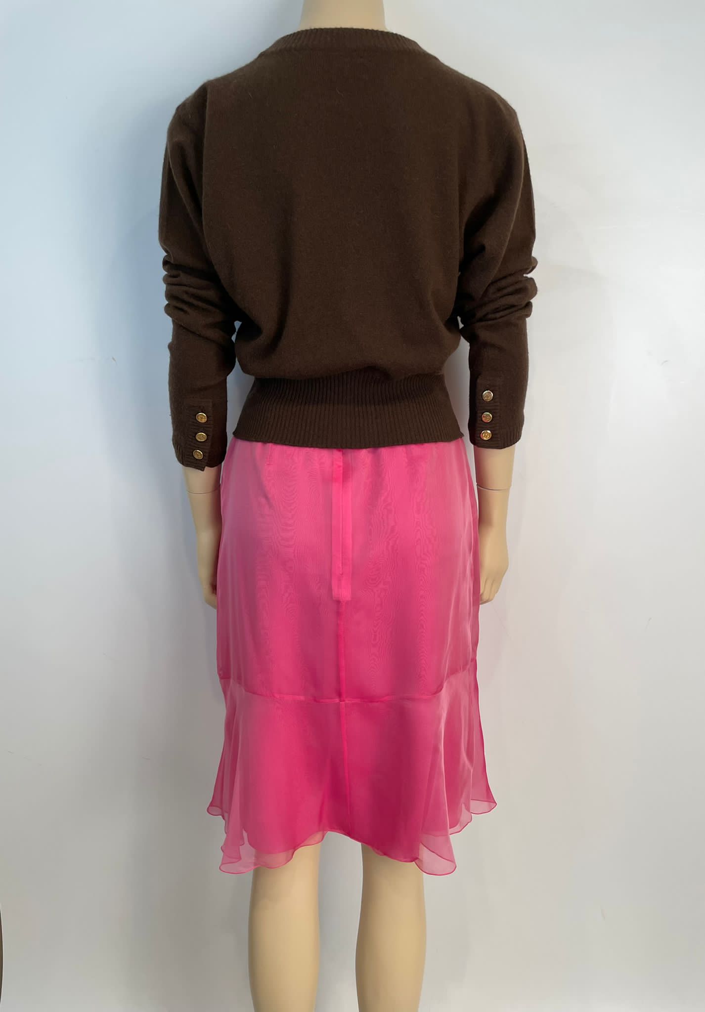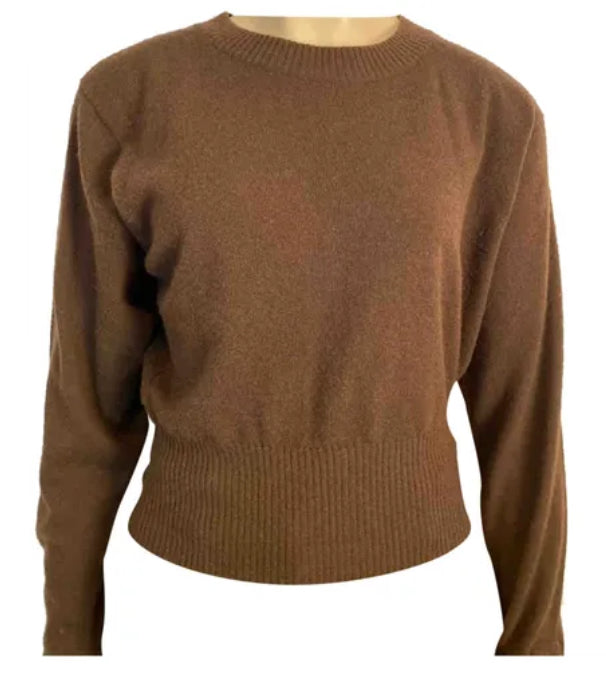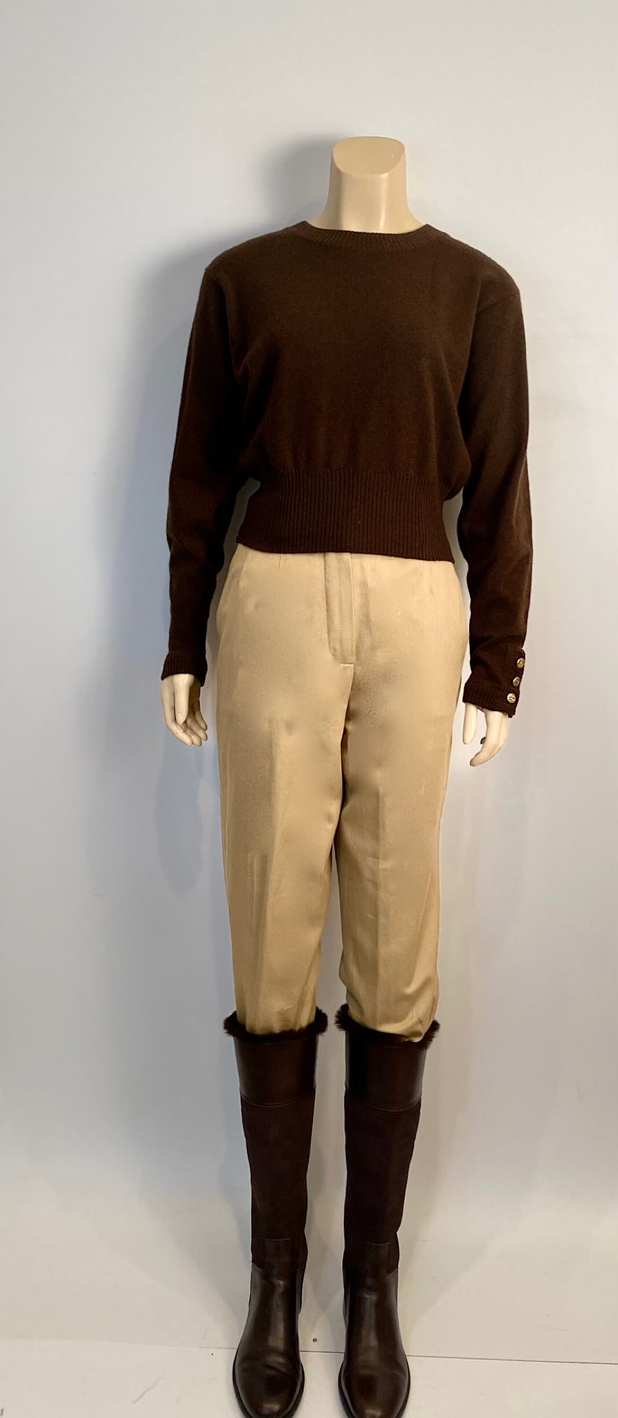 Chanel cashmere pullover sweater in dark brown. There are 6 Chanel buttons, Each sleeve has 3 working Chanel gold logo buttons on each wrist. The bottom 4" is ribbing so it is a flattering fit.