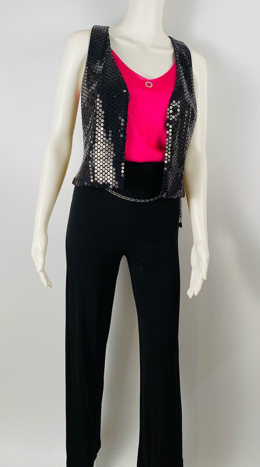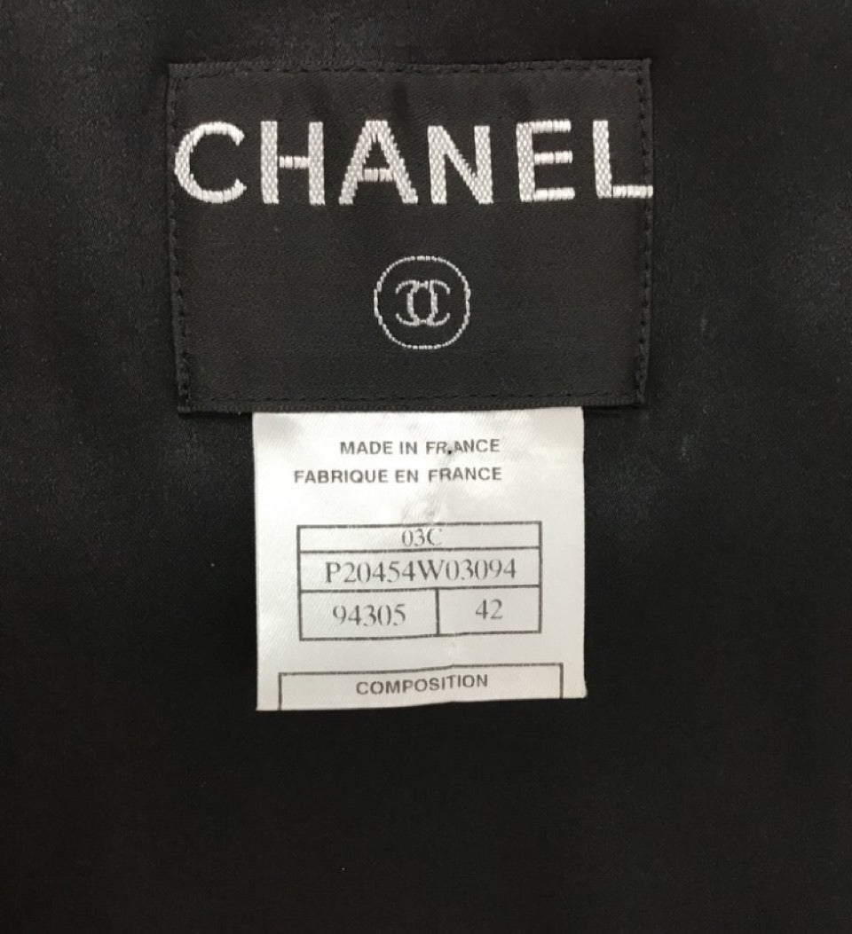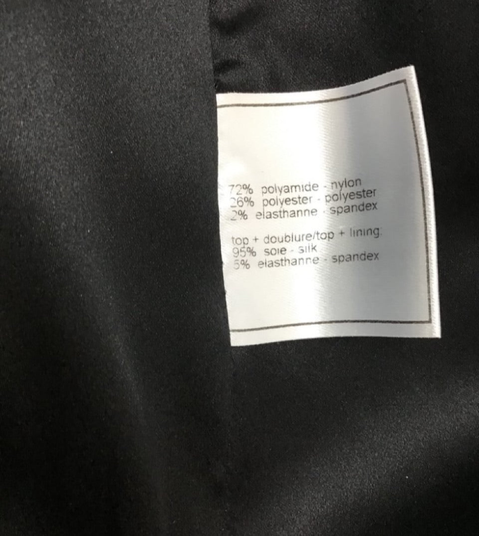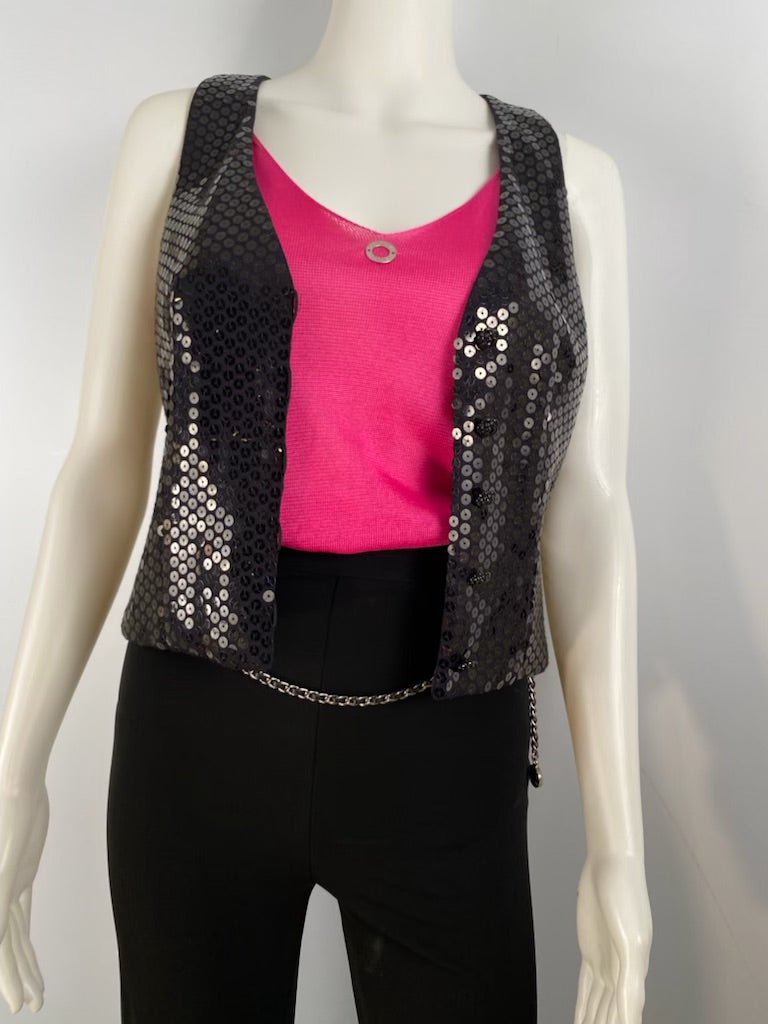 Chanel 03C, 2003 Cruise Resort Sequin Silk Charmeuse Vest. The front is all beautiful black round sequins, with 5 shiny black Chanel camellia buttons for closure. The back is black satin, it has a half belt in the back so you can adjust the fit . The word "Chanel" is on the buckle in the back. Fully lined with satin and 5% spandex.